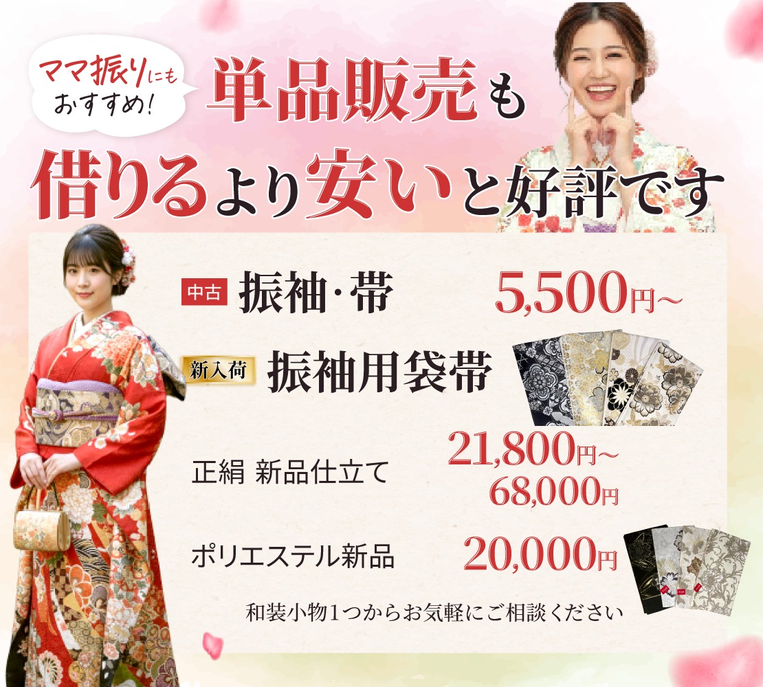 熊本店では、お仕立て前の振袖のフルオーダーセット・お仕立て前の帯など、