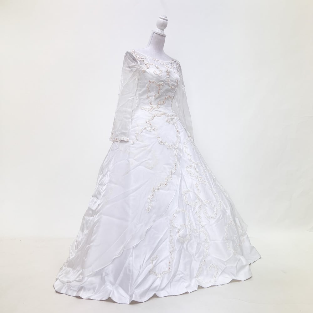 ウェディングドレス 9号T 長袖 中古 Aライン オフホワイト 結婚式 前撮り フォト婚衣装 W-296