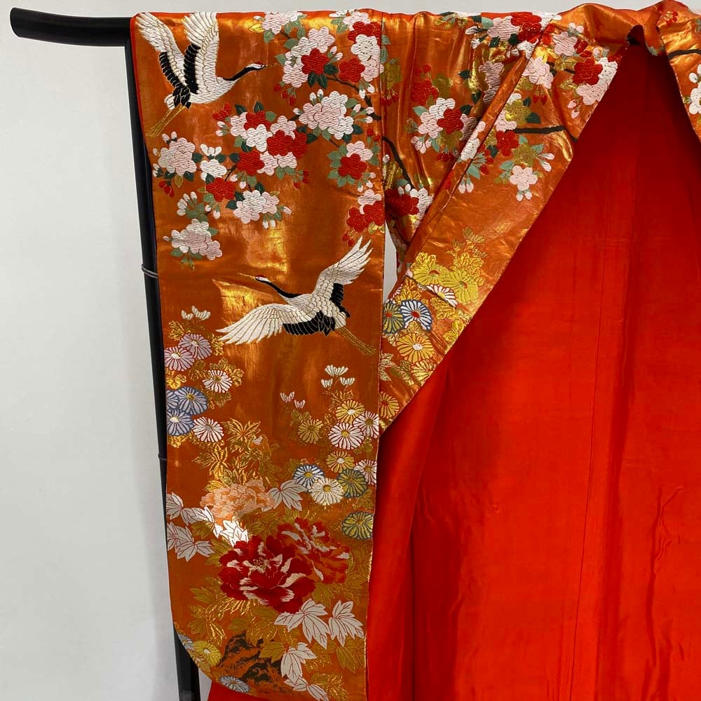 色打掛 正絹 鶴 刺繍 オレンジ 金 打掛 Lサイズ 裄67 花嫁衣裳 婚礼 リサイクル 中古 ブライダル ウエディング 着物 3962
