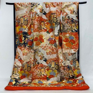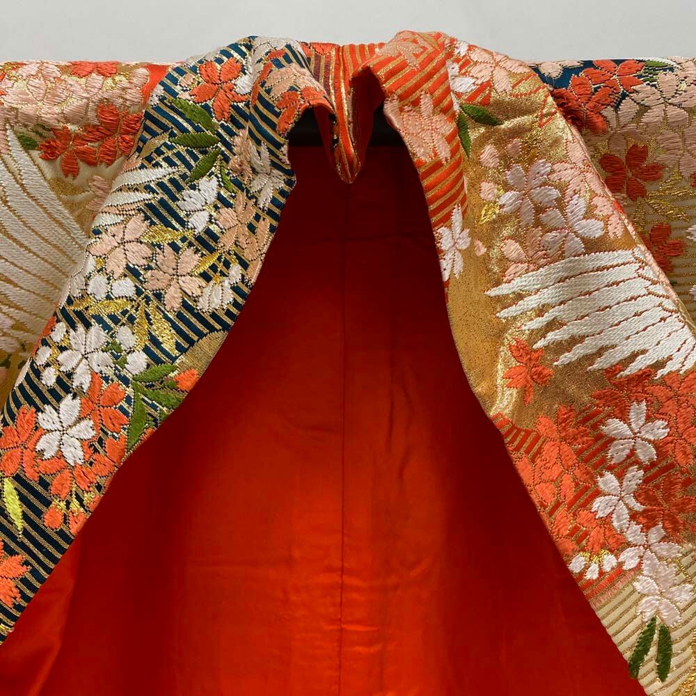 色打掛 正絹 鶴 刺繍 金 打掛 Mサイズ 裄66.5 花嫁衣裳 婚礼 リサイクル 中古 ブライダル ウエディング 着物 3980