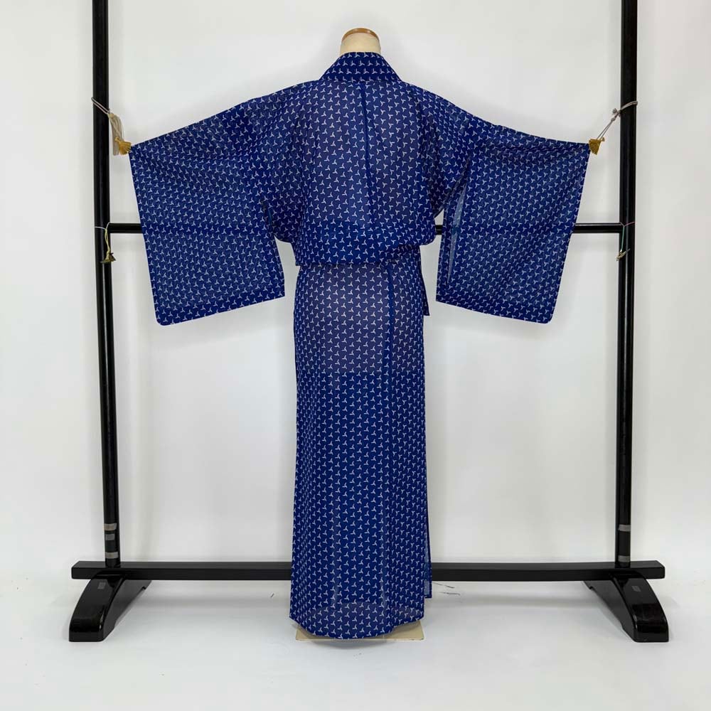小紋 夏 絽 夏用 洗える着物 裄62.7cm 身丈149cm 花柄 お洒落着 普段着 ポリエステル 青 美品 S サイズ 4332