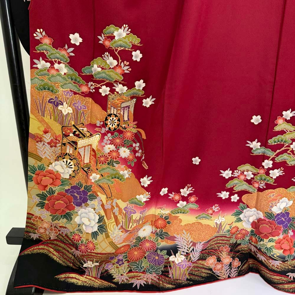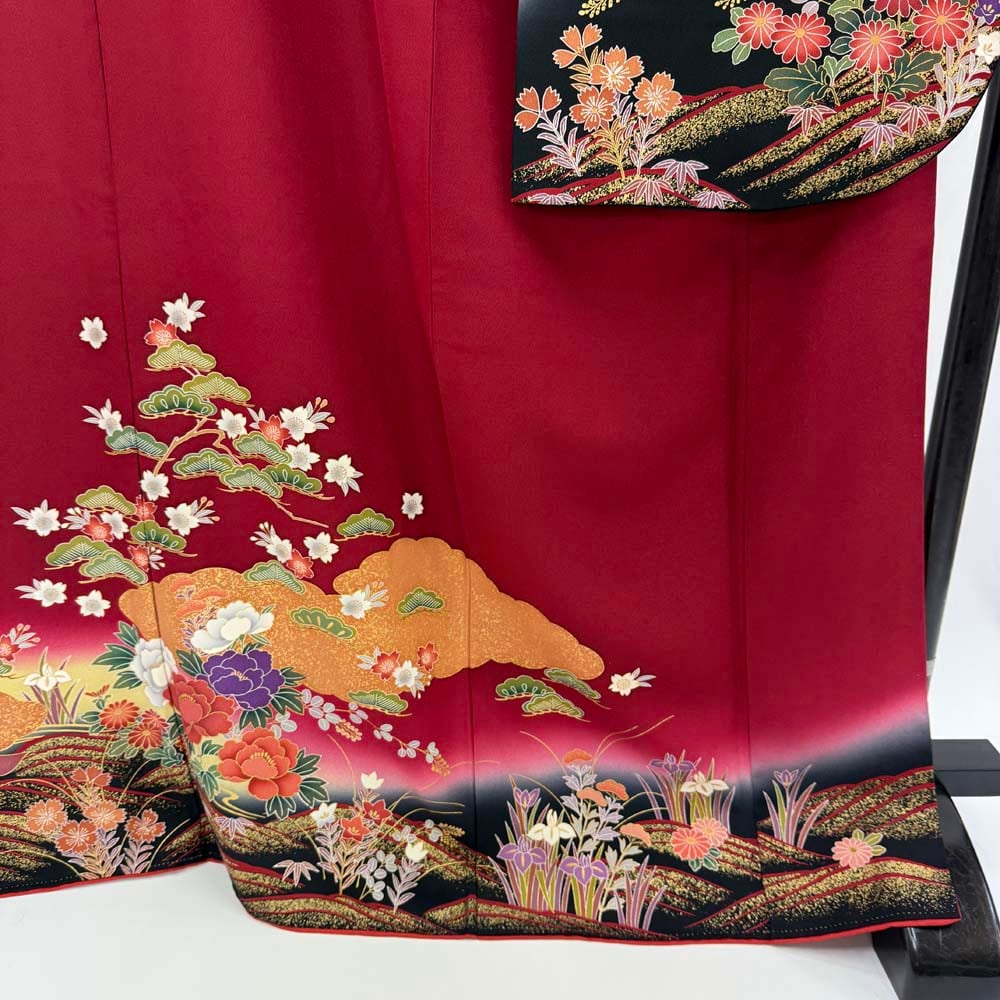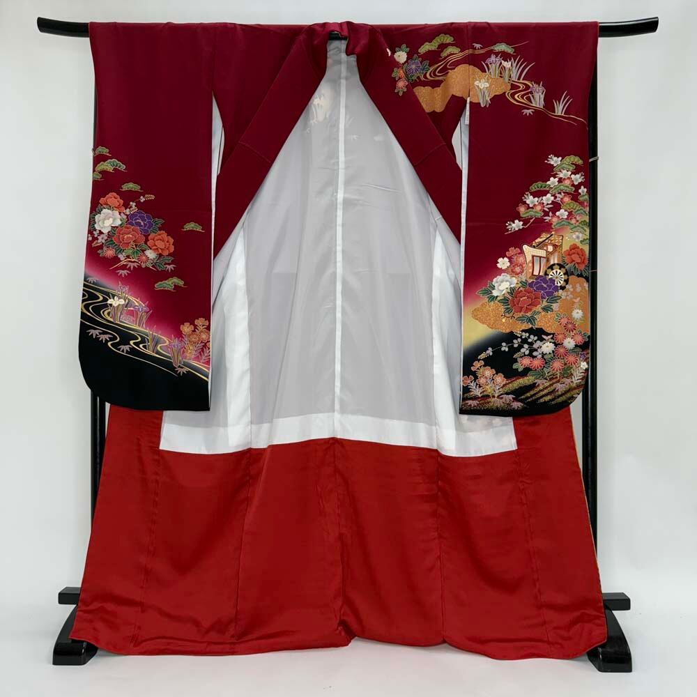 振袖 中古 エンジ 正絹 古典 裄67cm 身丈169.5cm 美品 L サイズ 成人式 4446