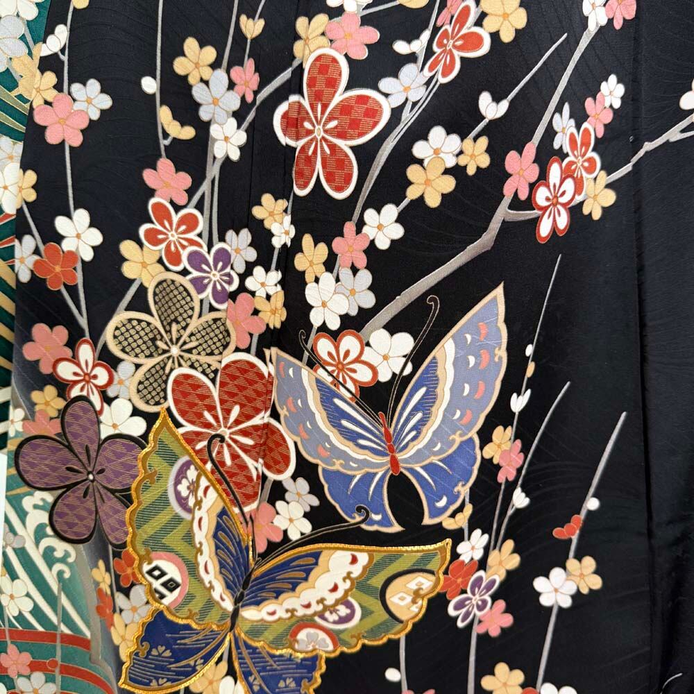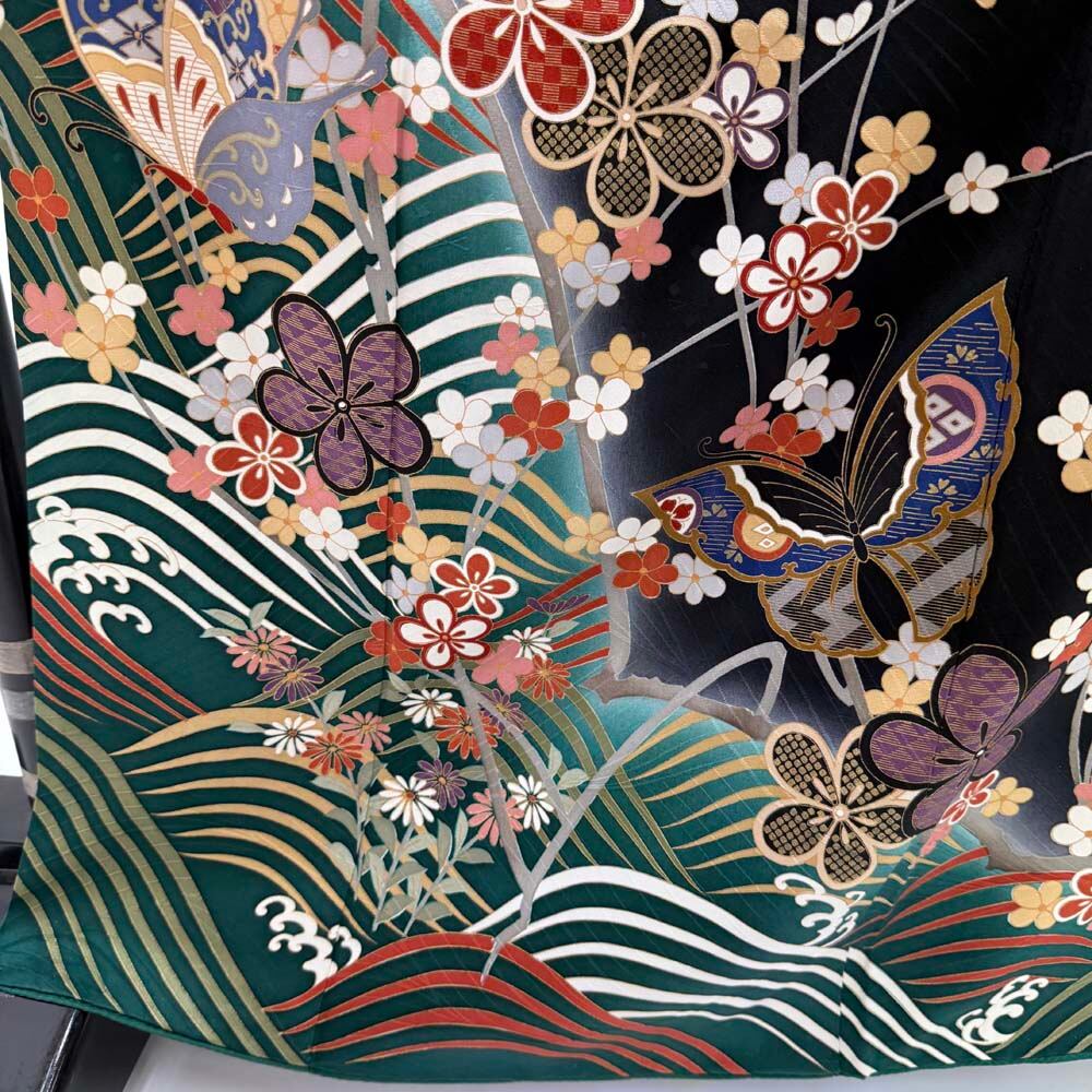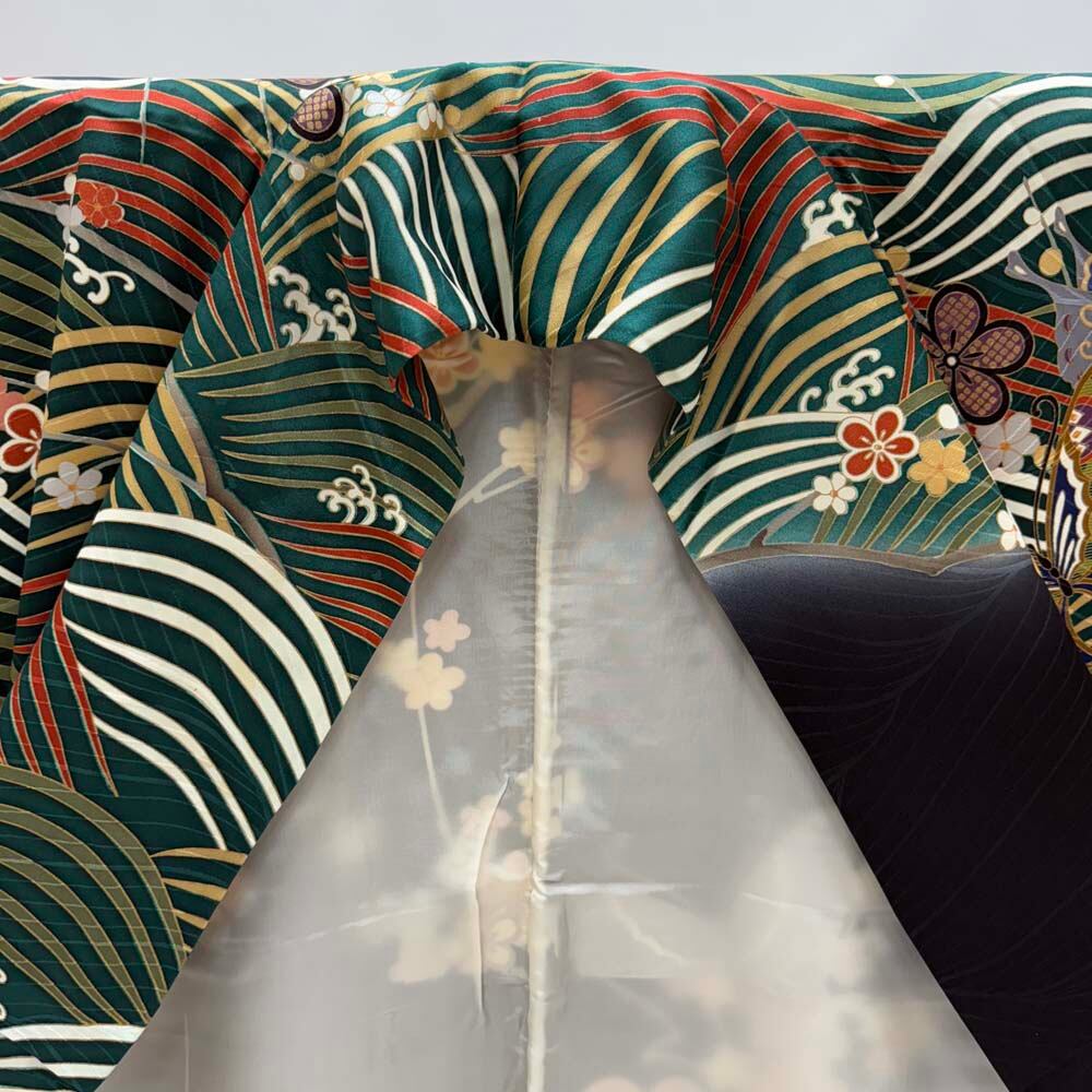 振袖 中古 緑 正絹 古典 裄65.3cm 身丈162cm 美品 M サイズ 成人式 4458