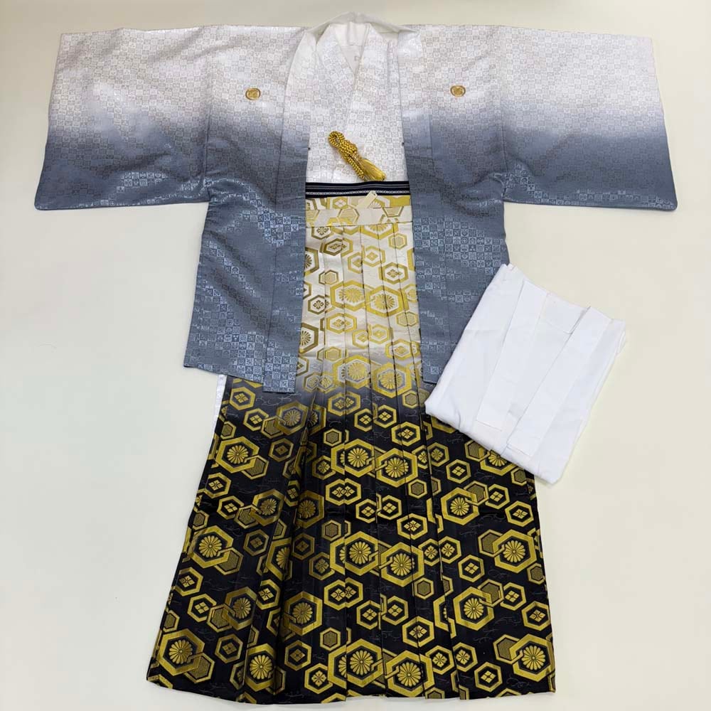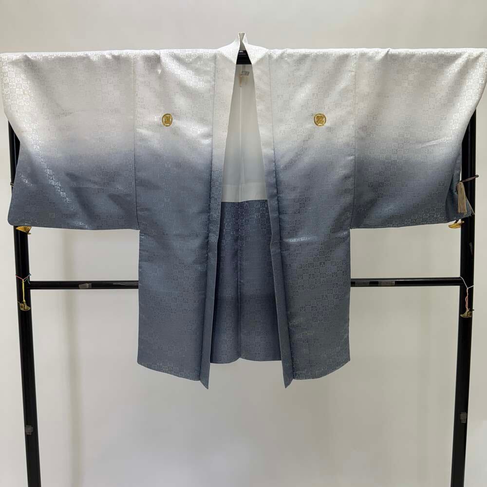 紋付袴 6点セット 着物 羽織 袴 長襦袢 羽織紐 角帯 裄71cm 袴丈89cm L 白 グレー 五つ紋 中古 4484