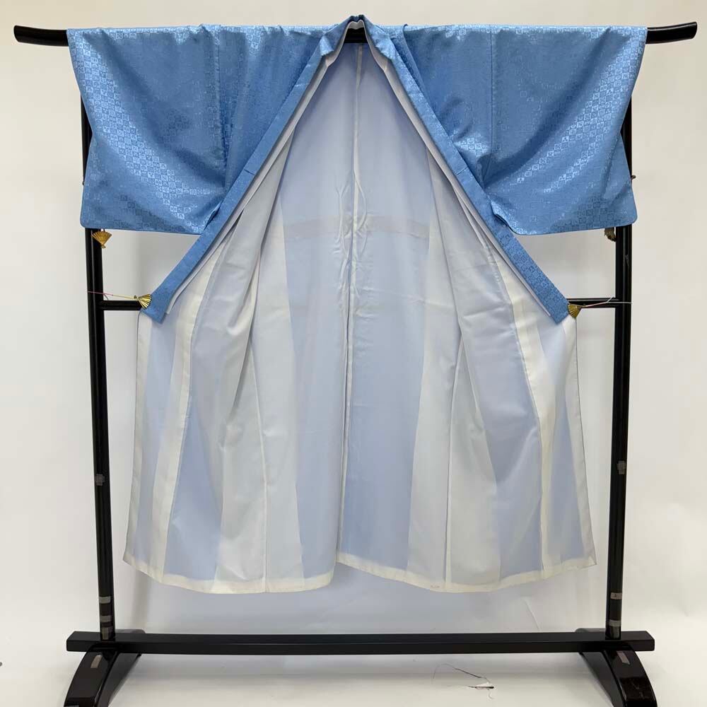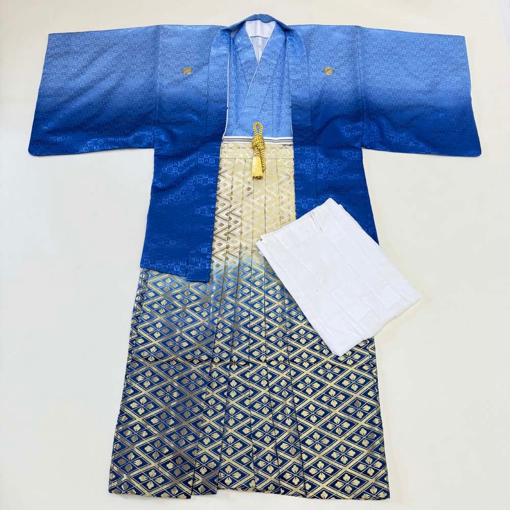 紋付袴 6点セット 着物 羽織 袴 長襦袢 羽織紐 角帯 裄71cm 袴丈89cm L 青 五つ紋 中古 4492