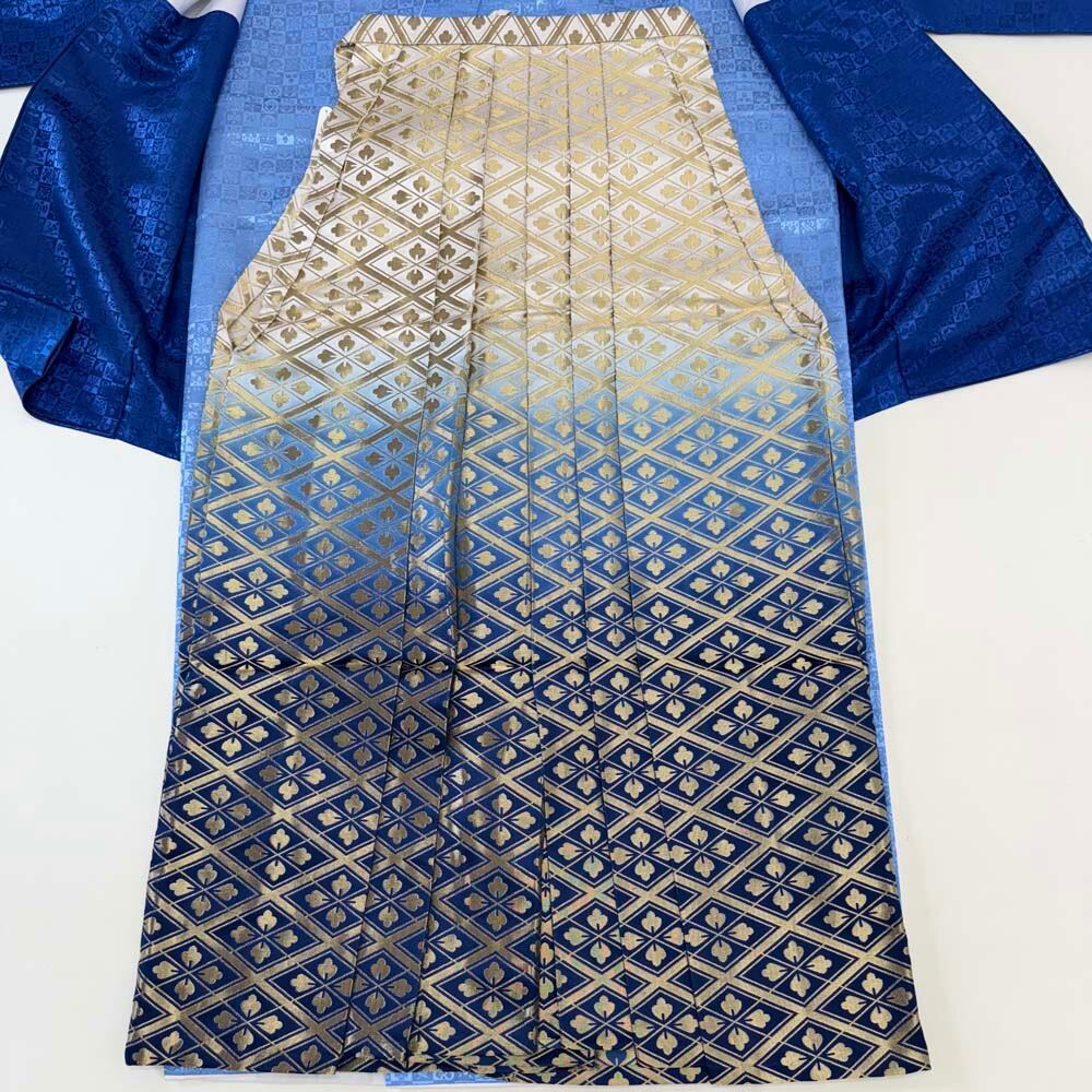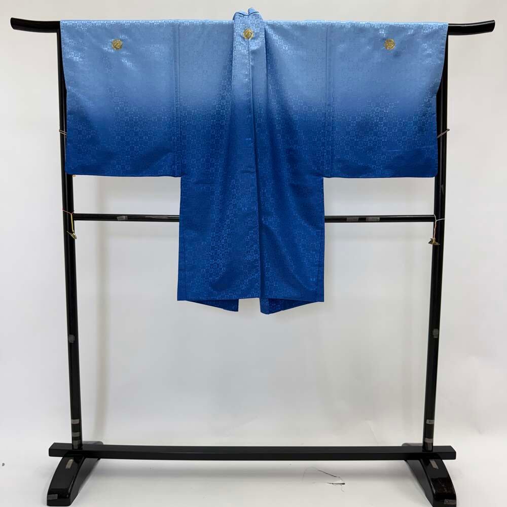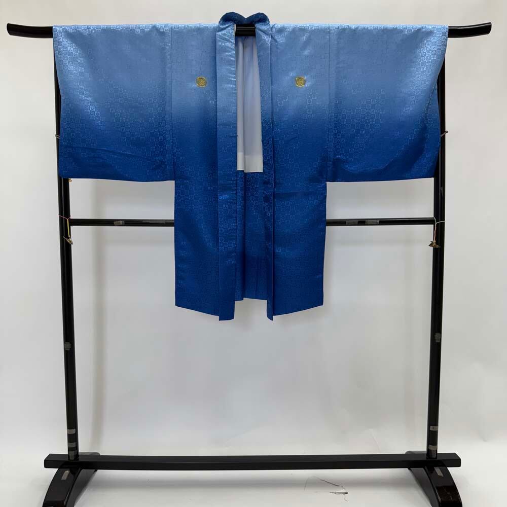 紋付袴 6点セット 着物 羽織 袴 長襦袢 羽織紐 角帯 裄73cm 袴丈91cm 2L 青 五つ紋 中古 4493