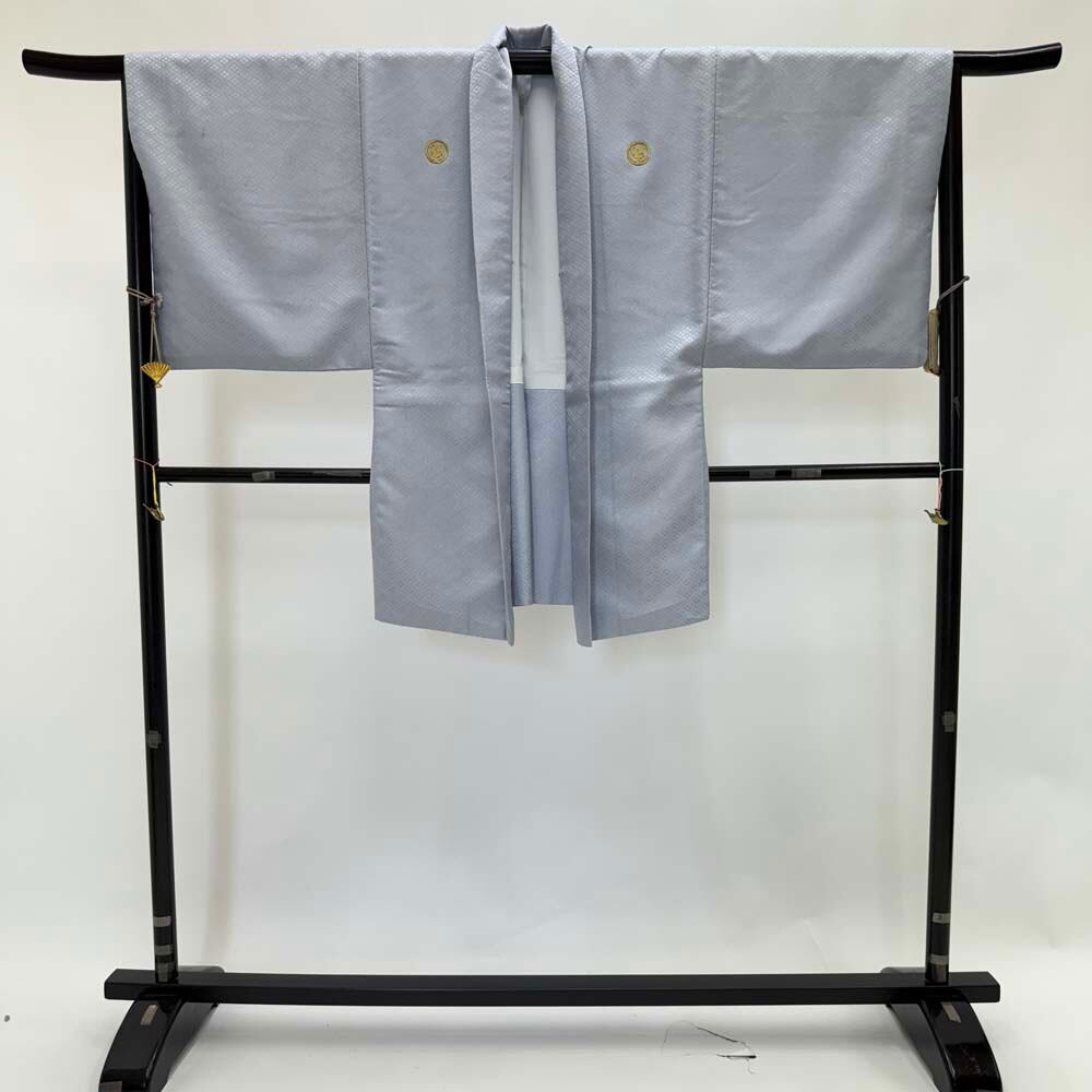紋付袴 6点セット 着物 羽織 袴 長襦袢 羽織紐 角帯 裄70.7cm 袴丈90cm L~2L グレー 五つ紋 中古 4495