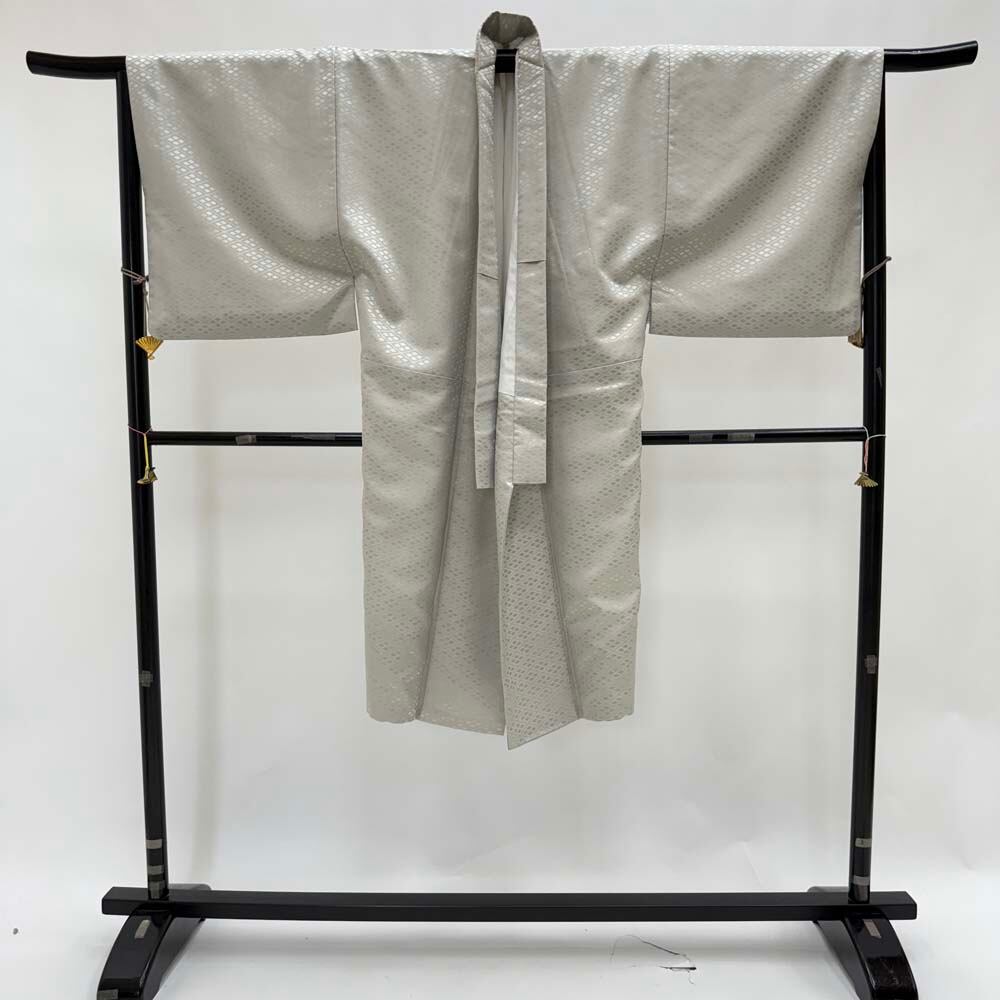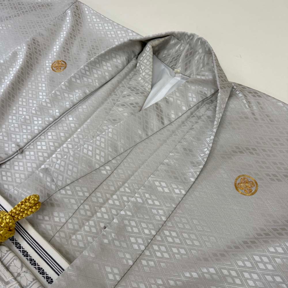 紋付袴 6点セット 着物 羽織 袴 長襦袢 羽織紐 角帯 裄71.8cm 袴丈89.5cm L~2L グレー 五つ紋 中古 4498