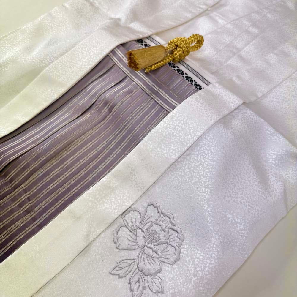 紋付袴 6点セット 着物 羽織 袴 長襦袢 羽織紐 角帯 裄73.6cm 袴丈87cm L 白 紫 五つ紋 中古 4505