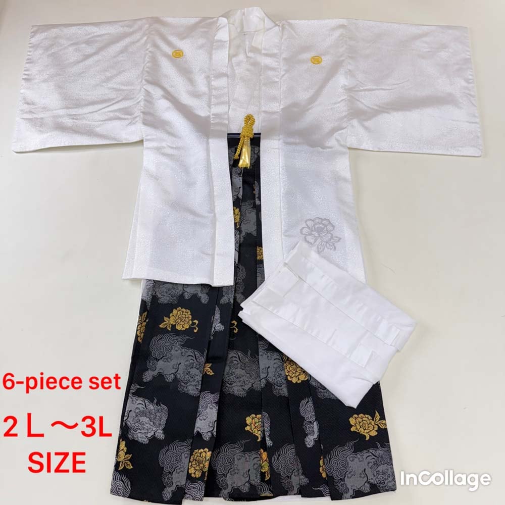 紋付袴 6点セット 着物 羽織 袴 長襦袢 羽織紐 角帯 裄74.5cm 袴丈93.5cm 2L~3L 白 五つ紋 中古 4510