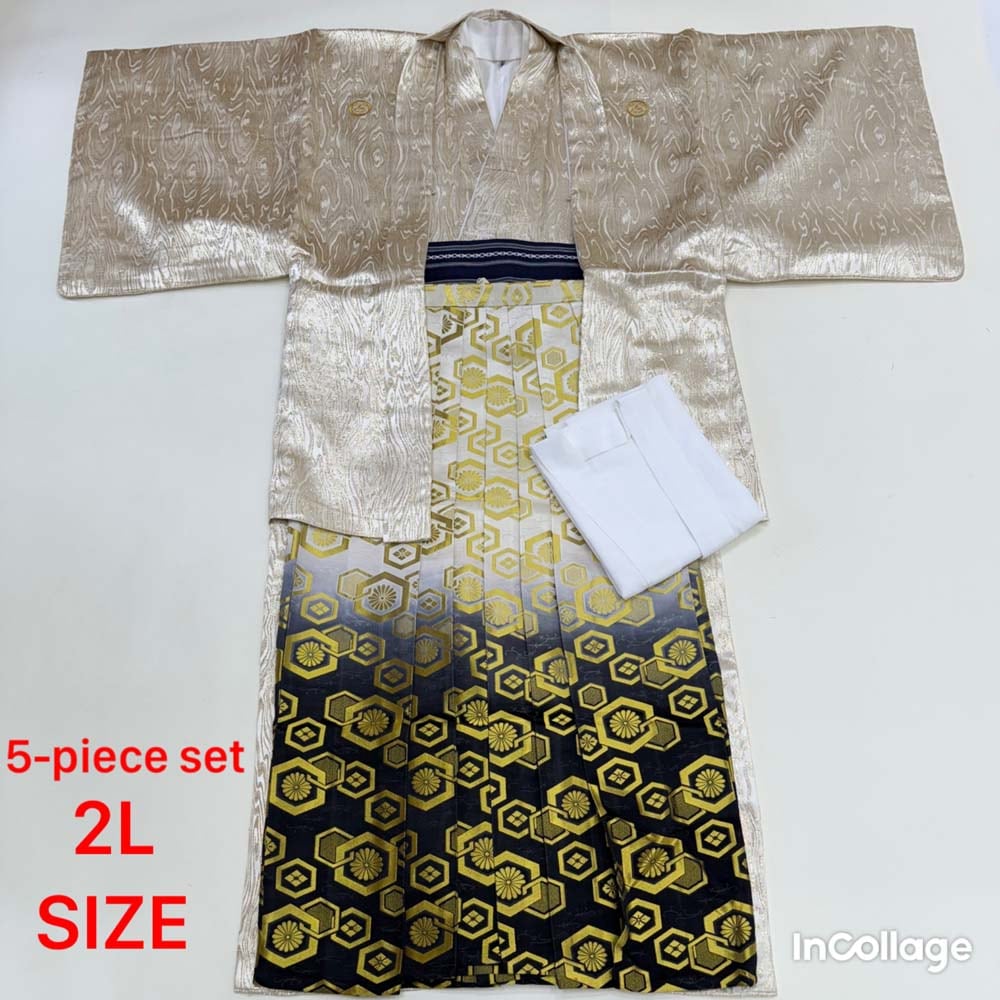 紋付袴 5点セット 着物 羽織 袴 長襦袢 角帯 裄73.6cm 袴丈91cm 2L シルバー 五つ紋 中古 4516