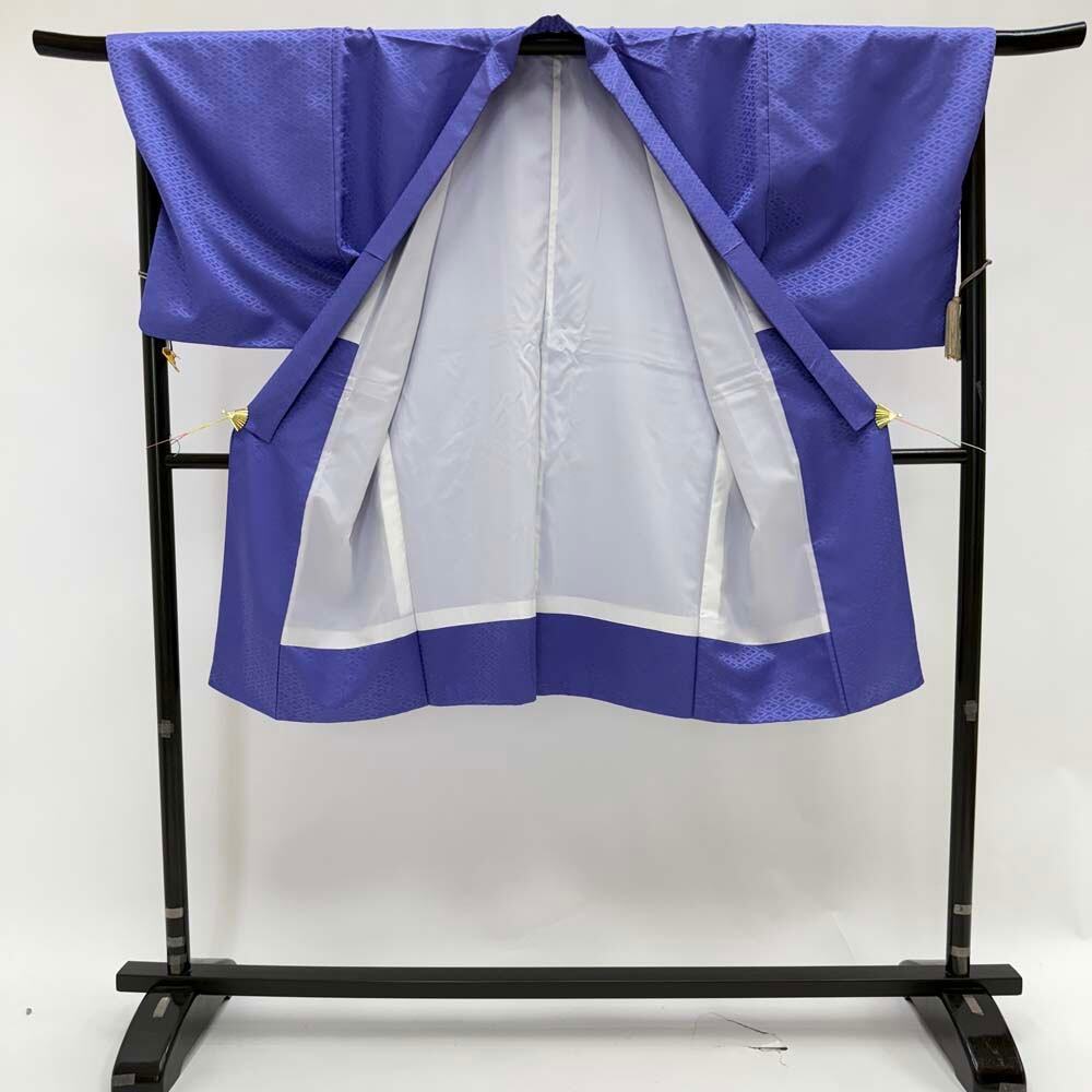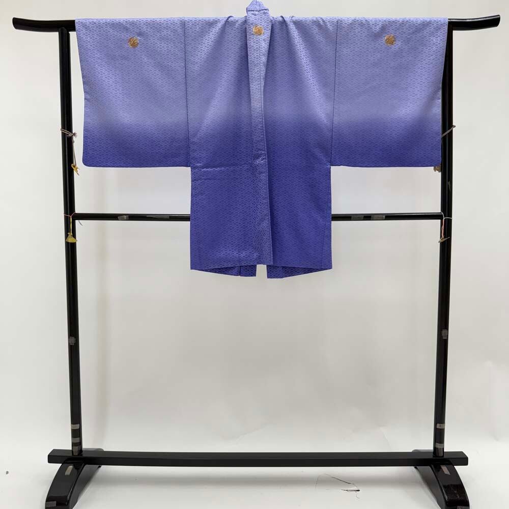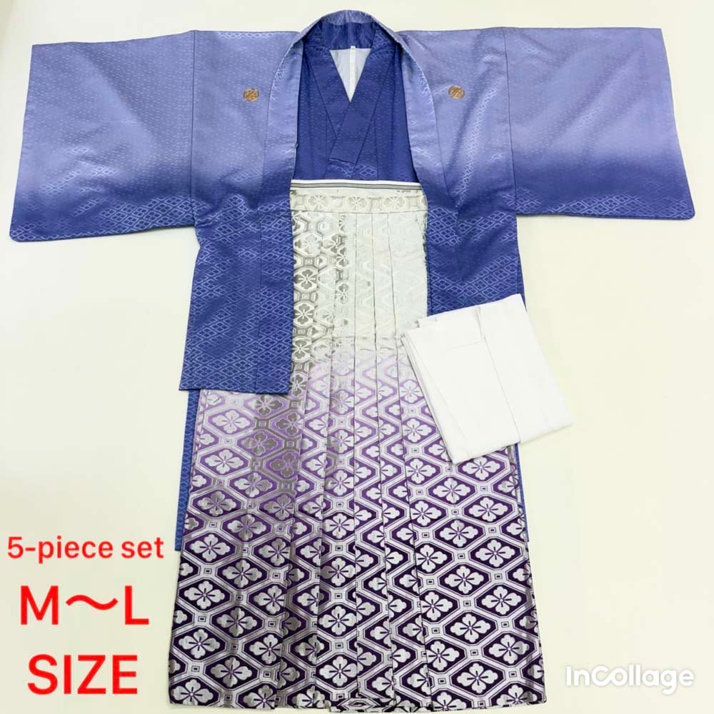 紋付袴 5点セット 着物 羽織 袴 長襦袢 角帯 裄70cm 袴丈86cm M~L 紫 グレー 五つ紋 中古 4519