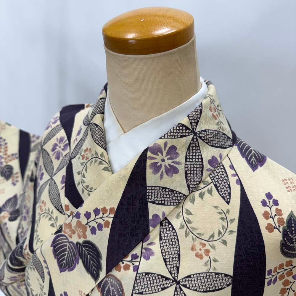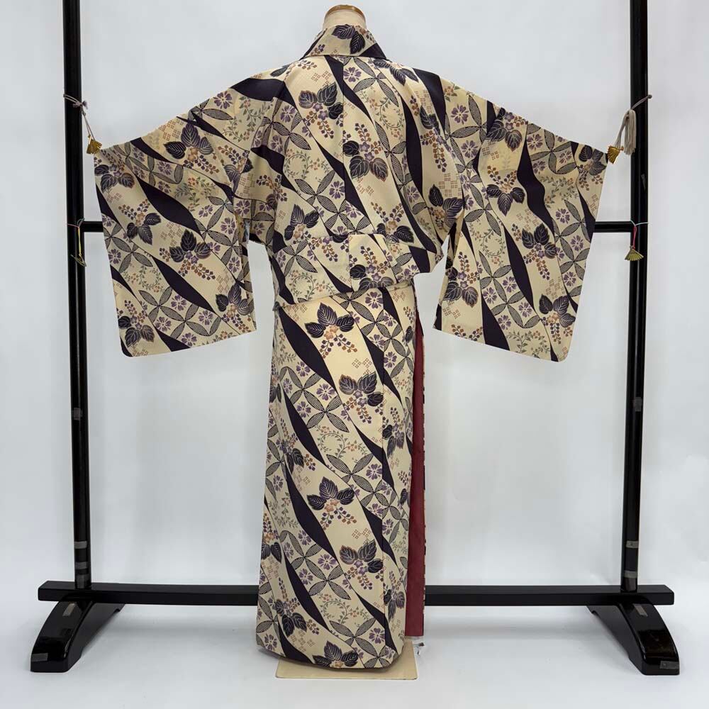 小紋 単衣 洗える着物 幅広 大きい 裄68cm 身丈163cm 花柄 お洒落着 普段着 ポリエステル 紺 クリーム 美品 L サイズ 4586