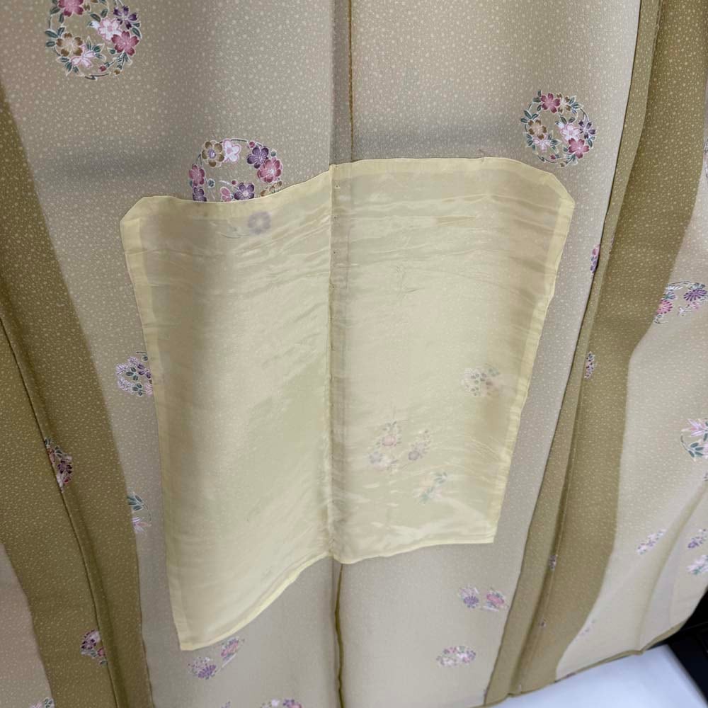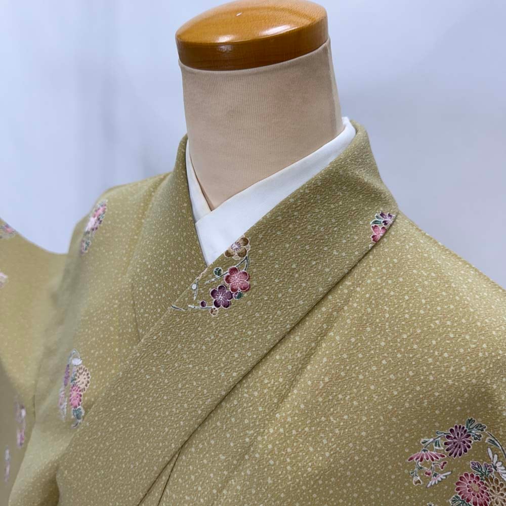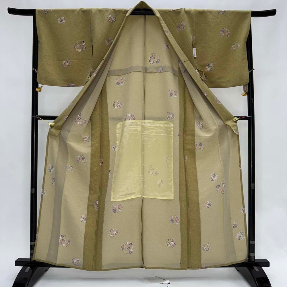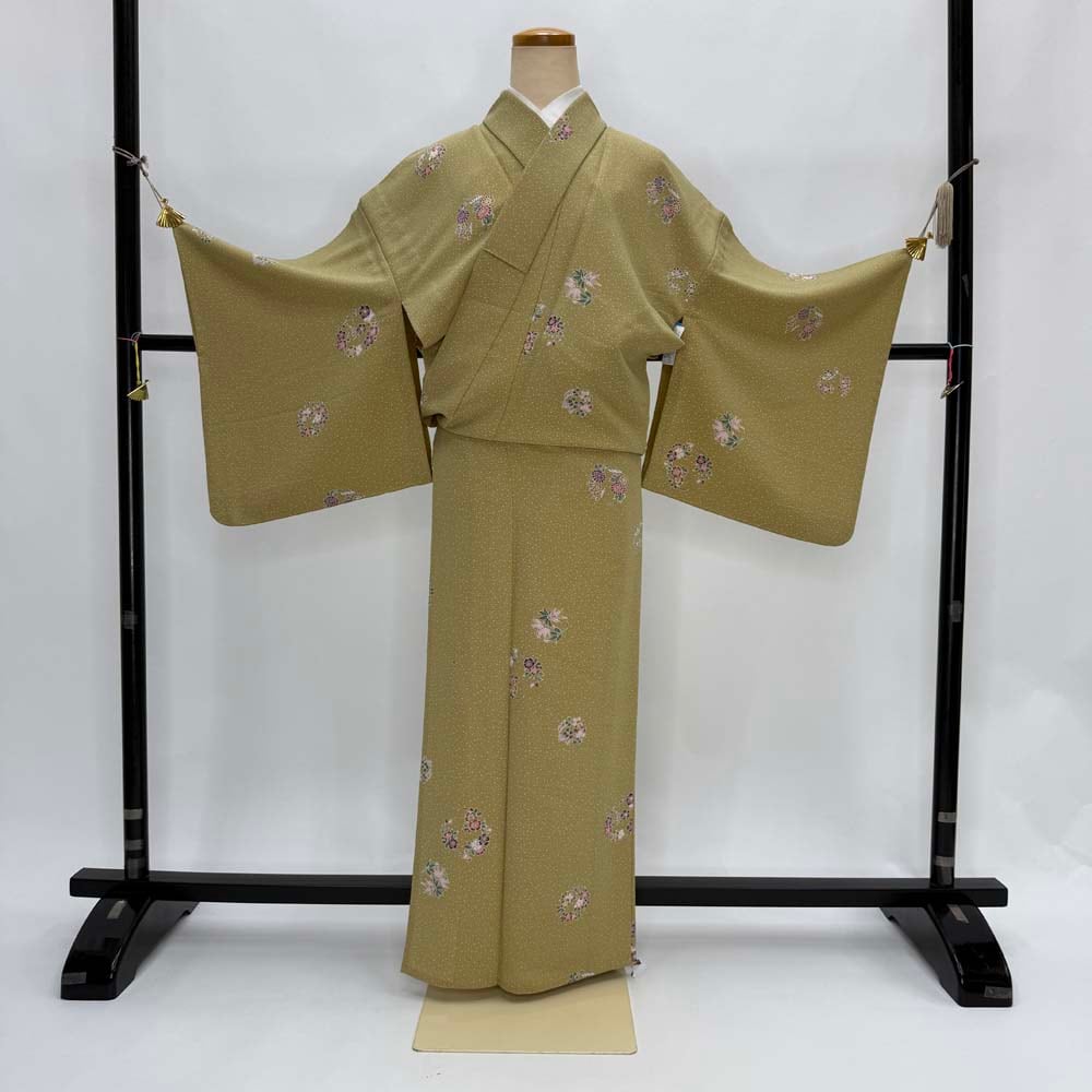 小紋 単衣 洗える着物 裄66.1cm 身丈159cm 花柄 お洒落着 普段着 ポリエステル カラシ 美品 M サイズ 4589