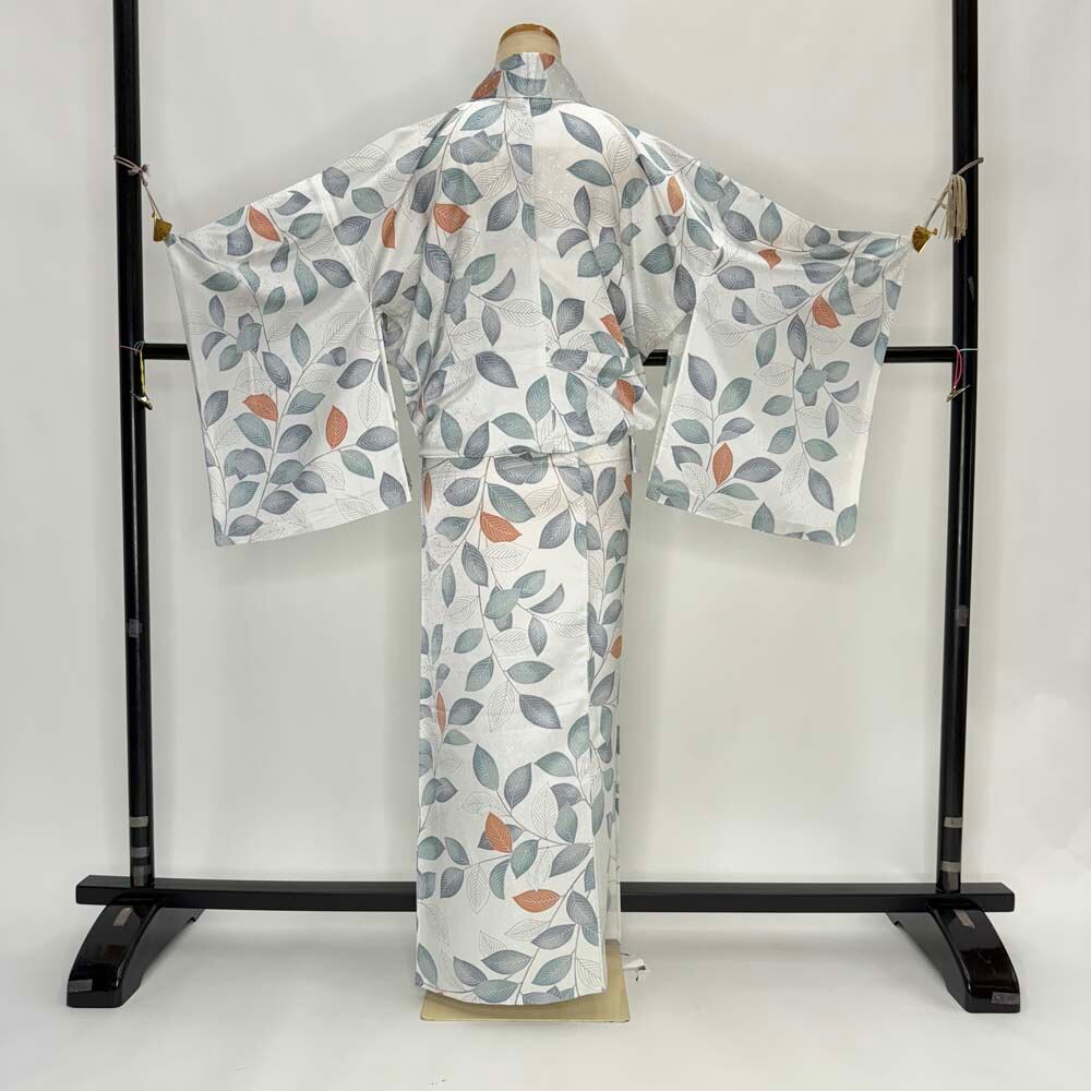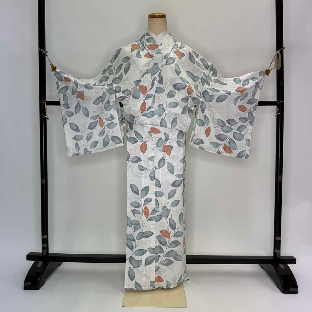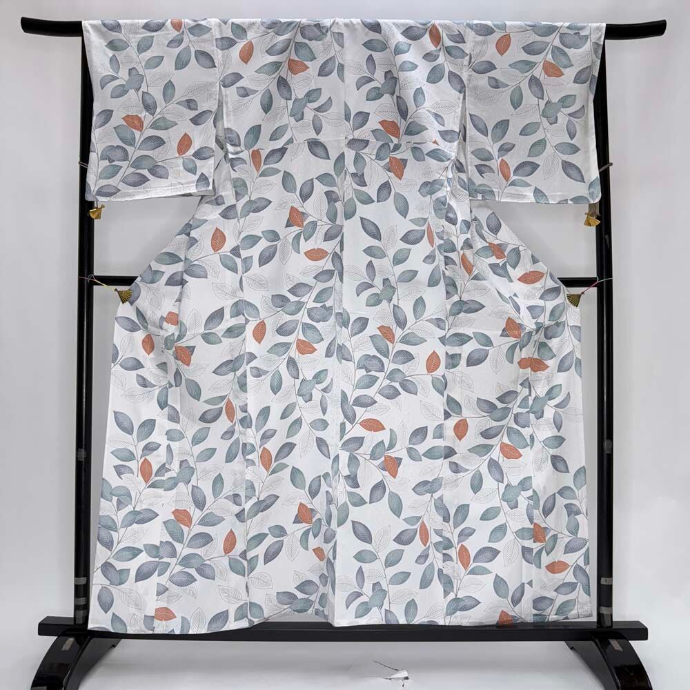 小紋 単衣 洗える着物 裄66.5cm 身丈156cm 花柄 お洒落着 普段着 ポリエステル 白 美品 M サイズ 4590