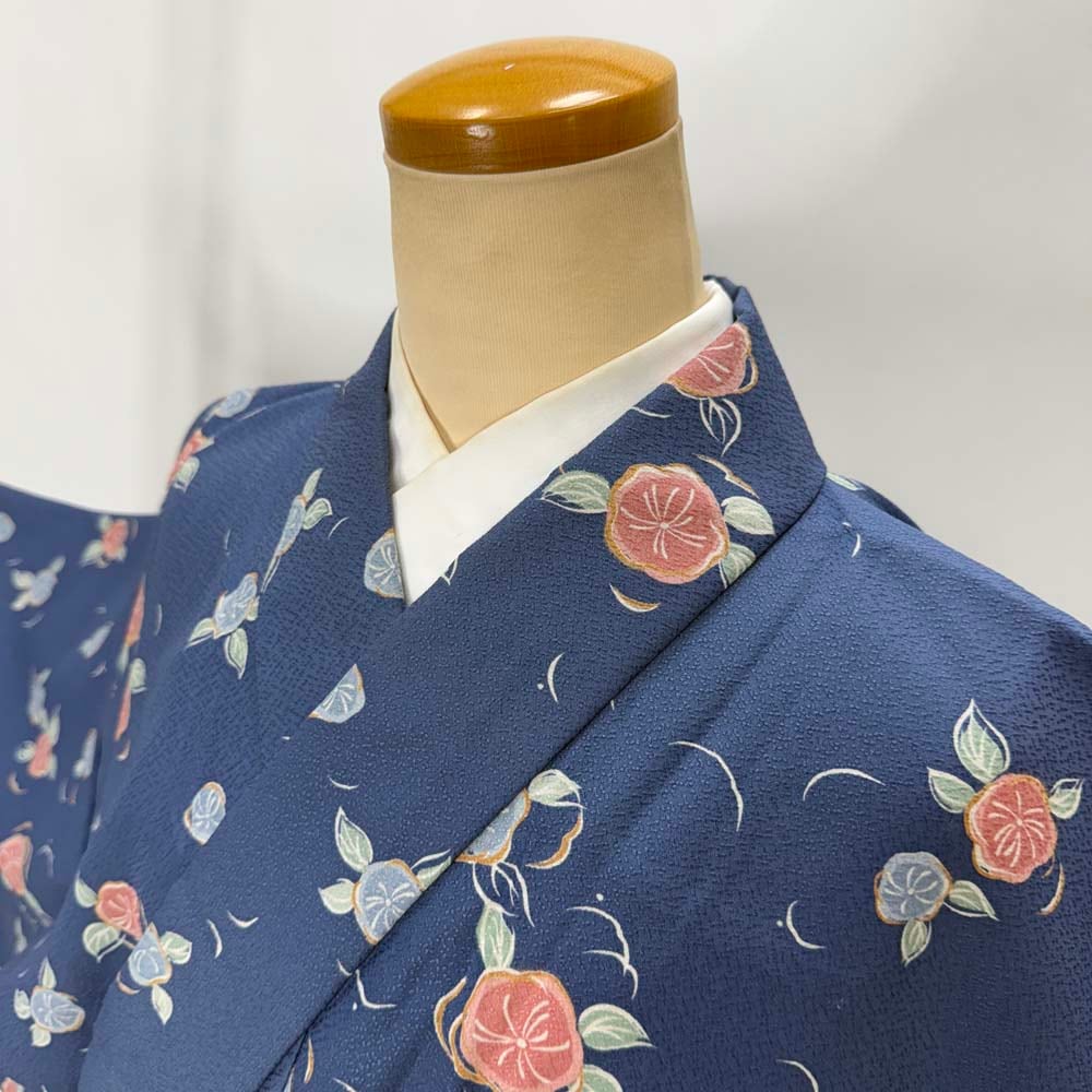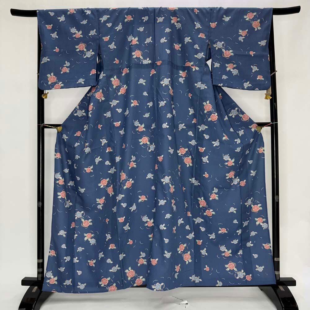 小紋 単衣 洗える着物 幅広 大きい 裄66.8cm 身丈159.5cm 花柄 お洒落着 普段着 ポリエステル 青 美品 M サイズ 4592