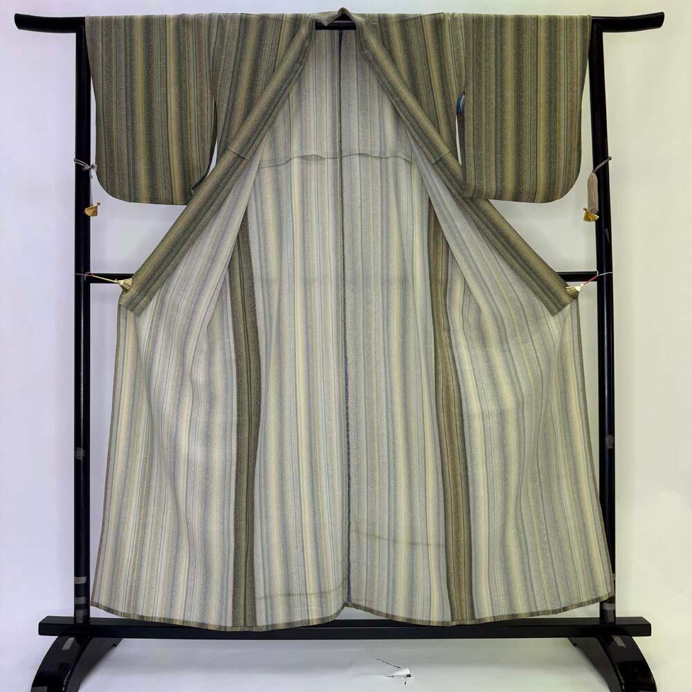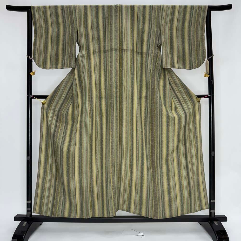 小紋 単衣 洗える着物 裄65cm 身丈155cm 花柄 お洒落着 普段着 ポリエステル 緑 美品 M サイズ 4596
