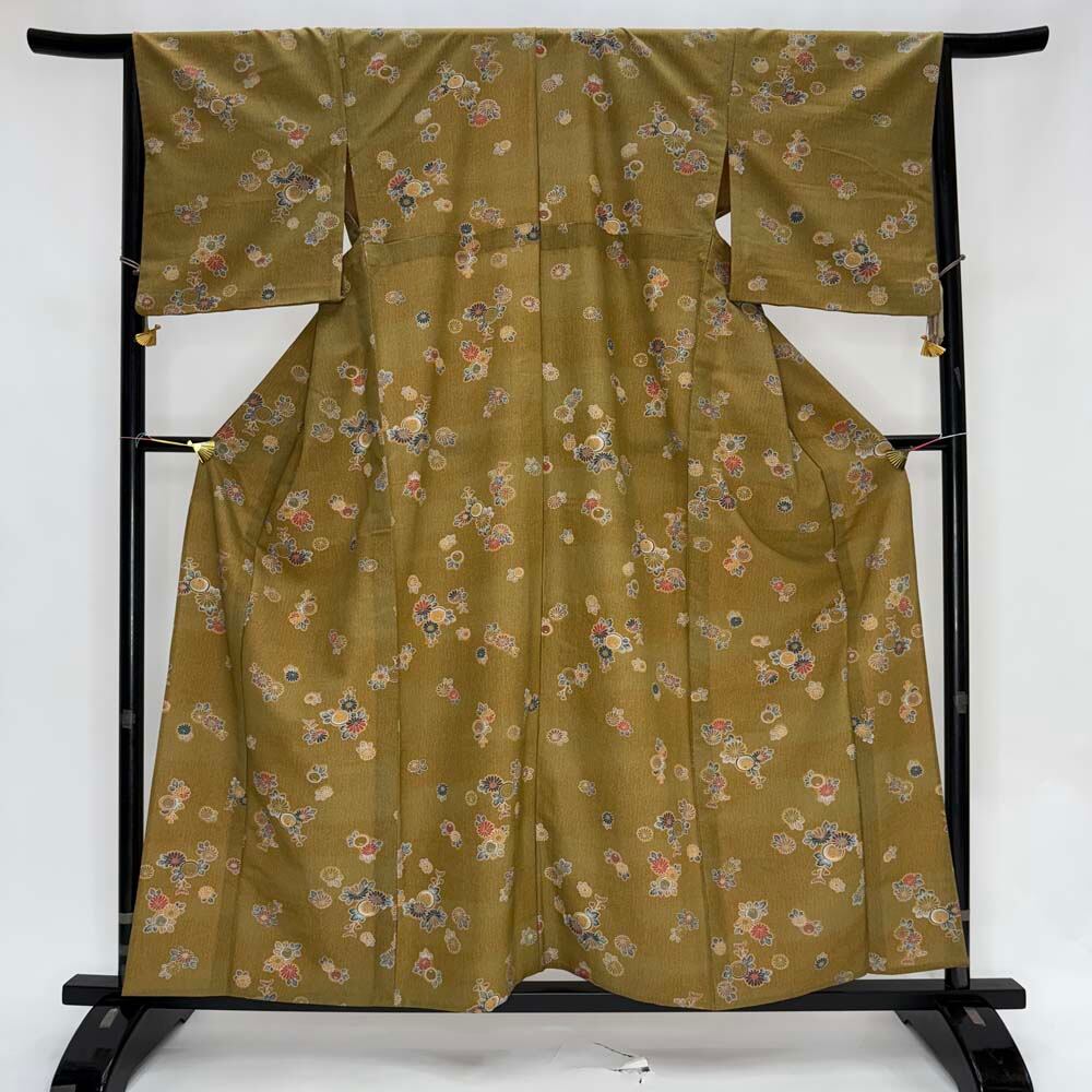 小紋 単衣 洗える着物 幅広 大きい 裄65.7cm 身丈157.5cm 花柄 お洒落着 普段着 ポリエステル 茶 美品 M サイズ 4603