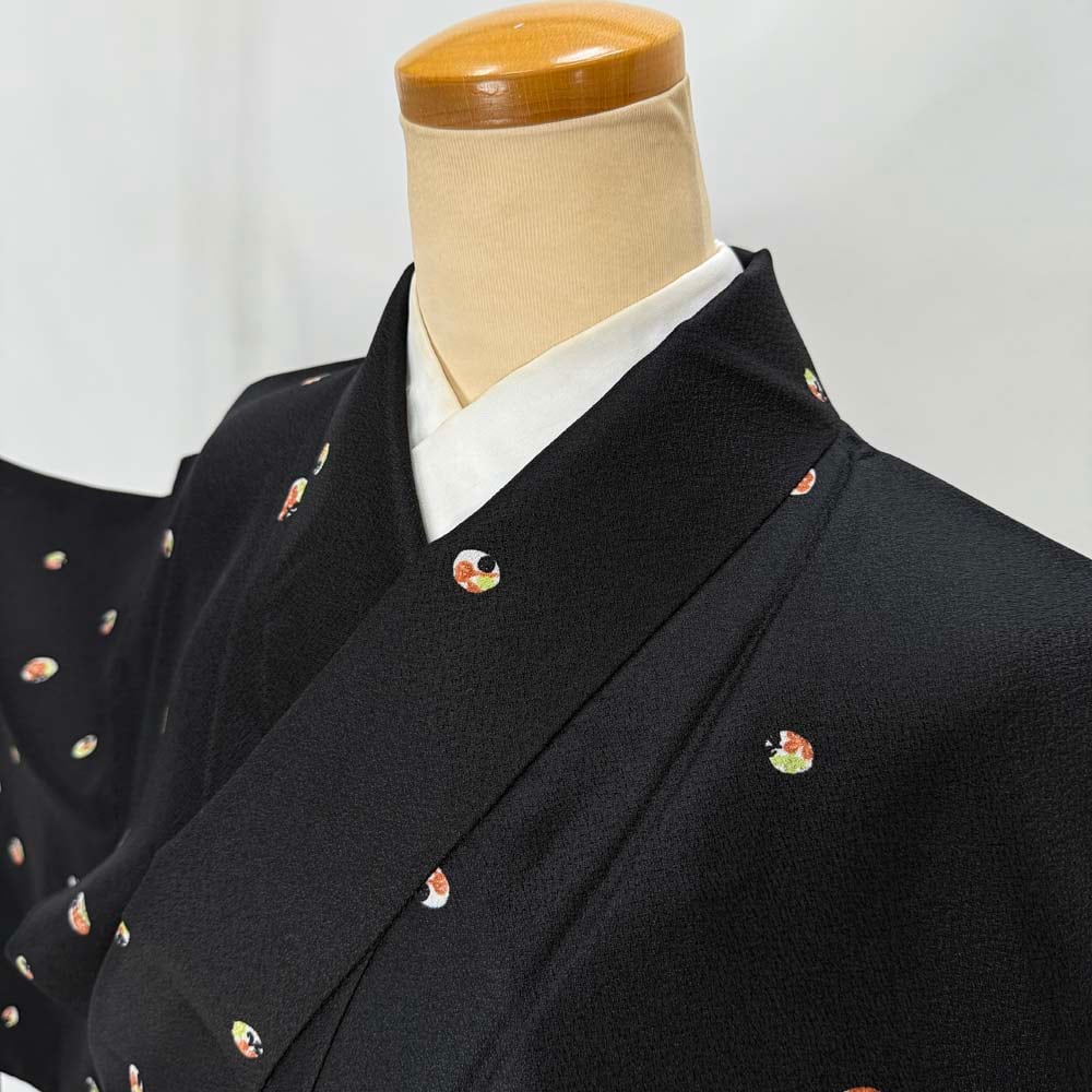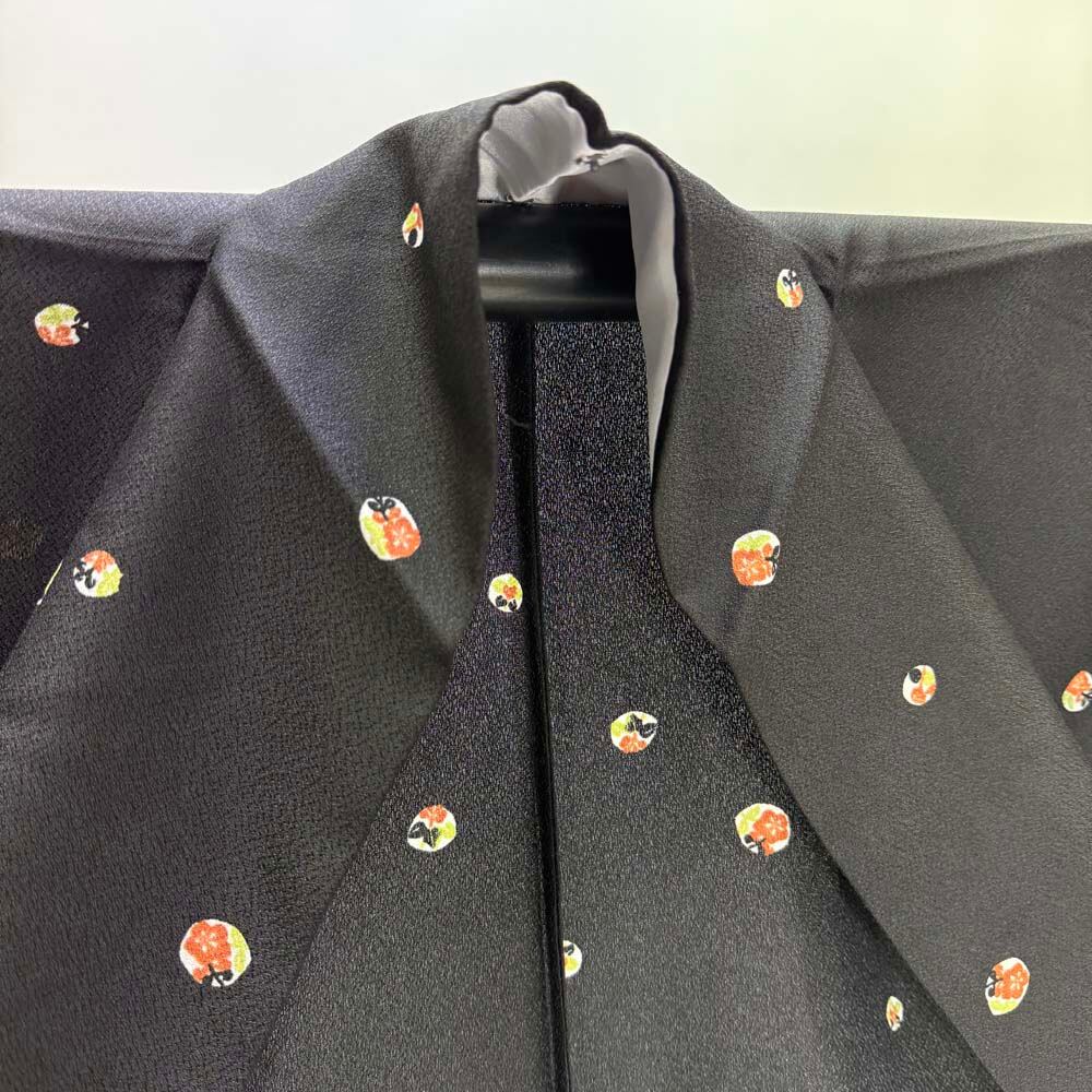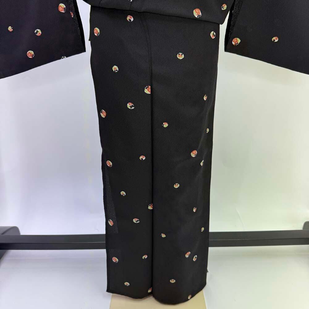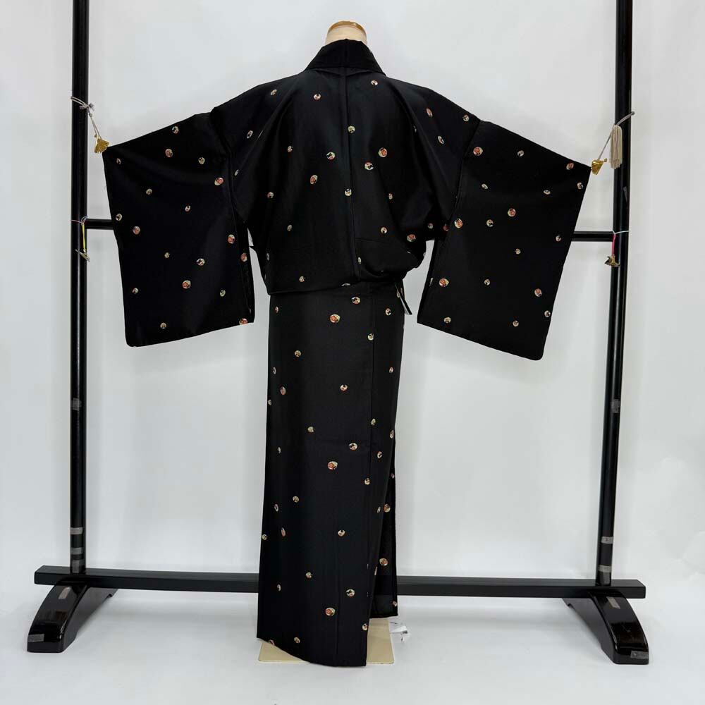 小紋 単衣 洗える着物 裄64.5cm 身丈160.7cm 花柄 お洒落着 普段着 ポリエステル 黒 美品 M サイズ 4605