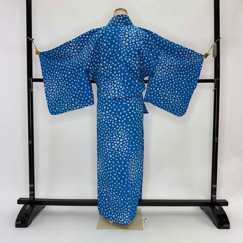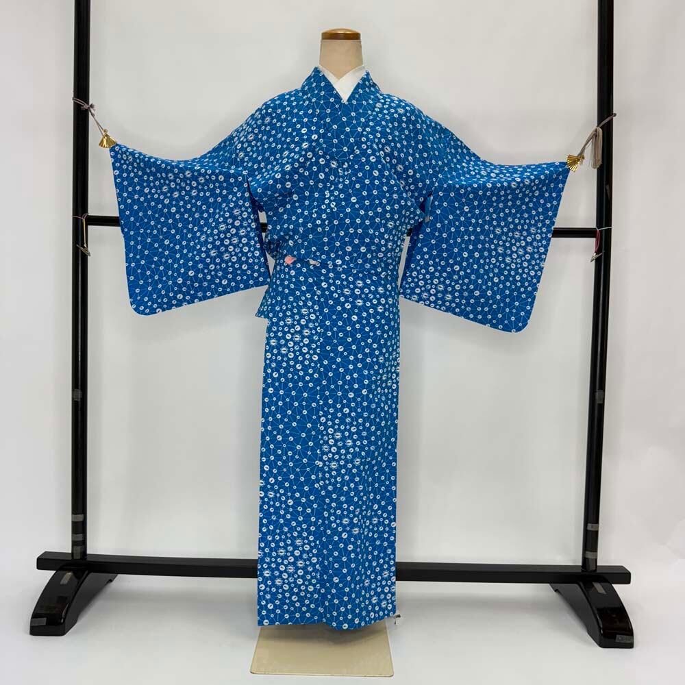 小紋 単衣 洗える着物 裄62.3cm 身丈152.3cm 花柄 お洒落着 普段着 ポリエステル 青 美品 S サイズ 4612