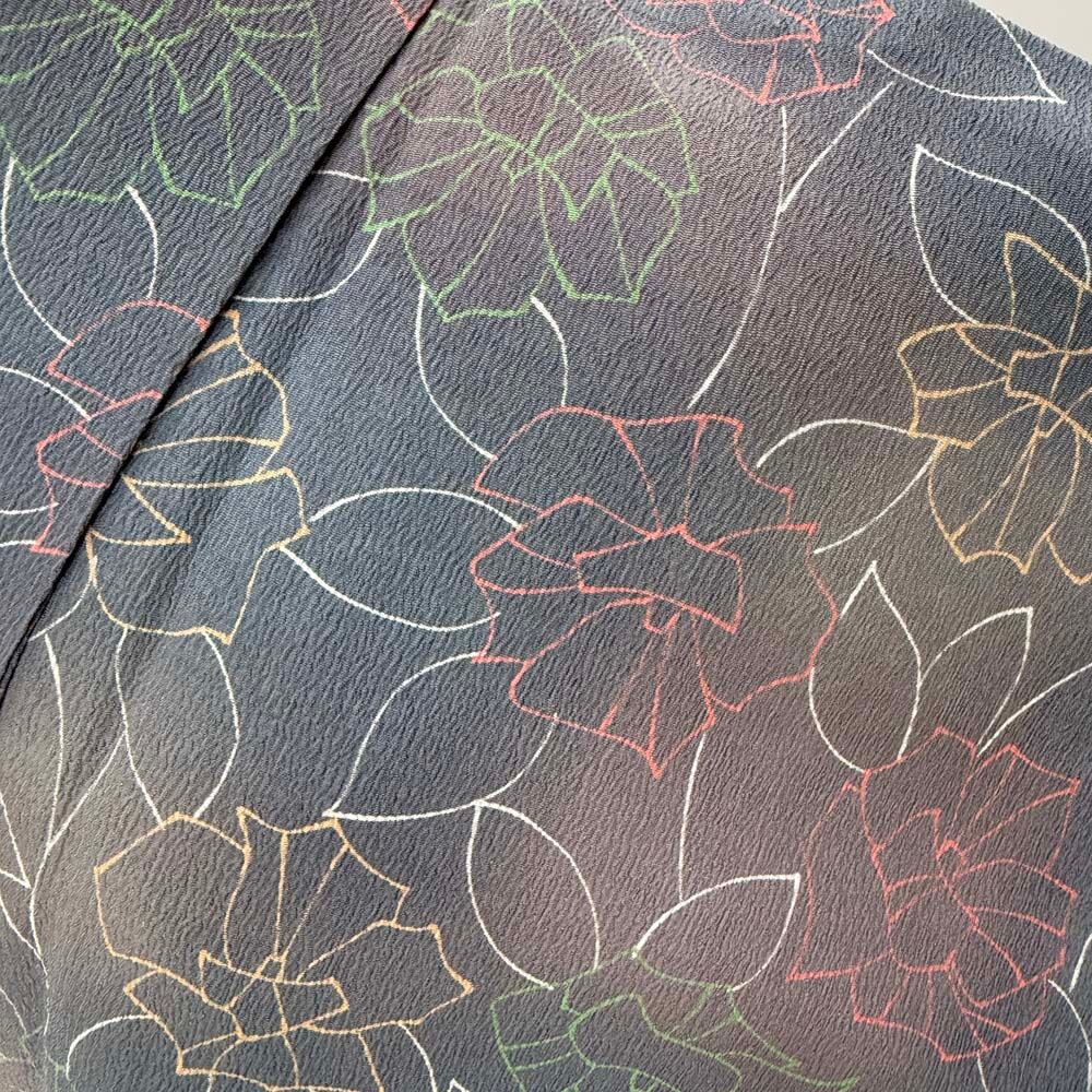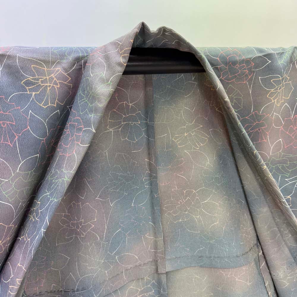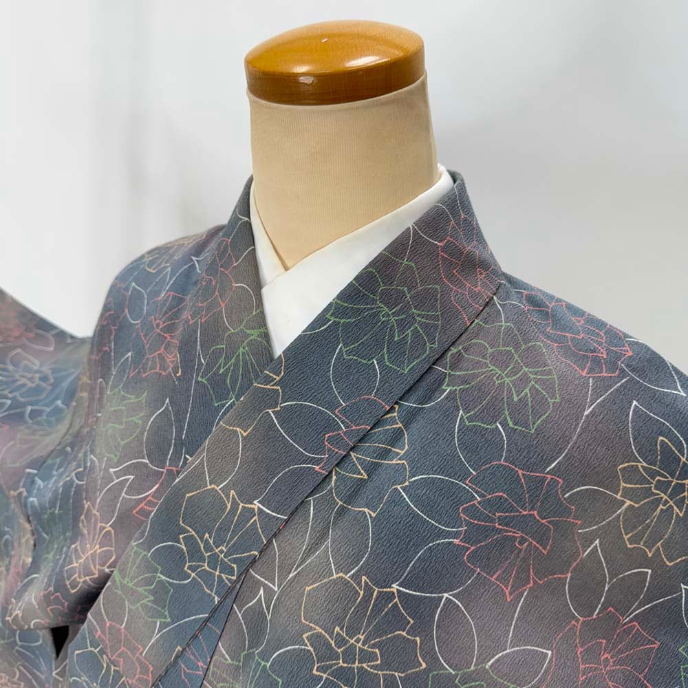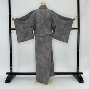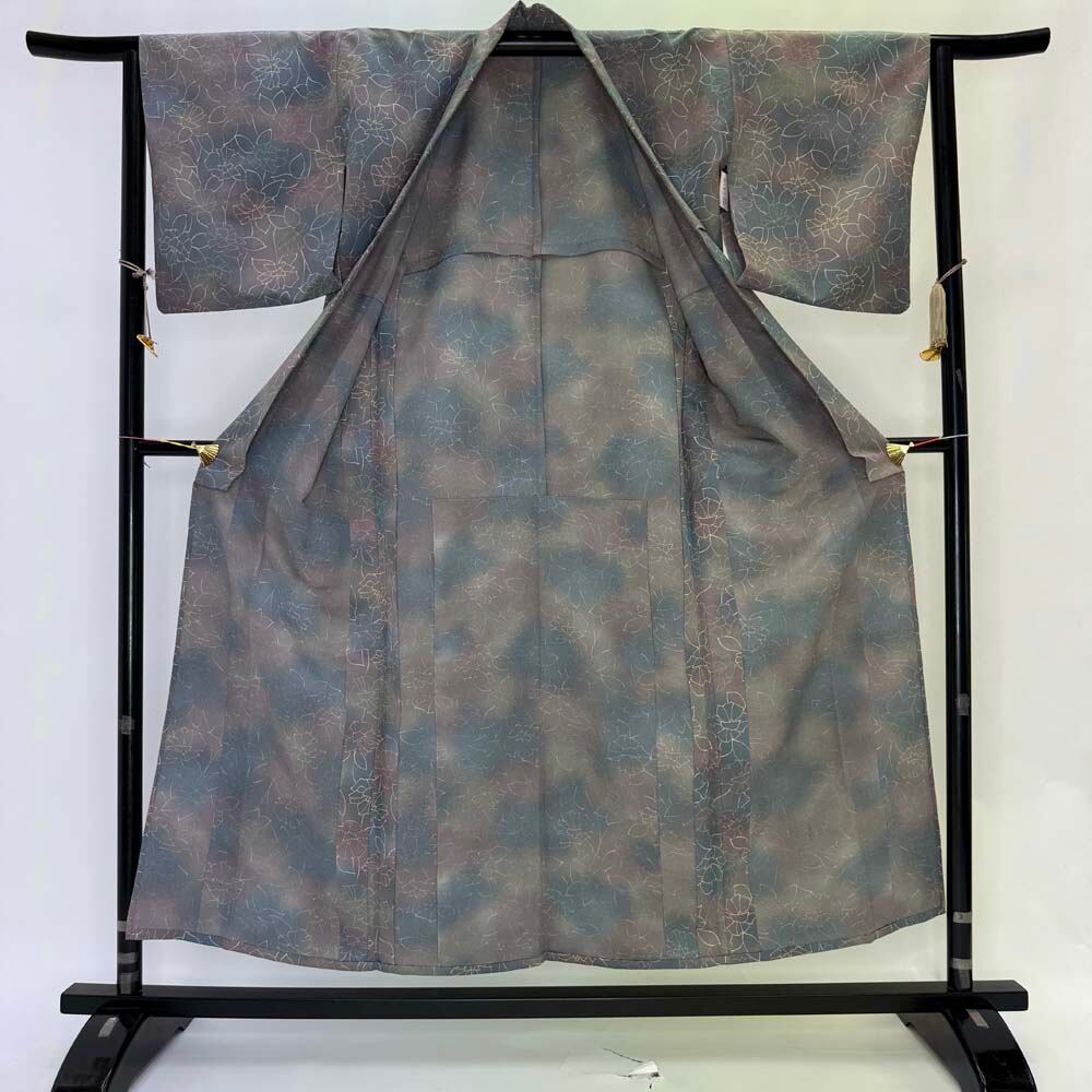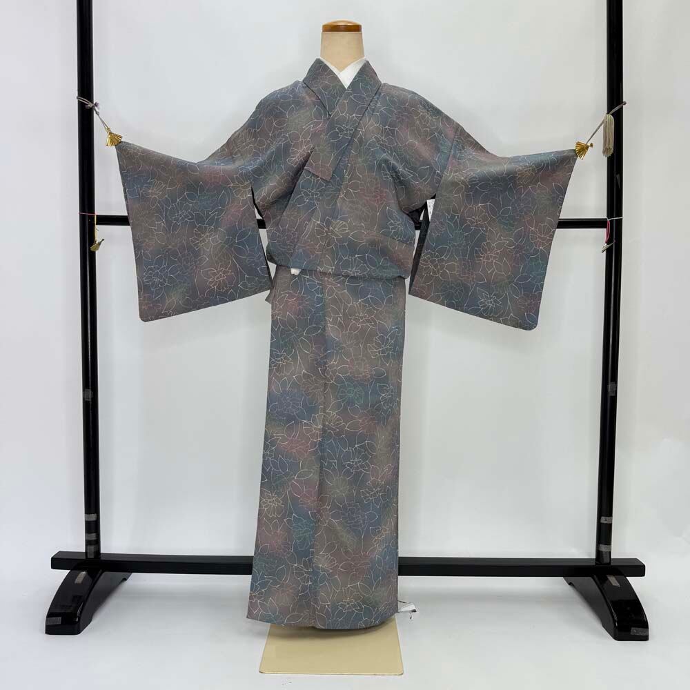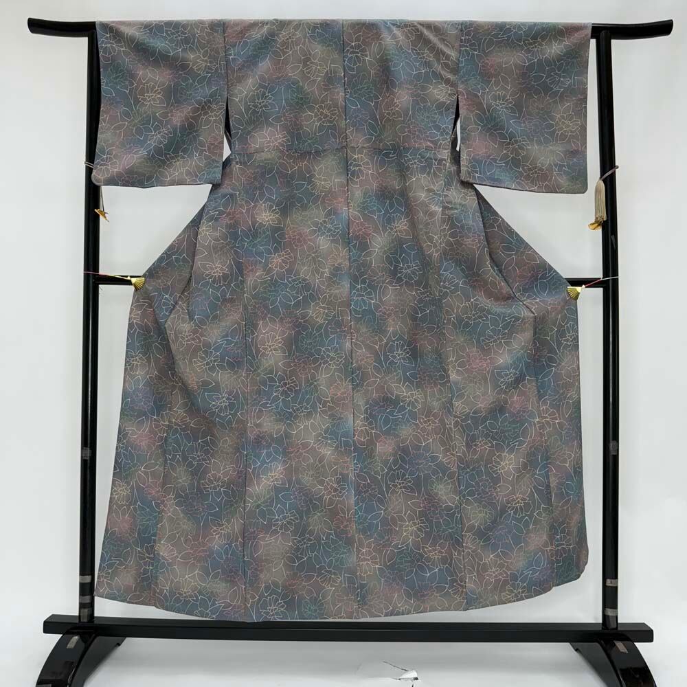 小紋 単衣 洗える着物 裄62.7cm 身丈152.5cm 花柄 お洒落着 普段着 ポリエステル グレー 美品 S サイズ 4618
