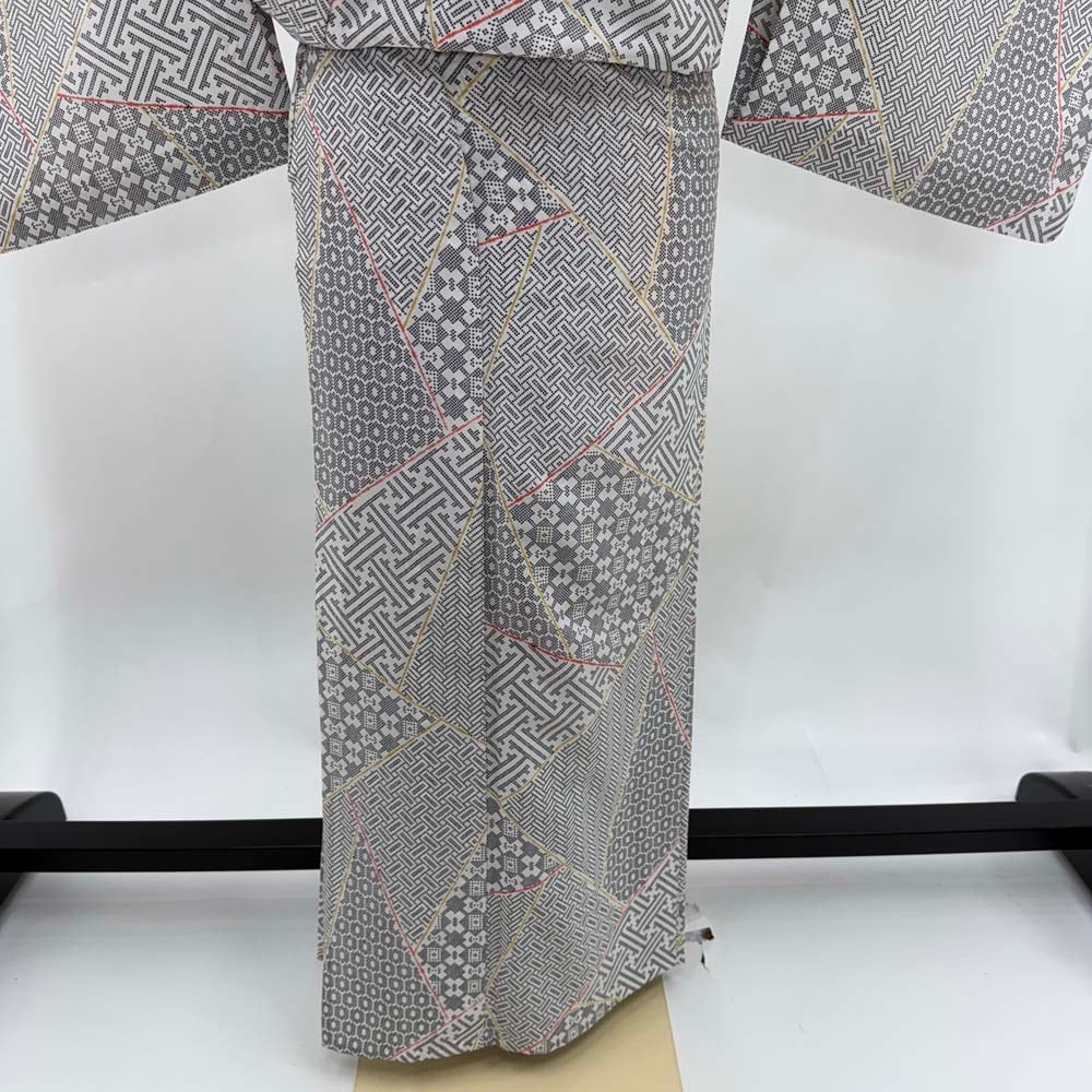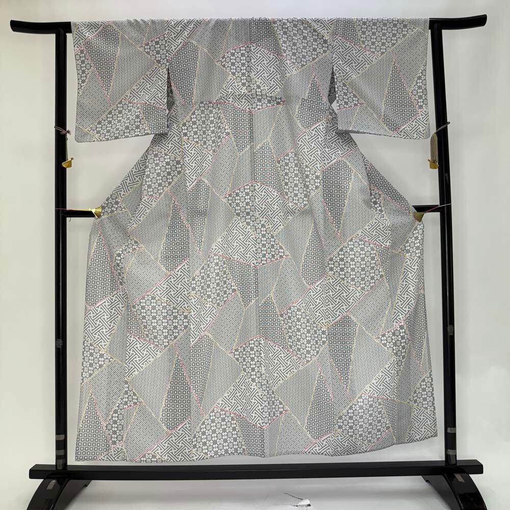 小紋 単衣 洗える着物 裄62cm 身丈154cm 花柄 お洒落着 普段着 ポリエステル 白 美品 S サイズ 4622
