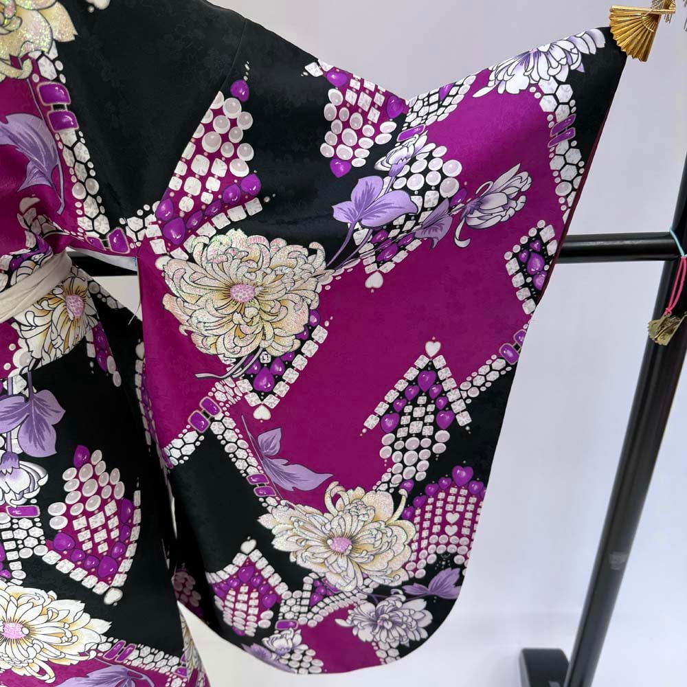 二尺袖 単品 卒業式着物 黒 紫 裄67cm Lサイズ 袴用着物 化繊 中古 4675