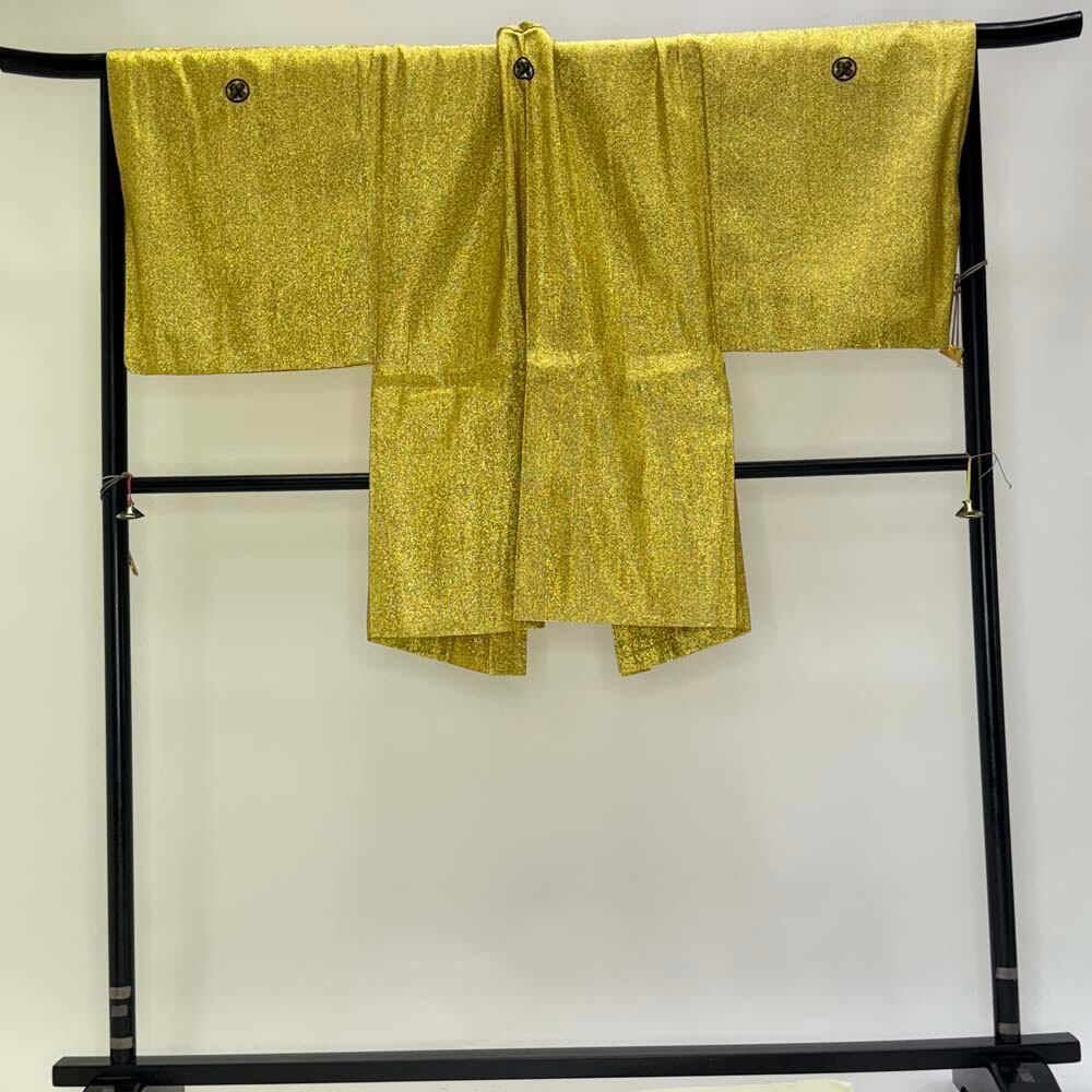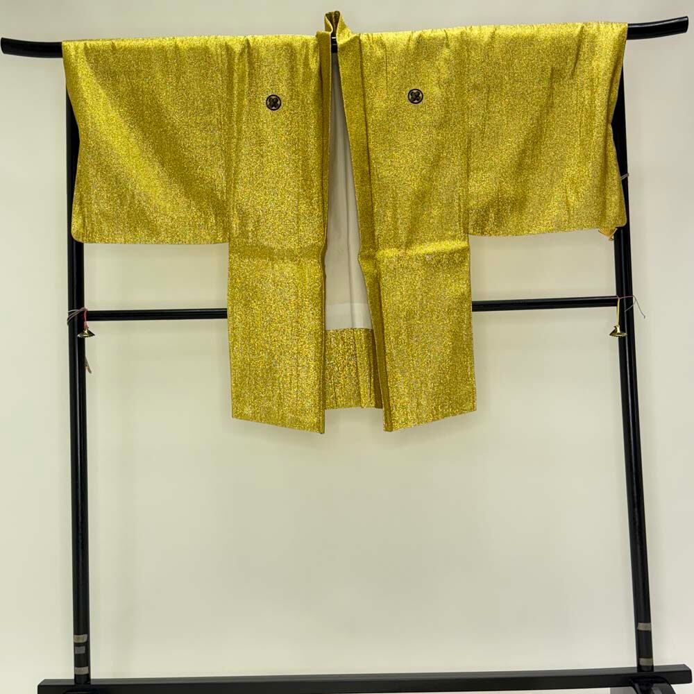 紋付袴 3点セット 着物 羽織 袴 長着 成人式袴 裄72.2cm 袴丈89cm L 金 黒 五つ紋 中古 4803