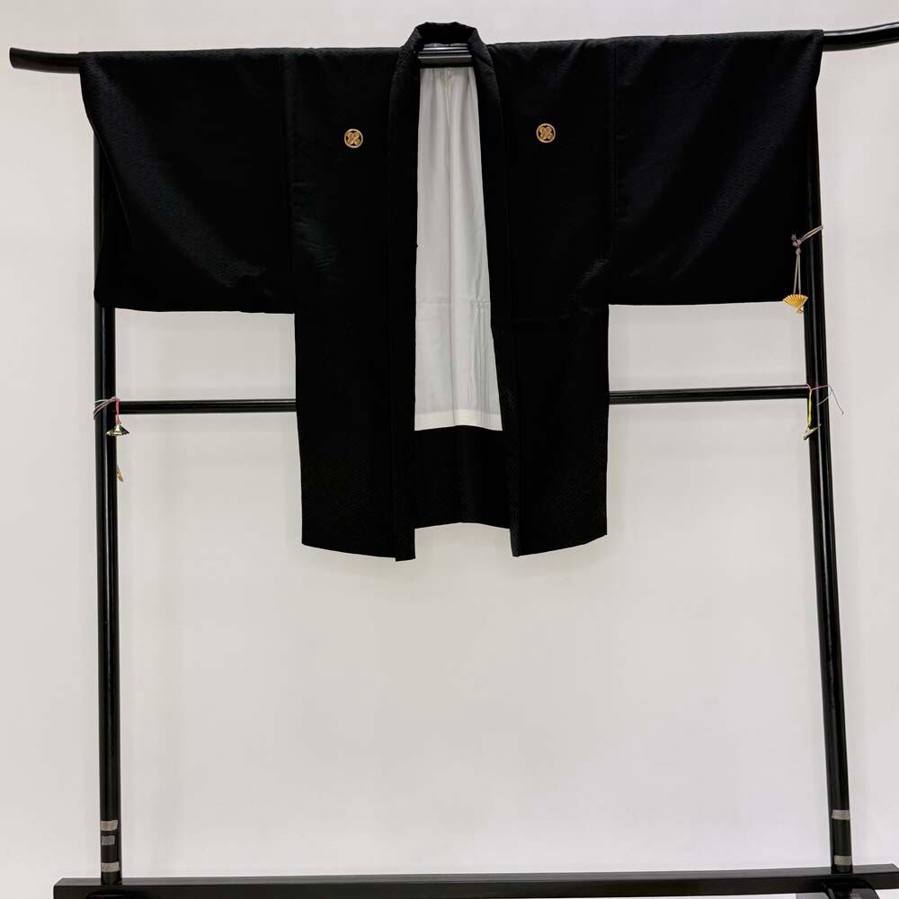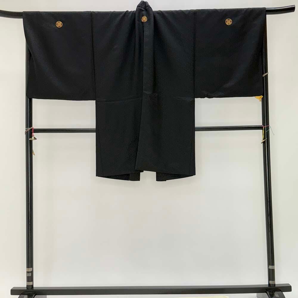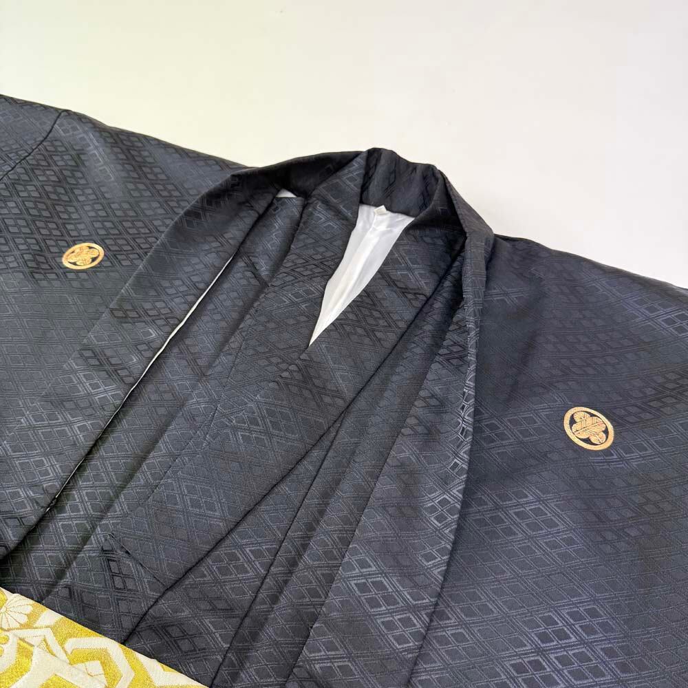 紋付袴 3点セット 着物 羽織 袴 角帯 長着 成人式袴 裄71.8cm 袴丈89.5cm L-2L 金 黒 五つ紋 中古 4804