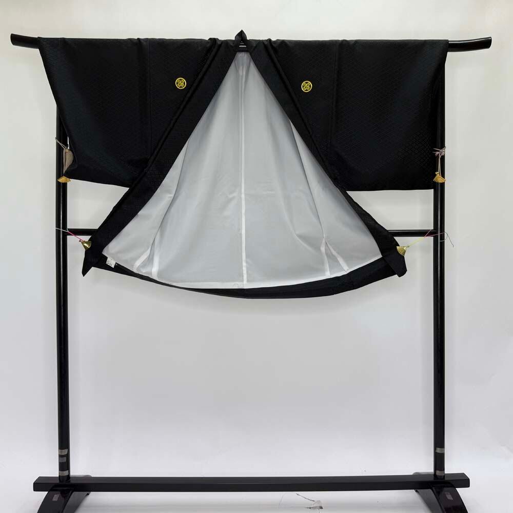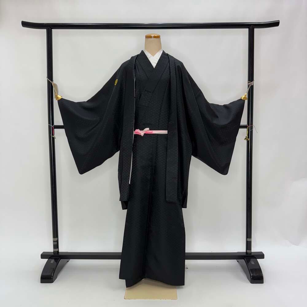 男紋付 男着物 黒紋付 ポリエステル 羽織 長着 裄74.2cm L-2L size 黒 五つ紋 中古 成人式 舞台衣装 4904