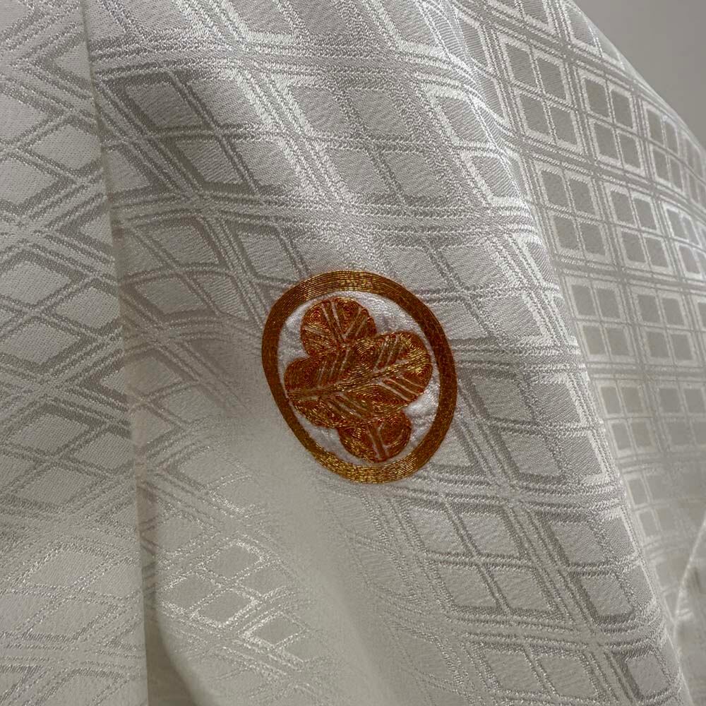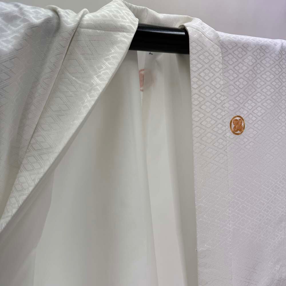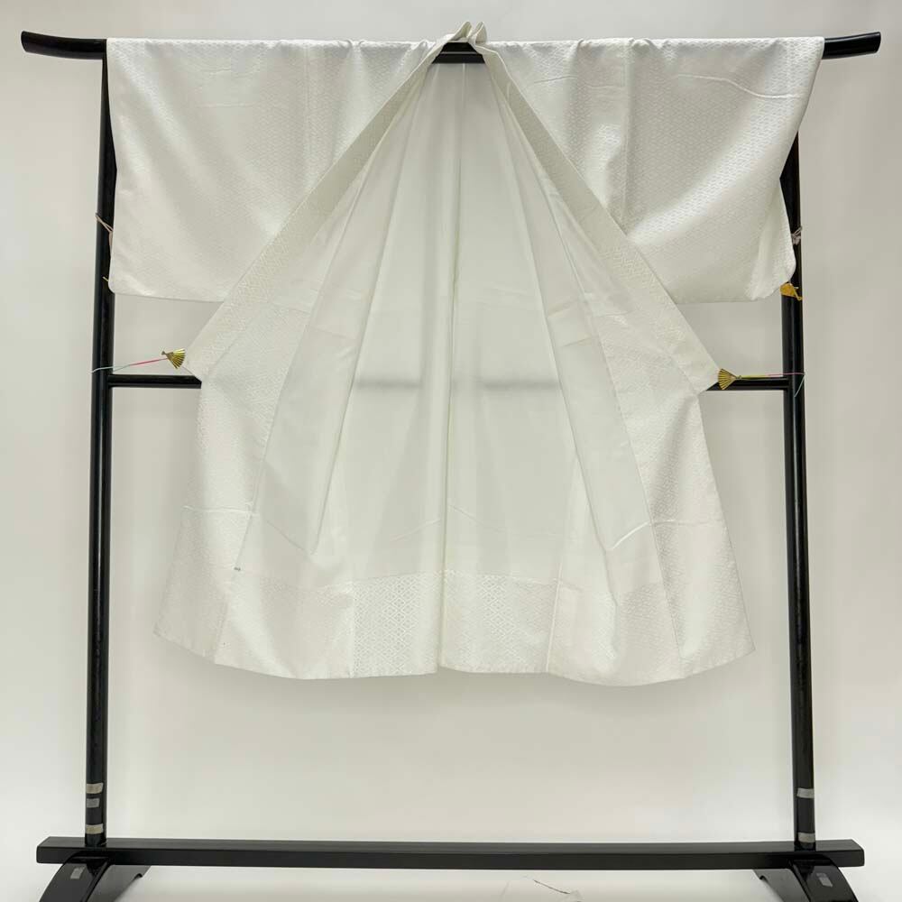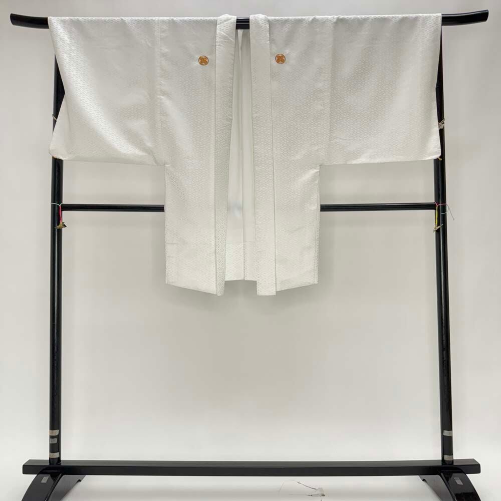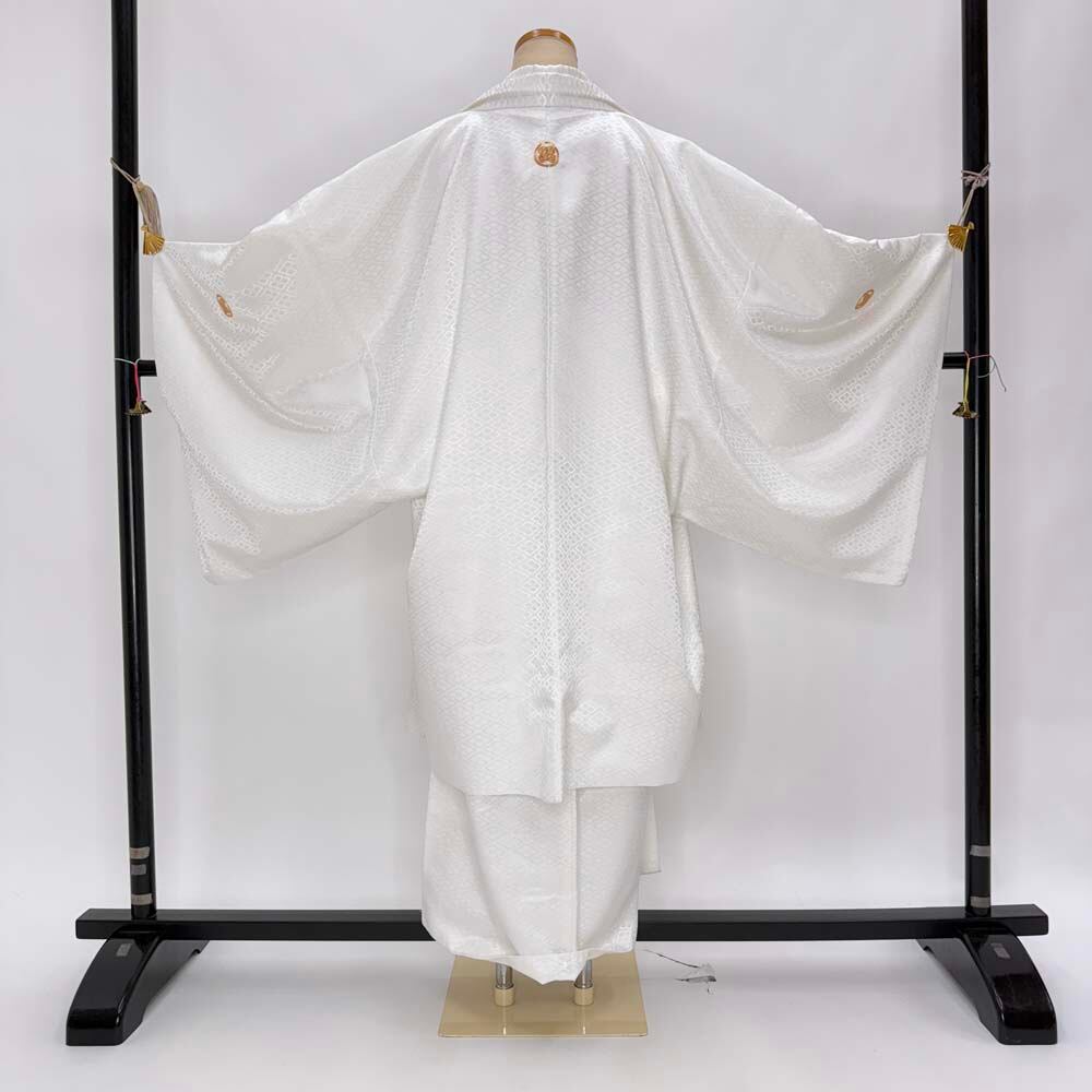 男紋付 男着物 紋付 ポリエステル 羽織 長着 裄76.2cm 2L-3L size 白 五つ紋 中古 成人式 舞台衣装 4909
