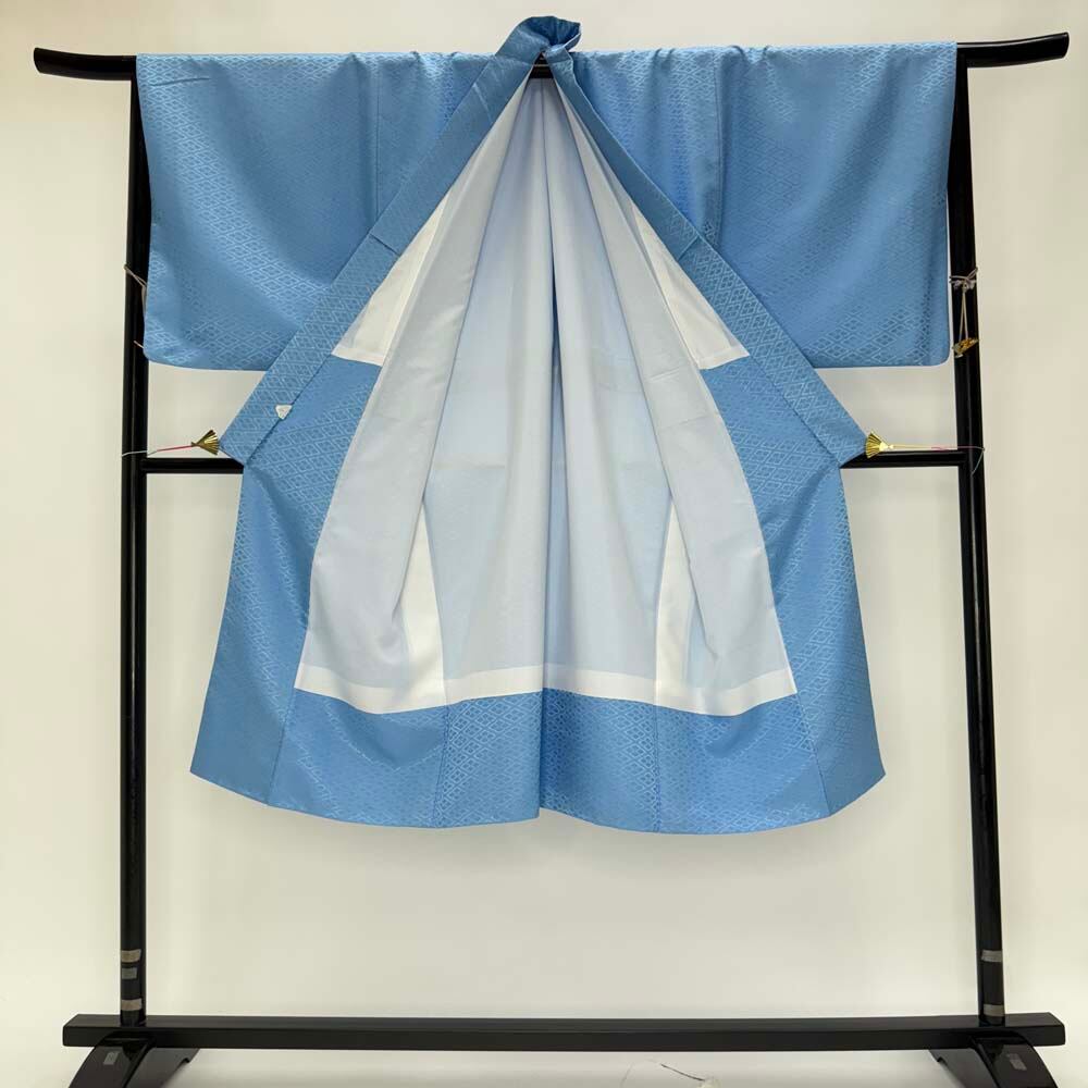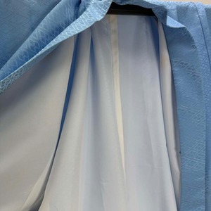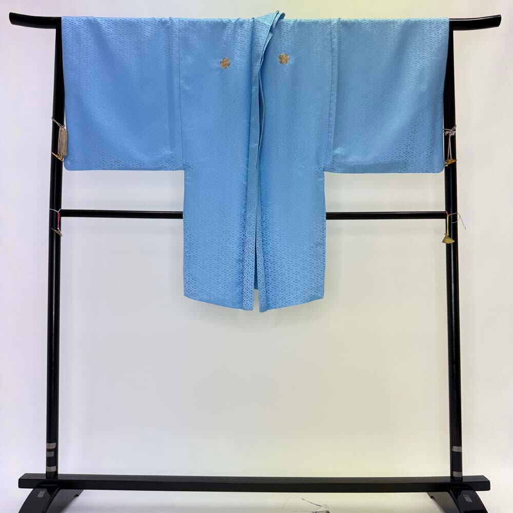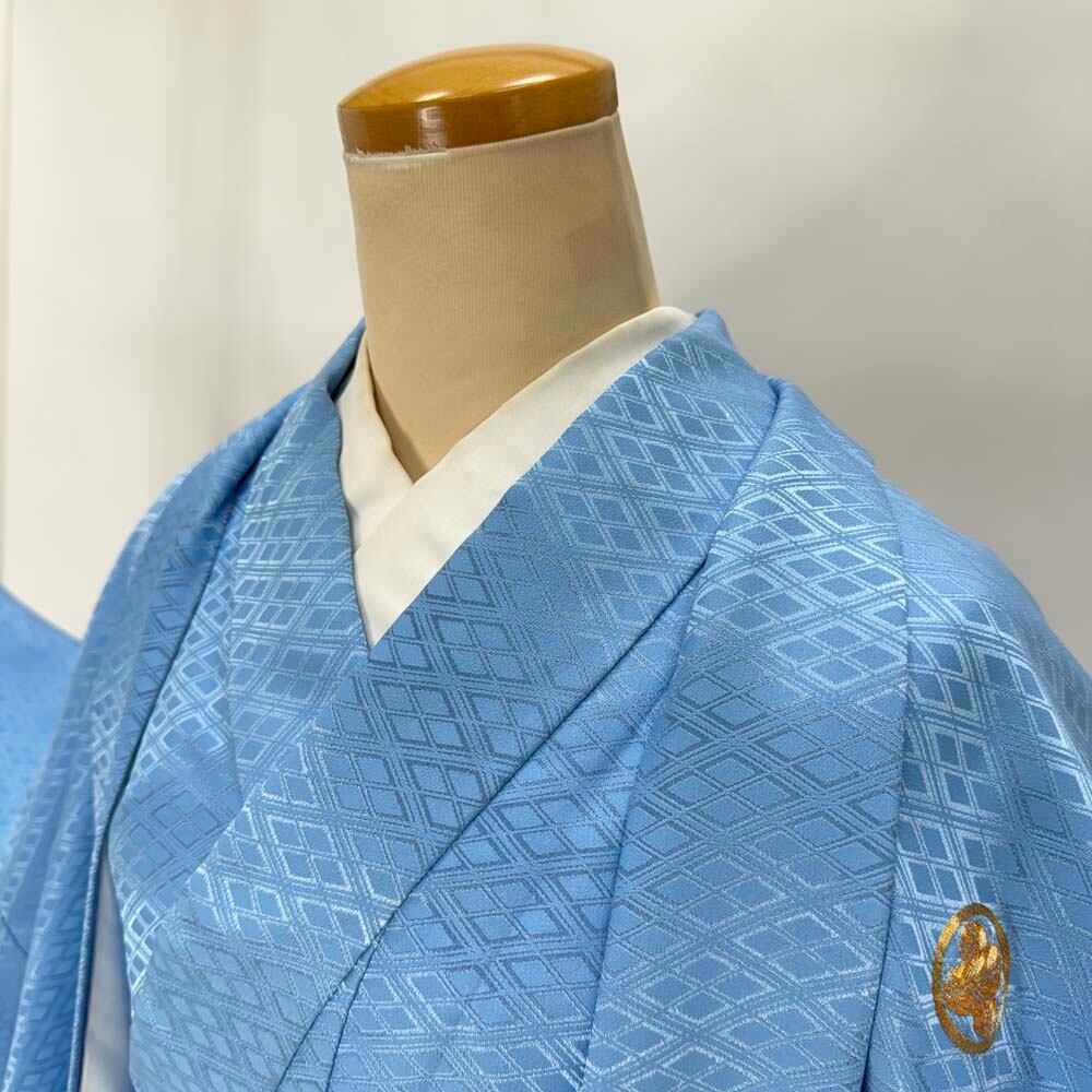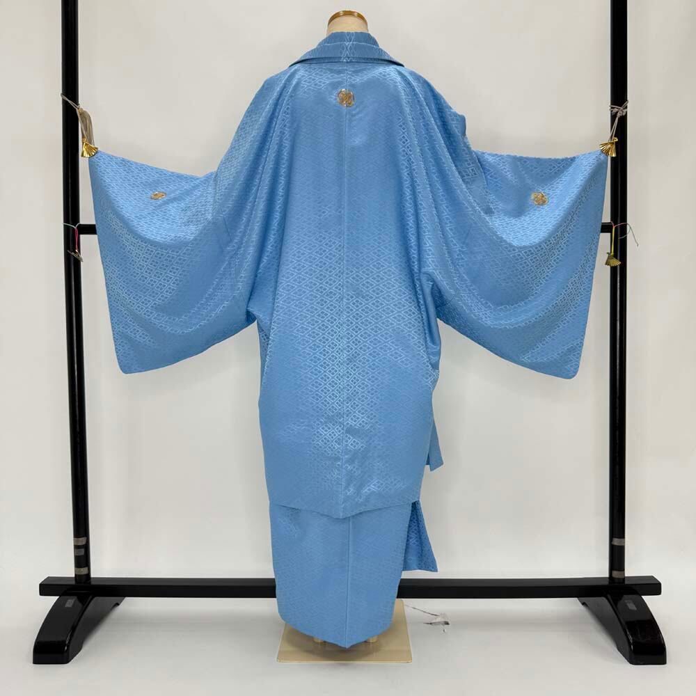 男紋付 男着物 紋付 ポリエステル 羽織 長着 裄76.5cm 2L-3L size 水色 五つ紋 中古 成人式 舞台衣装 4912