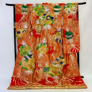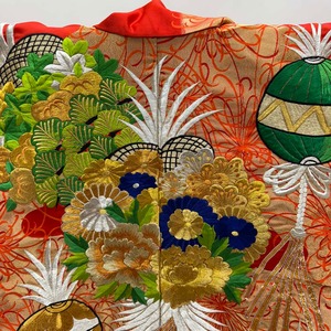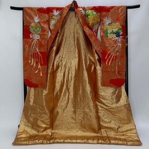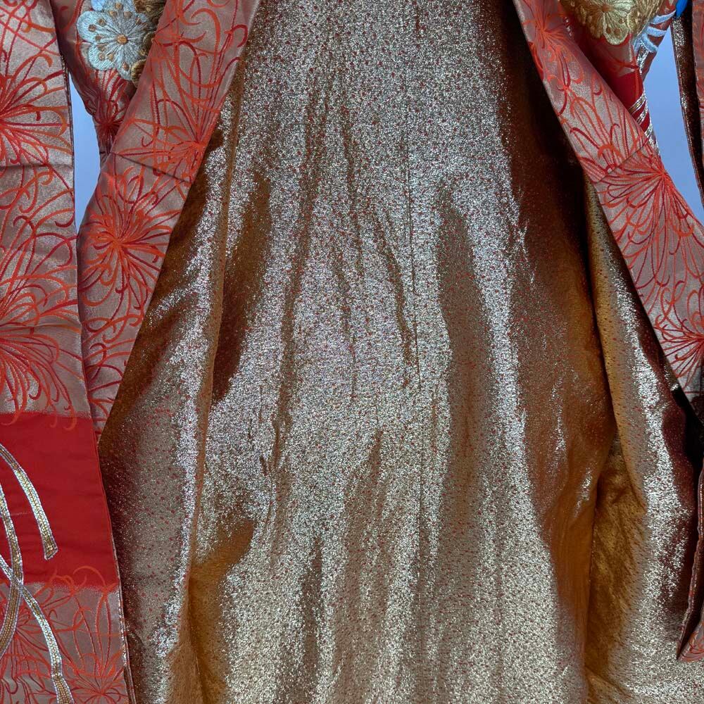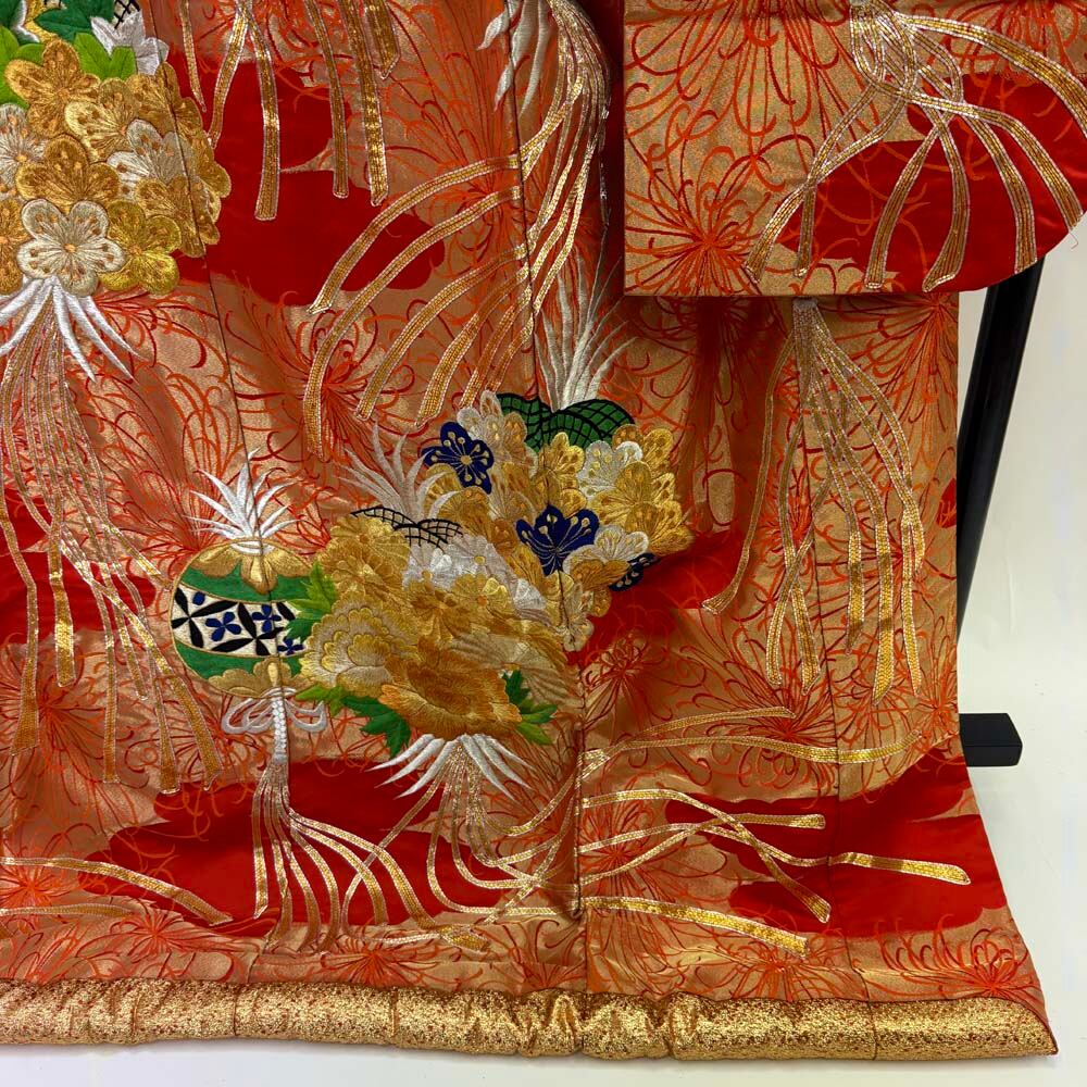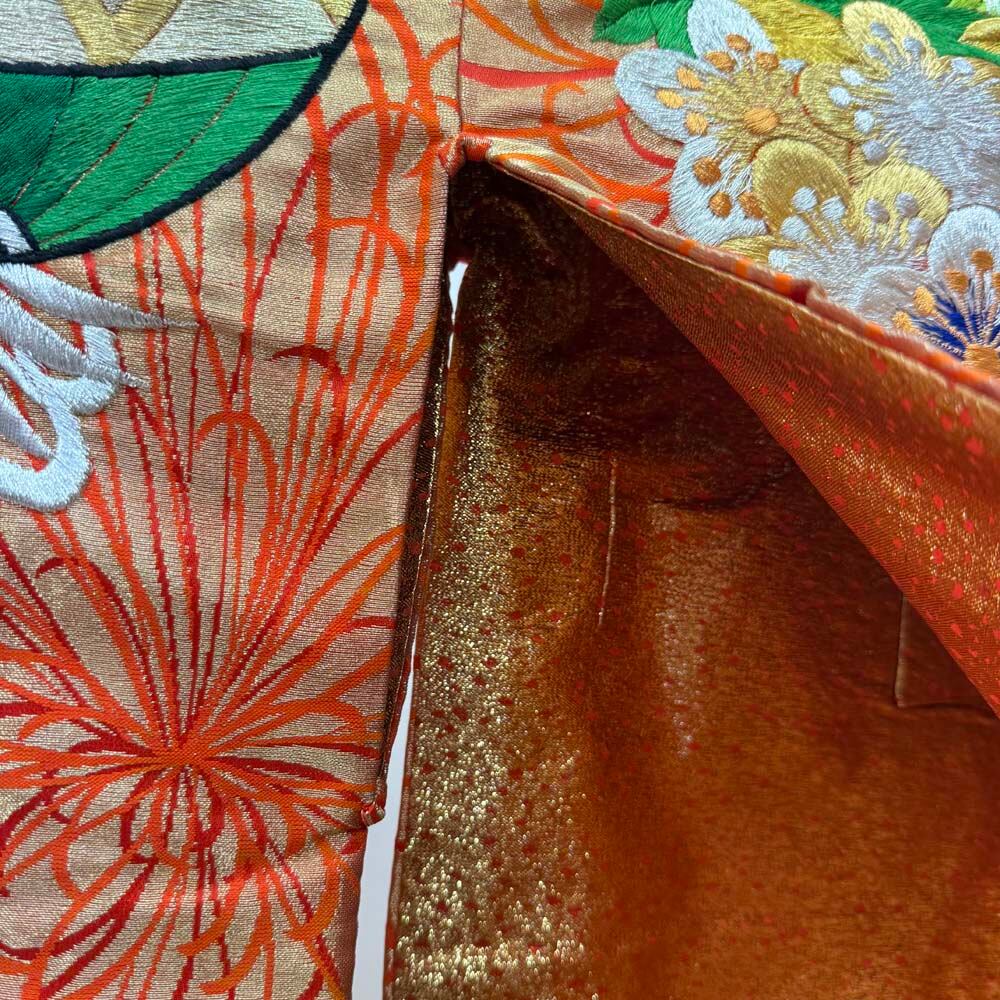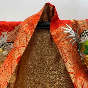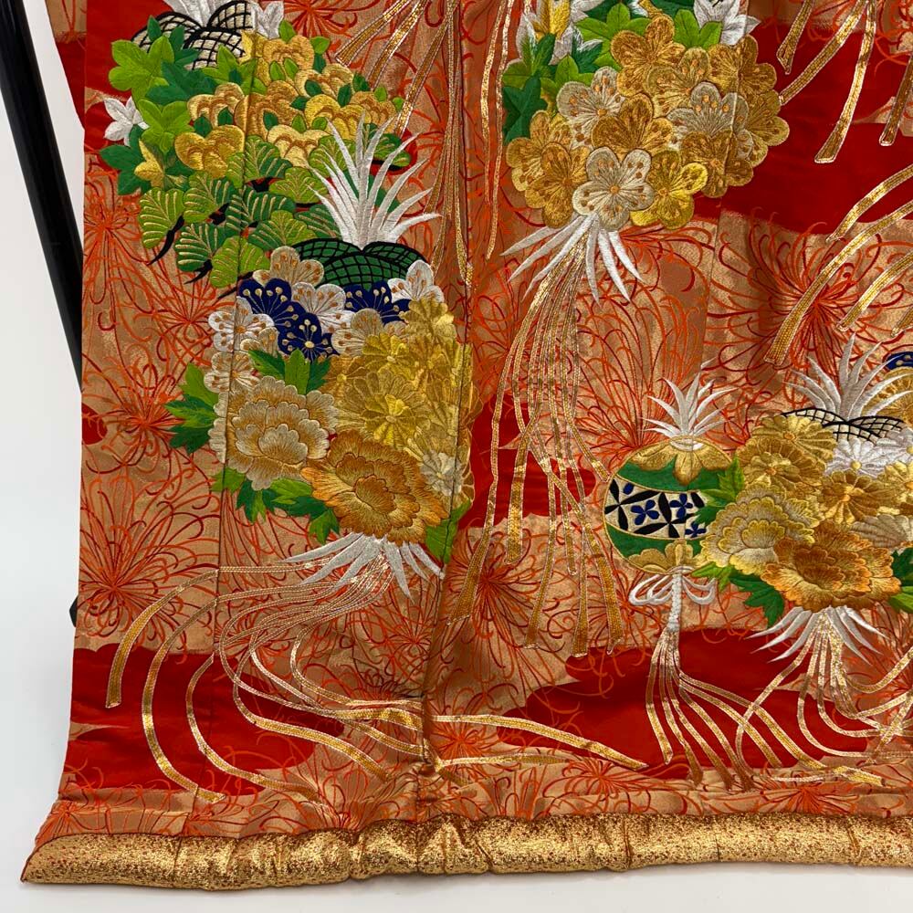 色打掛 正絹 鶴 刺繍 赤 橙 打掛 花嫁衣裳 婚礼 リサイクル 中古 ブライダル ウエディング 着物 4921