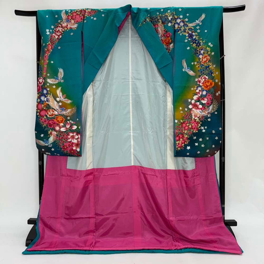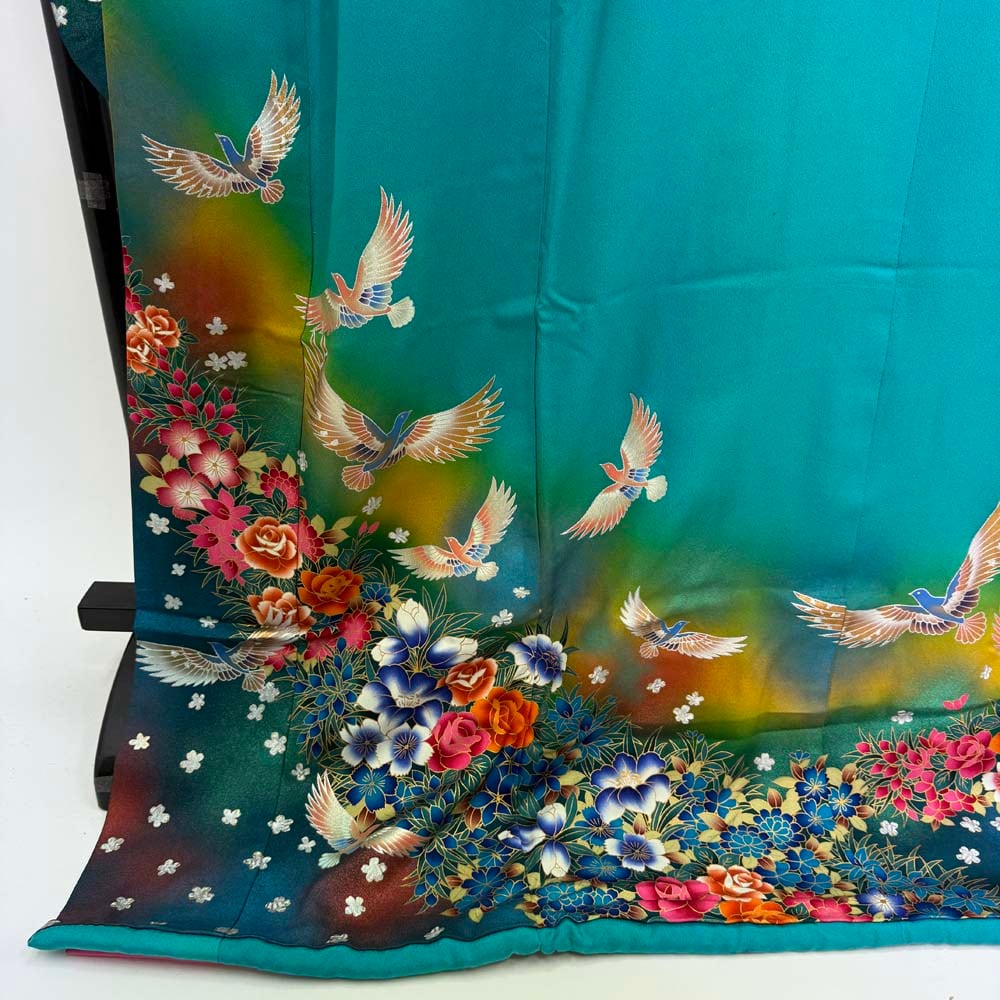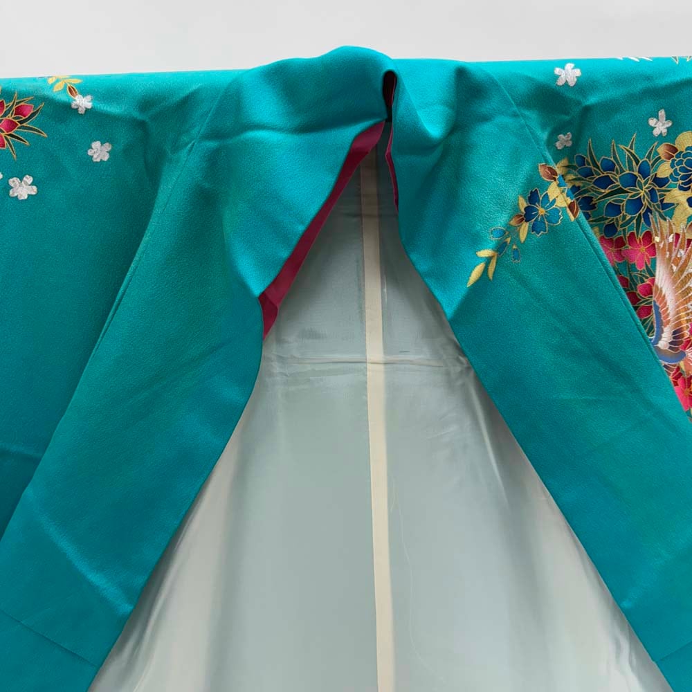 本振袖 引き振袖 正絹 緑色 花柄 古典 刺繍 結婚式 裄66.5cm 身丈188cm Cランク 花嫁衣装 Mサイズ 4935