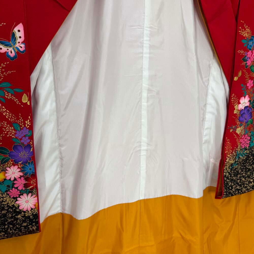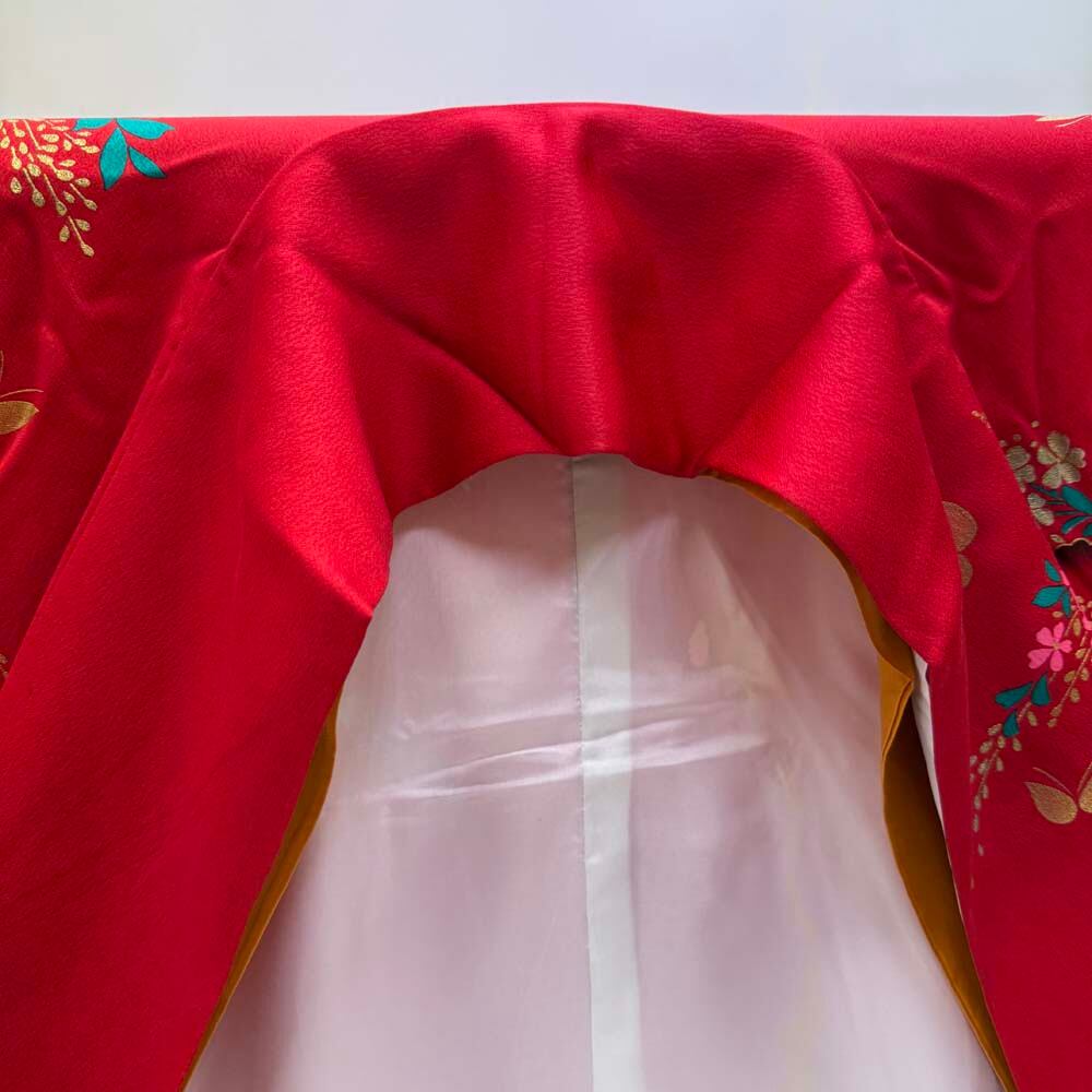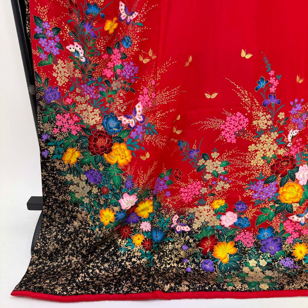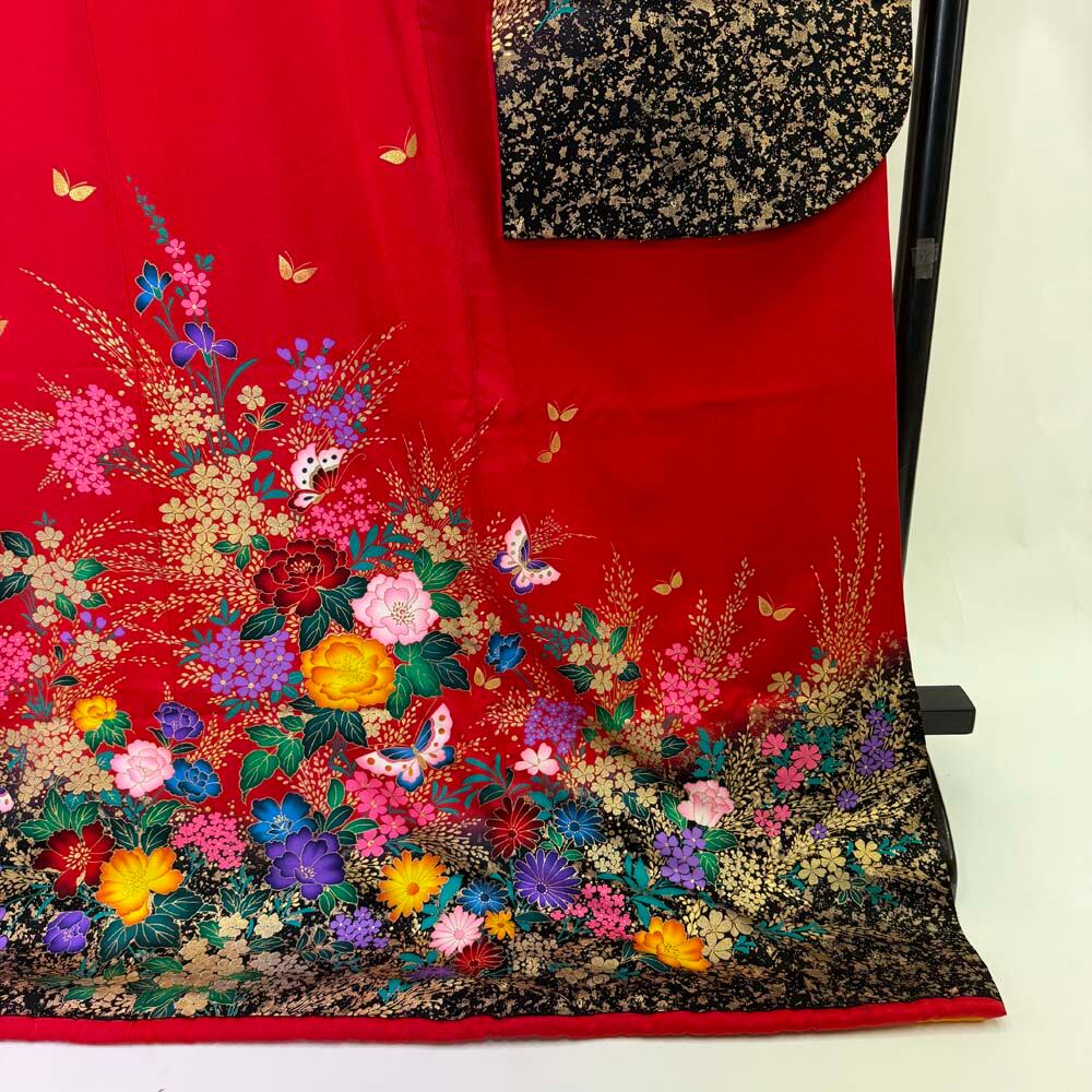 本振袖 引き振袖 正絹 赤色 花柄 古典 刺繍 結婚式 裄65cm 身丈185cm Bランク 花嫁衣装 Mサイズ 4937