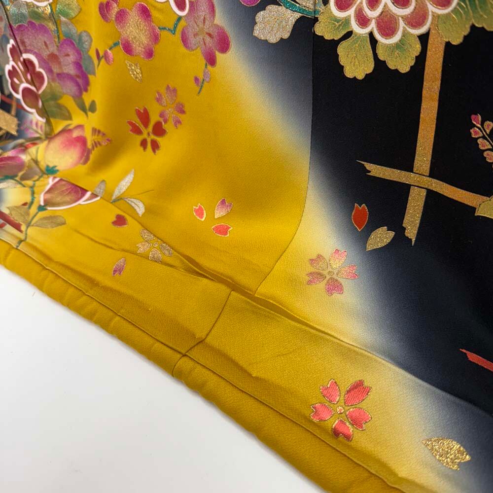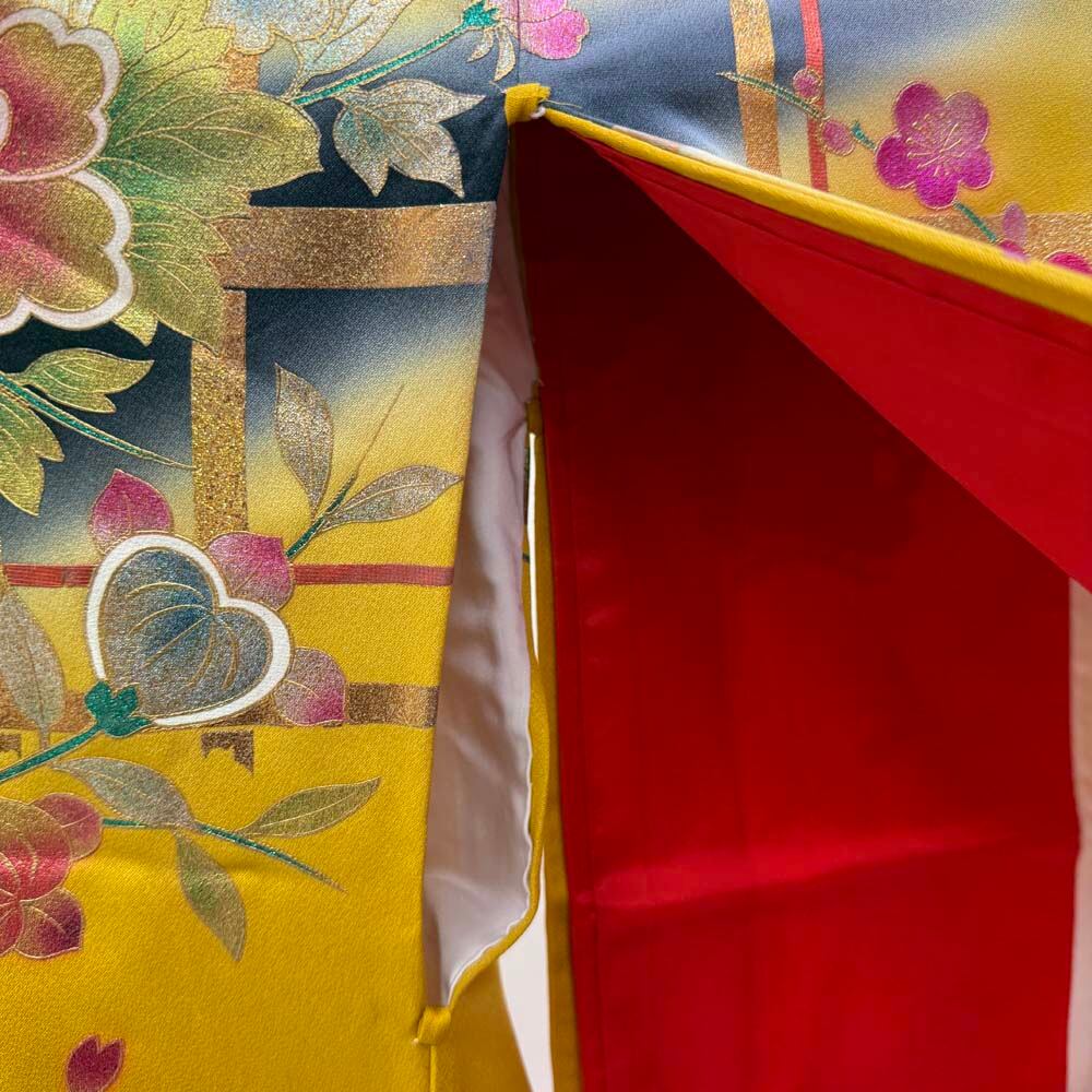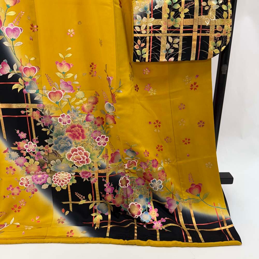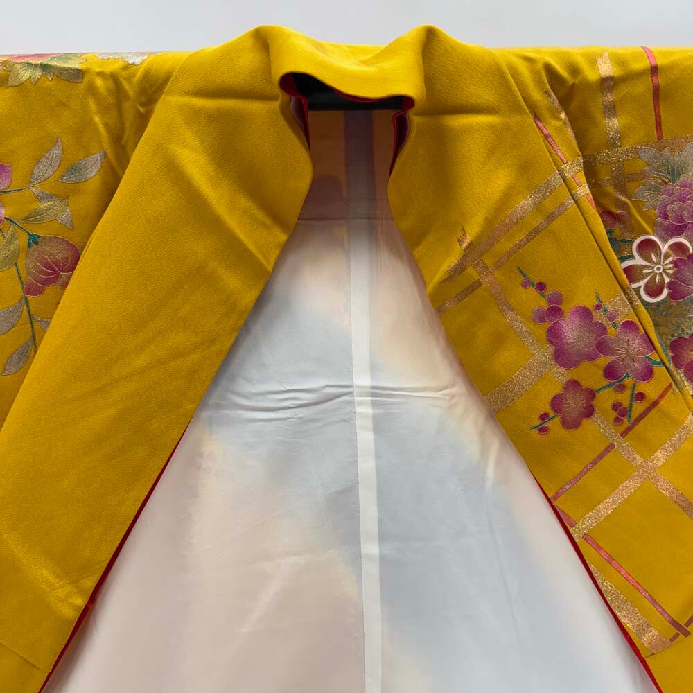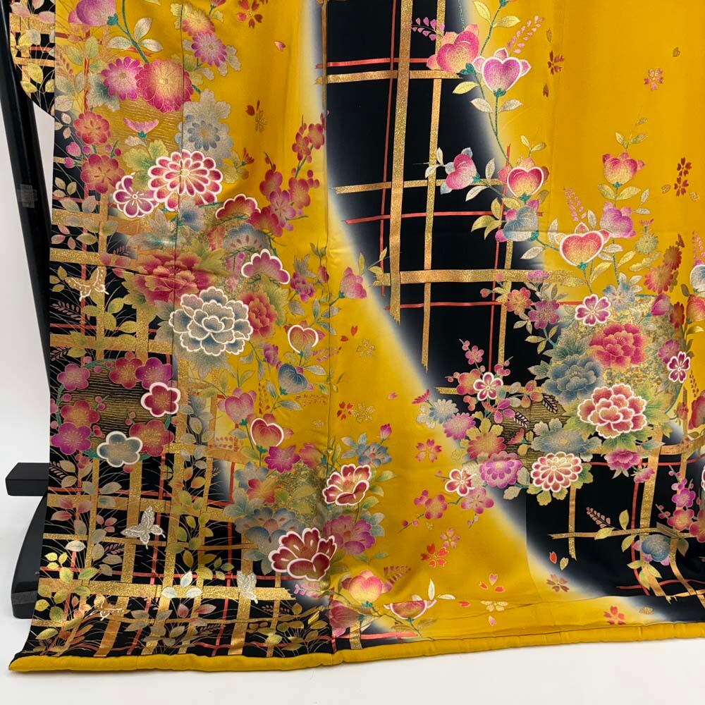 本振袖 引き振袖 正絹 黄色 花柄 古典 刺繍 結婚式 裄64.5cm 身丈181cm Bランク 花嫁衣装 Mサイズ 4938