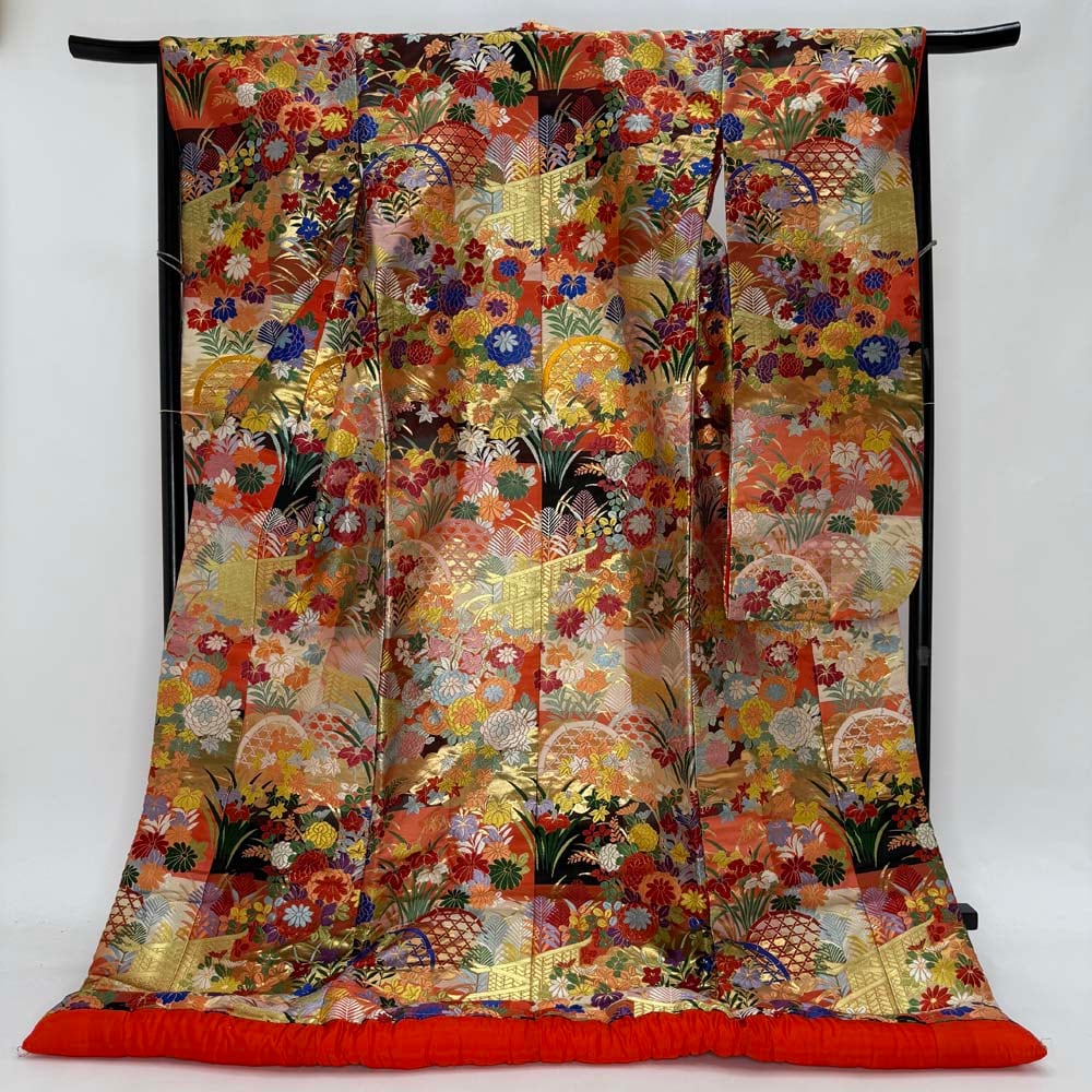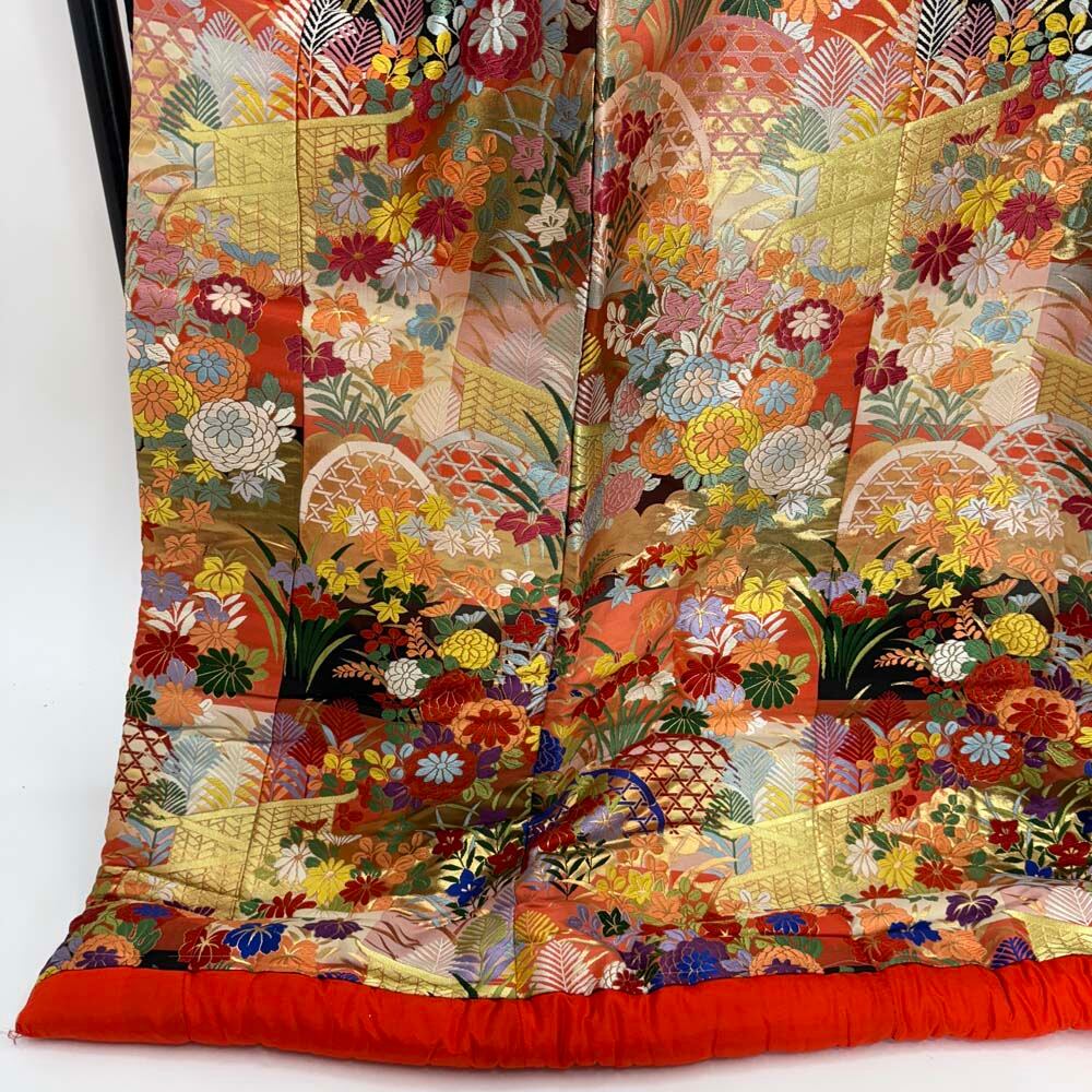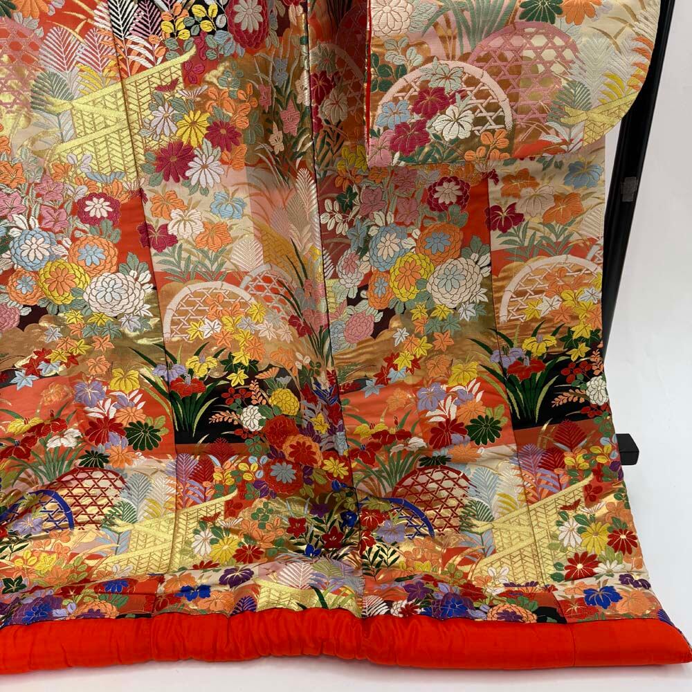 色打掛 正絹 鶴 刺繍 ゴールド 打掛 花嫁衣裳 婚礼 リサイクル 中古 ブライダル ウエディング 着物 5016