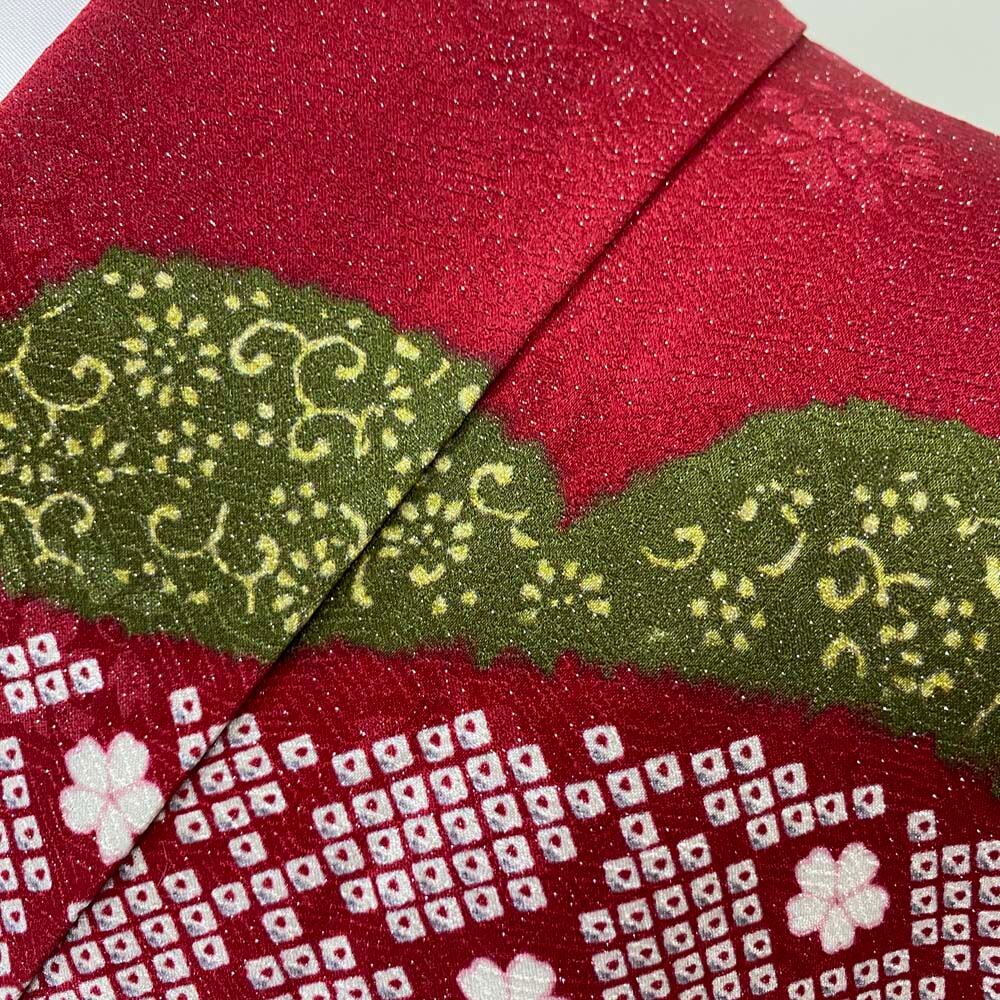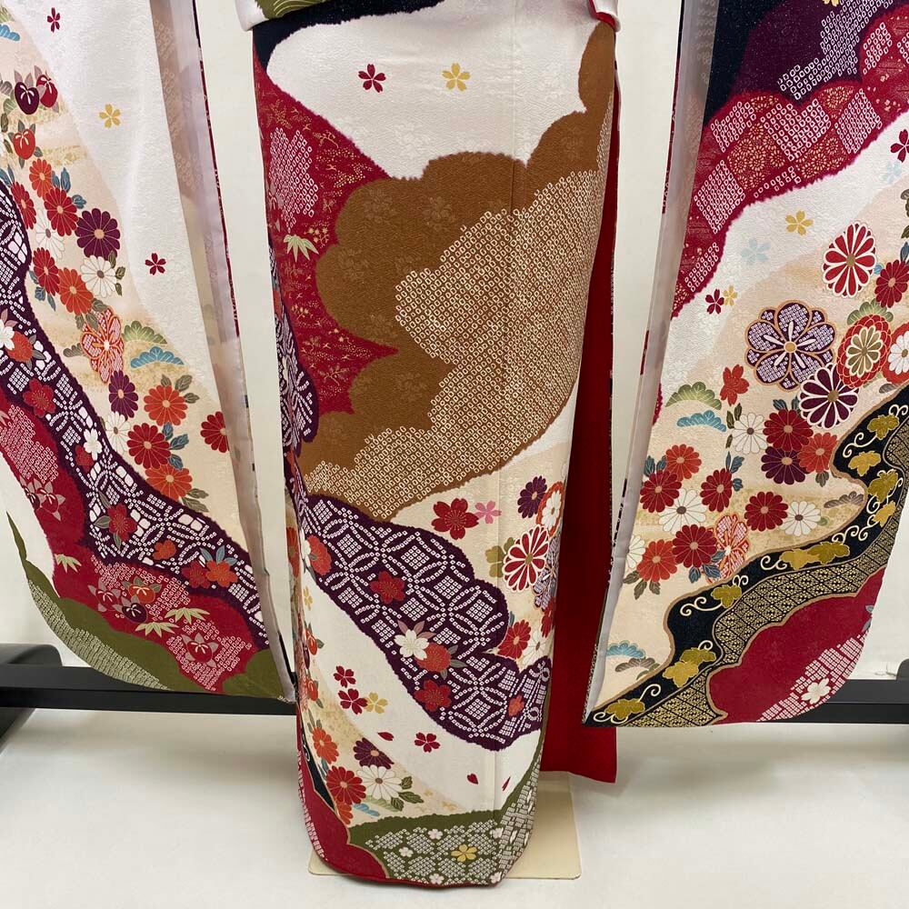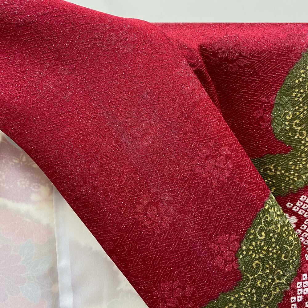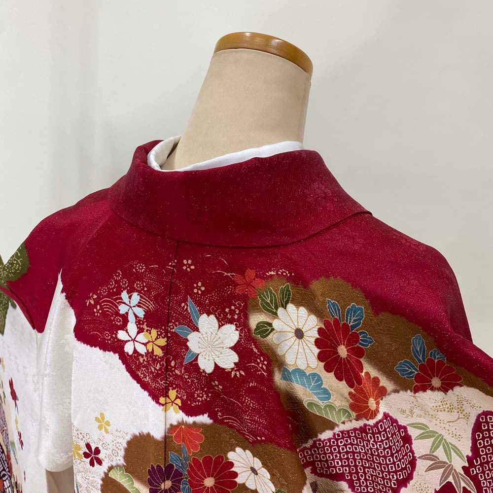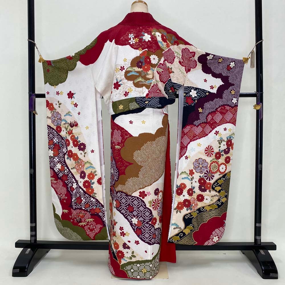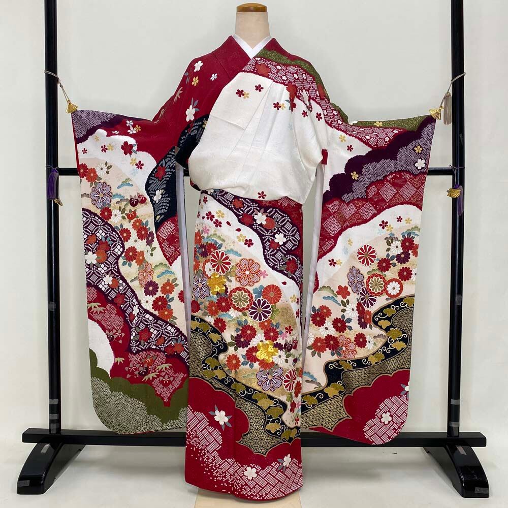 振袖 中古 赤 白 正絹 古典 裄66cm 身丈167cm 美品 M サイズ 成人式 5061