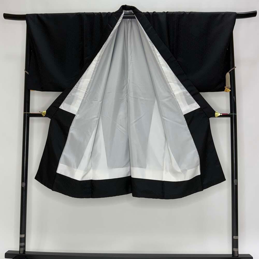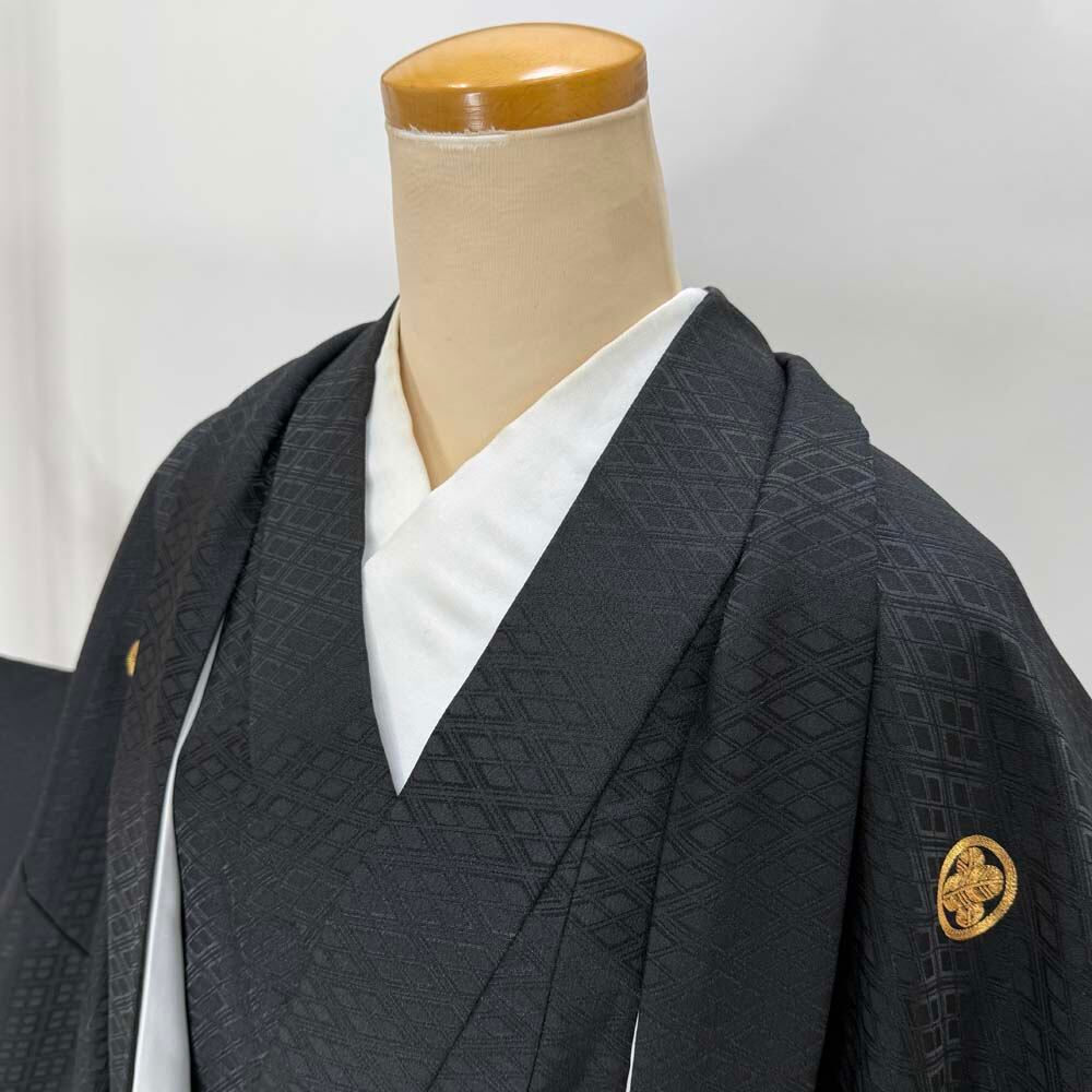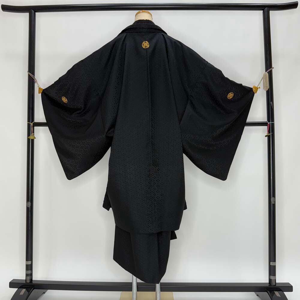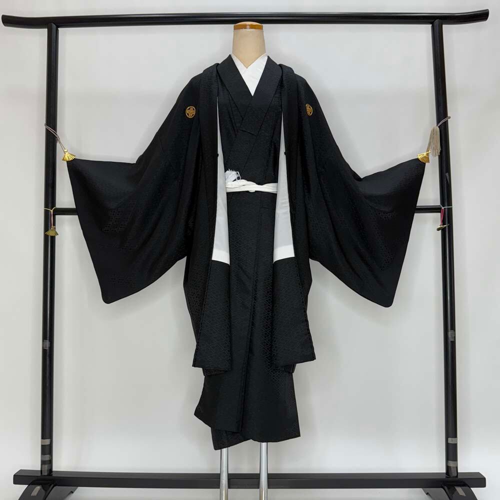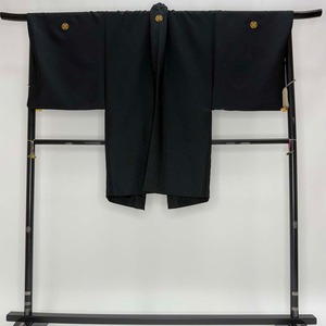男紋付 2点セット 男着物 紋付 ポリエステル 羽織 長着 裄74.5cm 2L size 黒 五つ紋 中古 成人式 5042