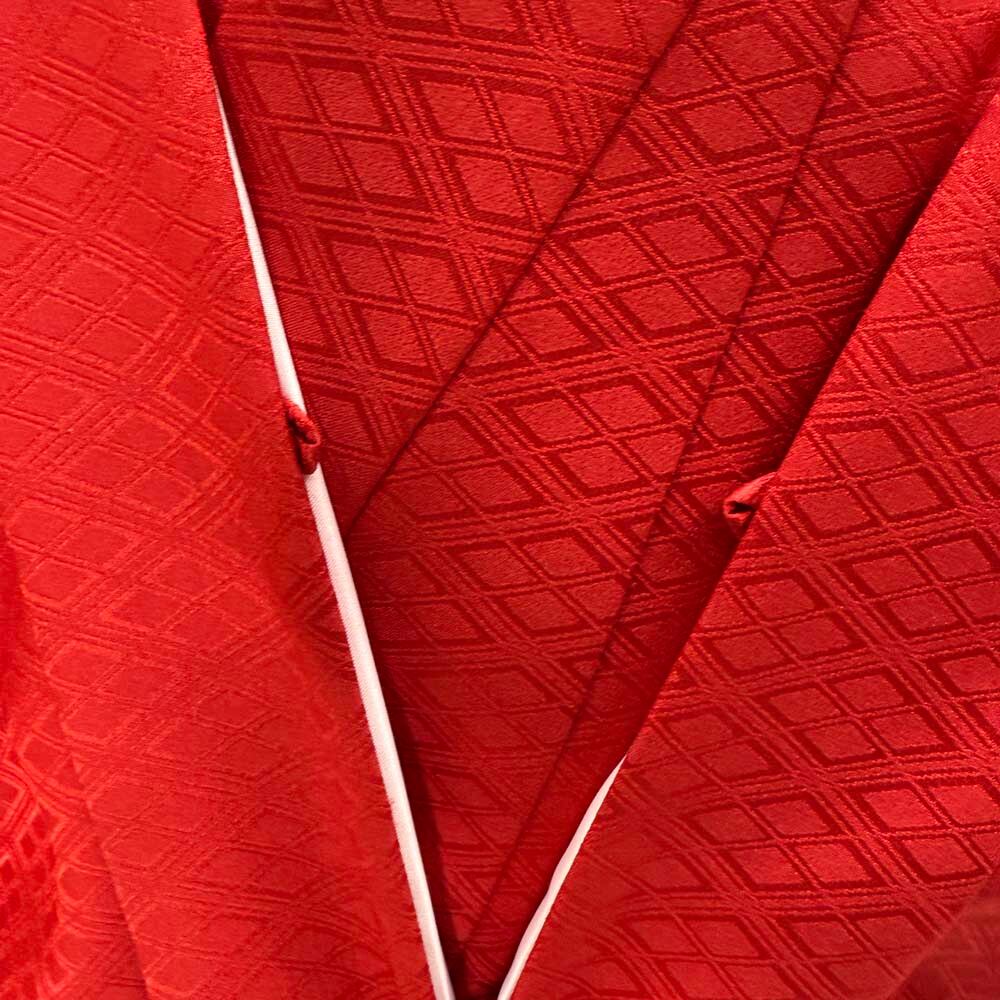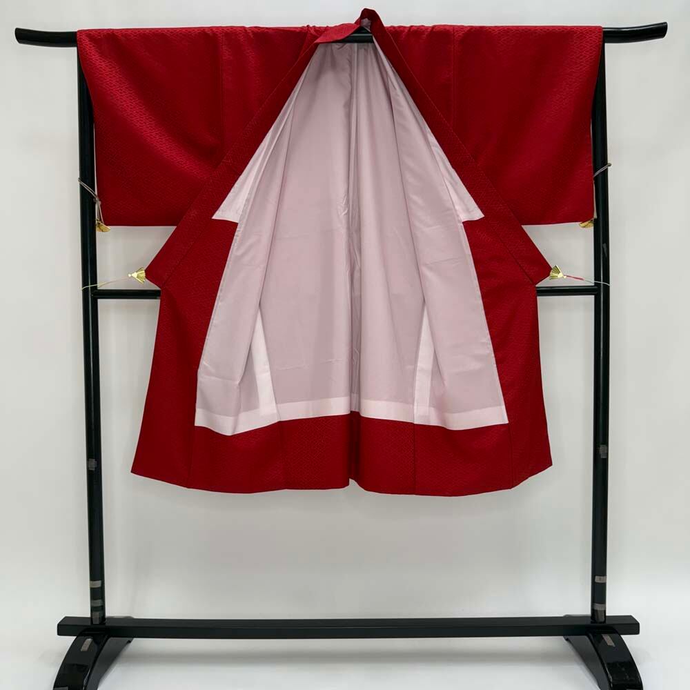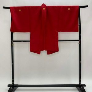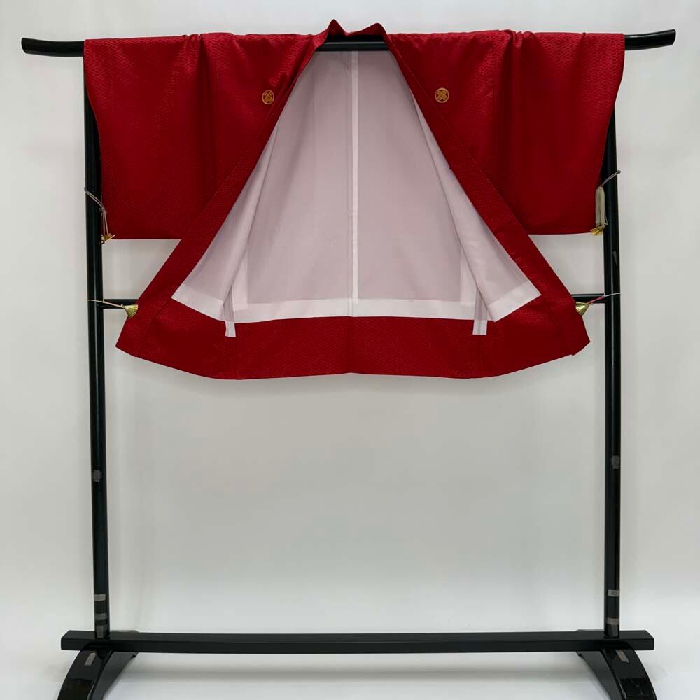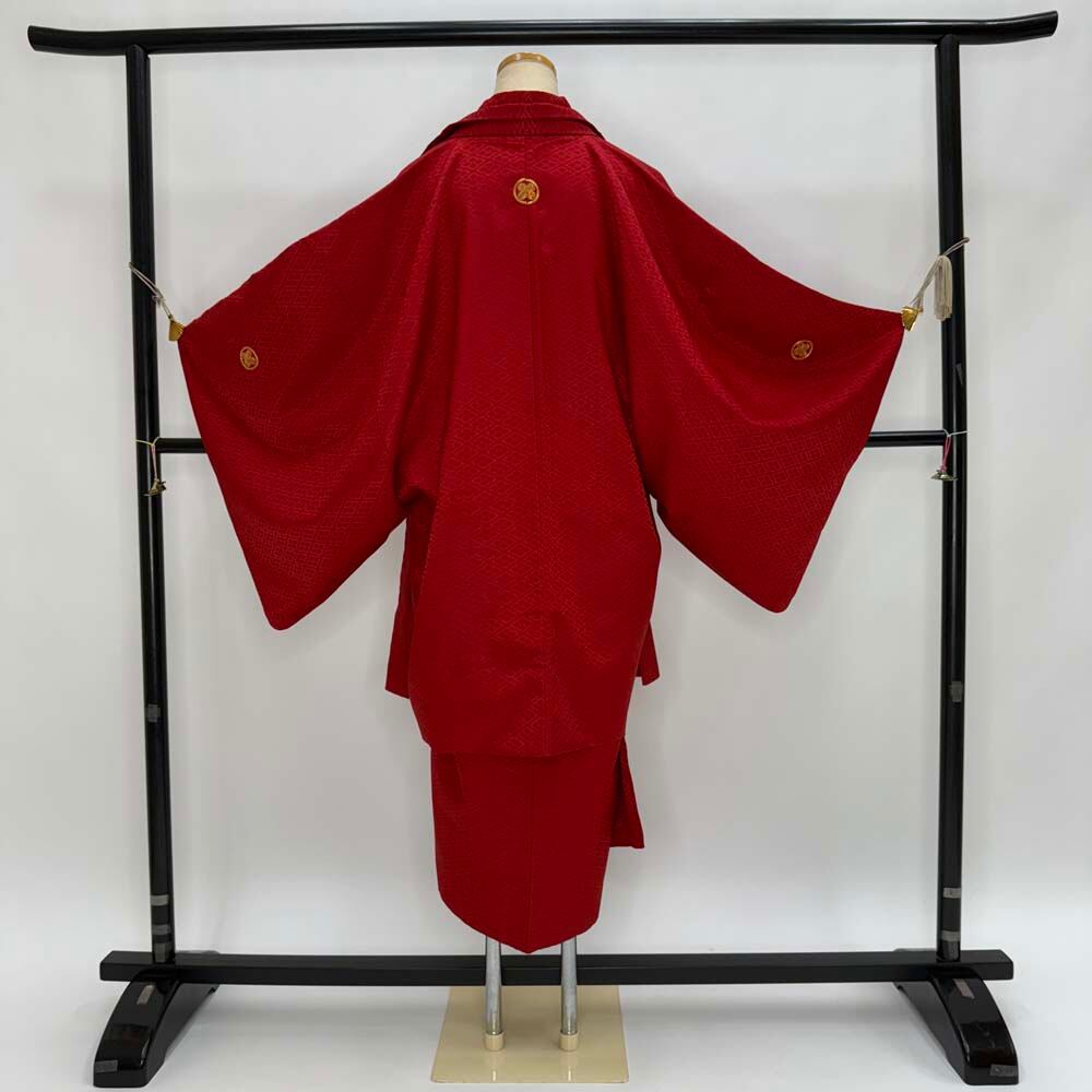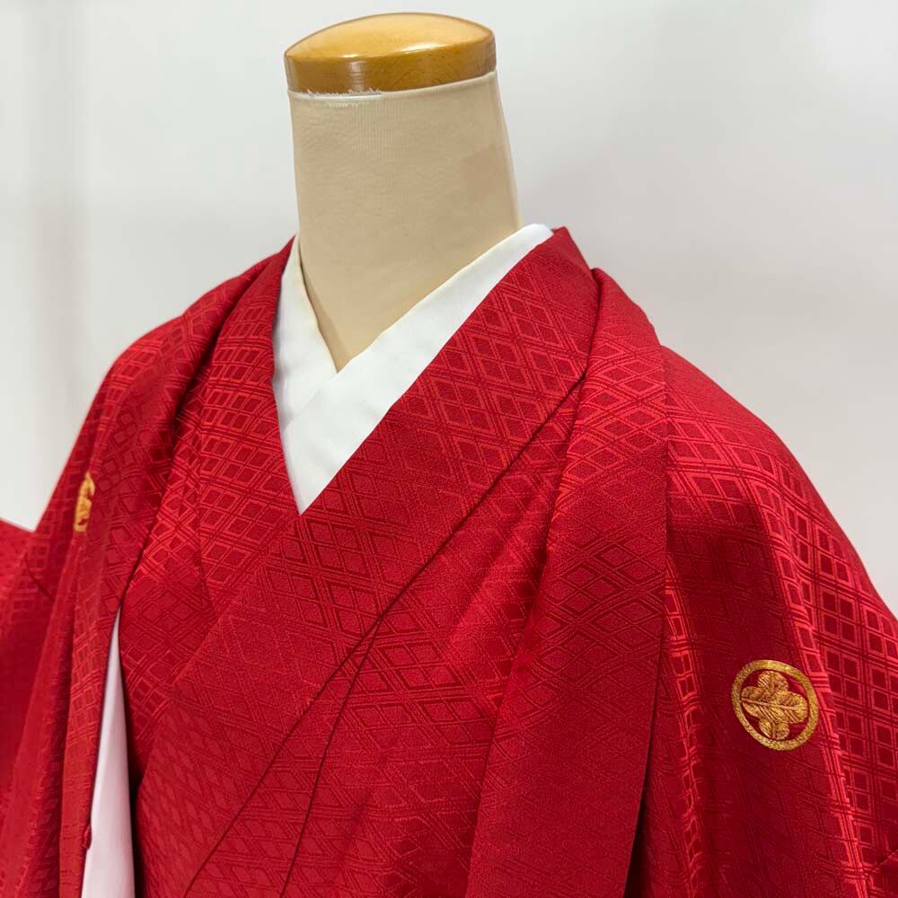 男紋付 2点セット 男着物 紋付 ポリエステル 羽織 長着 裄73cm L size 赤 五つ紋 中古 成人式 5049