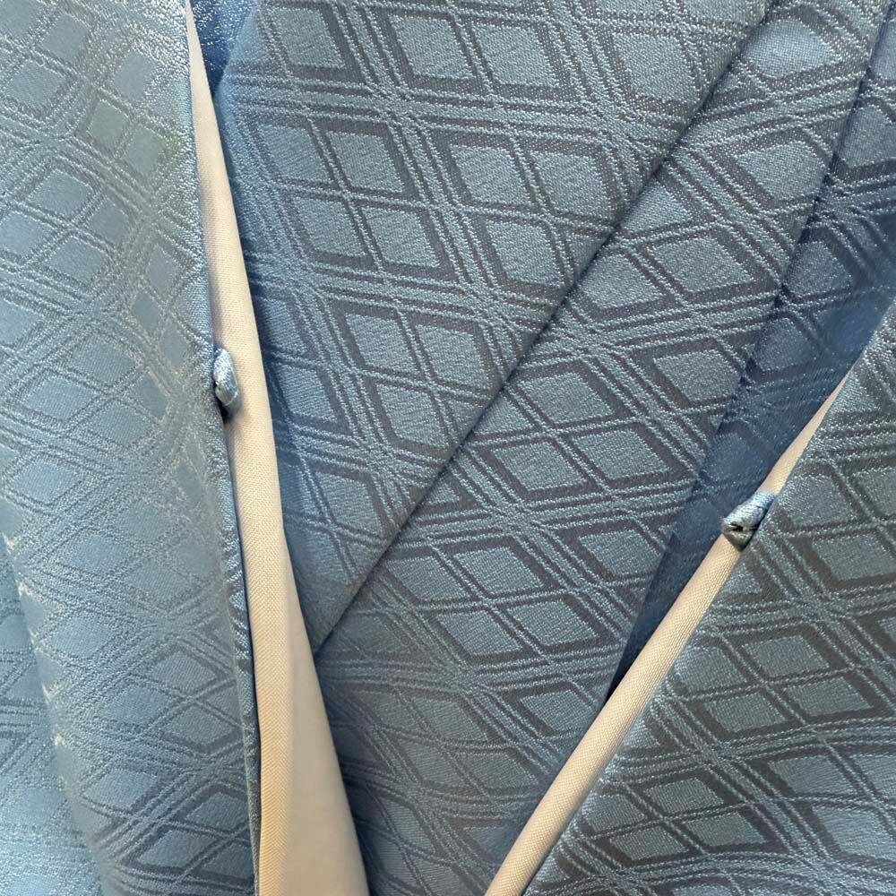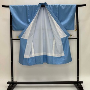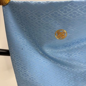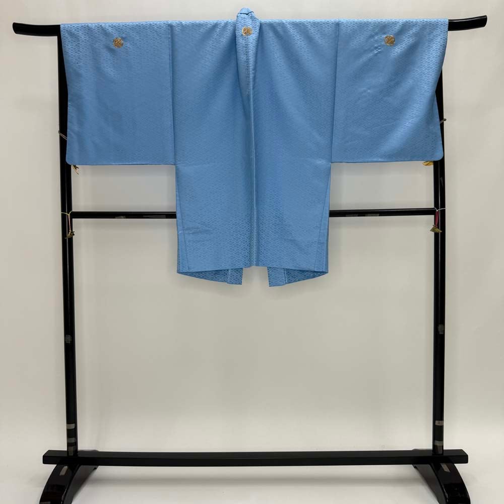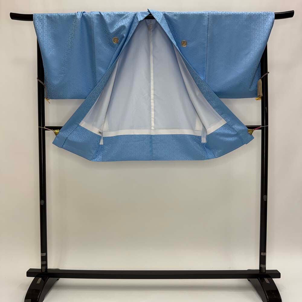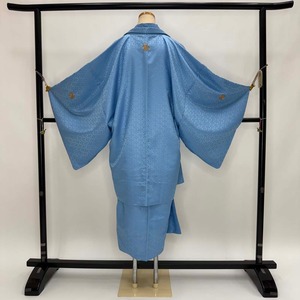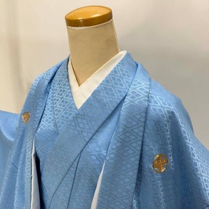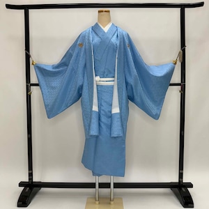 男紋付 2点セット 男着物 紋付 ポリエステル 羽織 長着 裄73.8cm L size 水色 五つ紋 中古 成人式 5051
