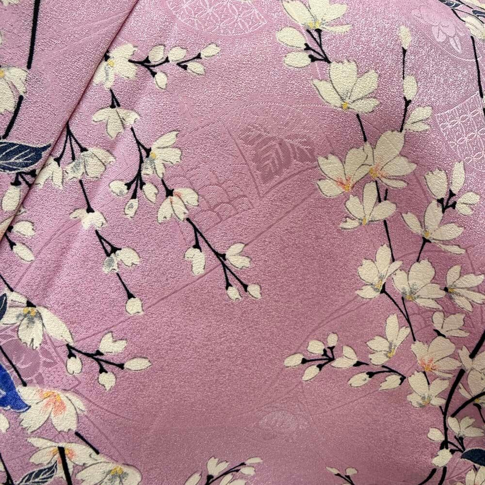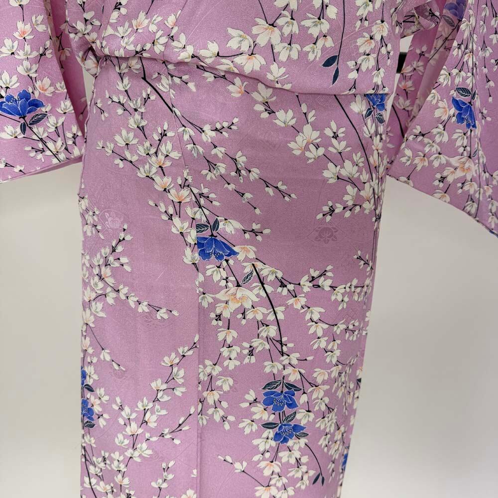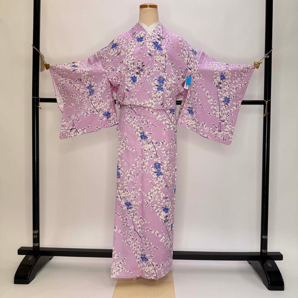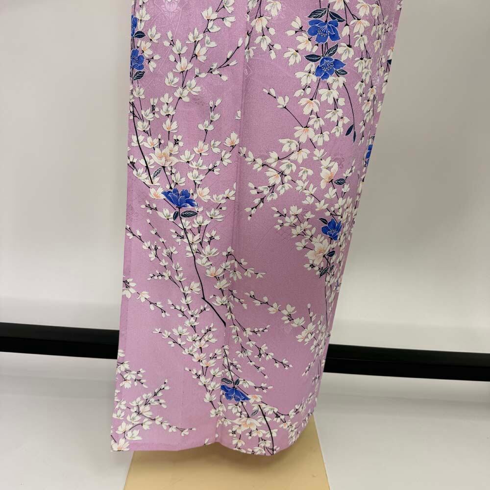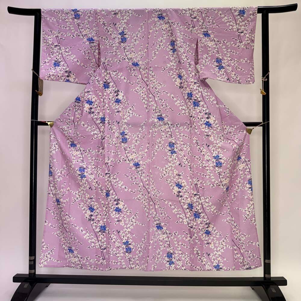 小紋 単衣 洗える着物 裄61.5cm 身丈154.5cm ピンク 花柄 お洒落着 普段着 ポリエステル 美品 S サイズ 5252