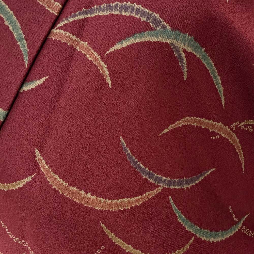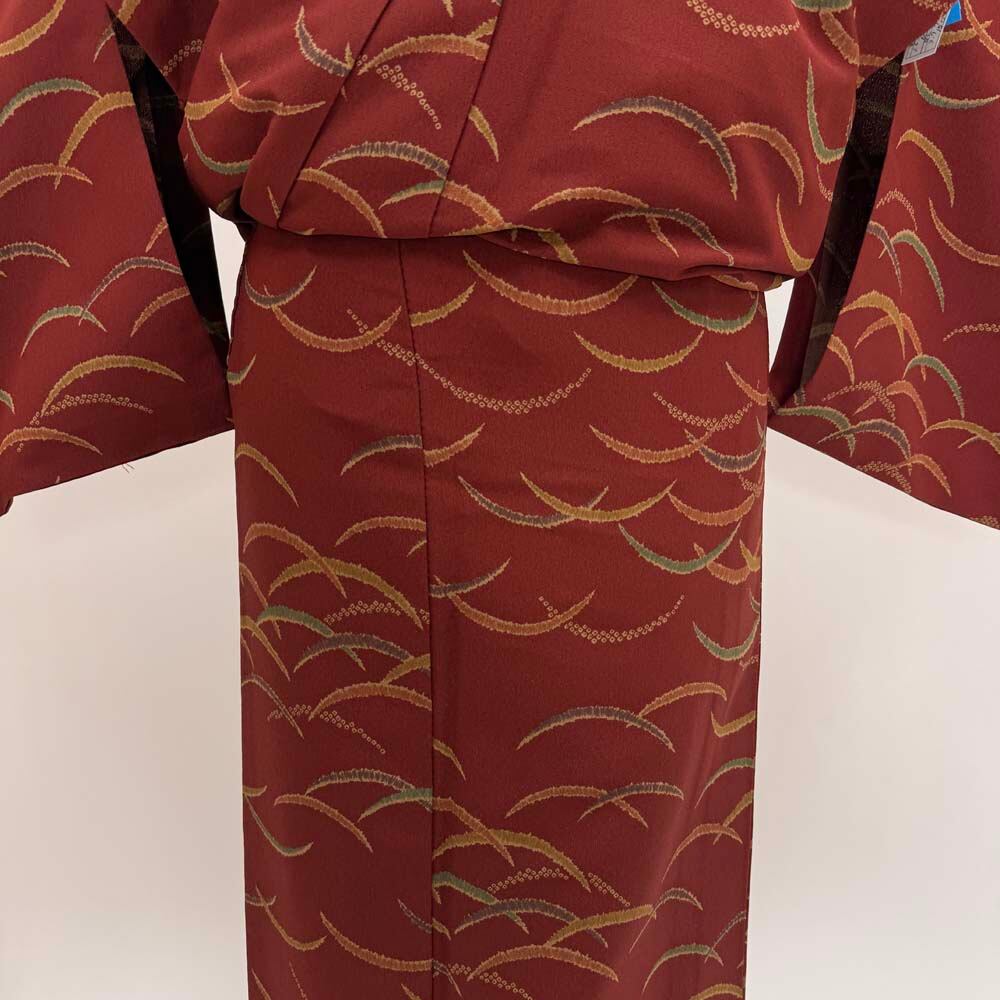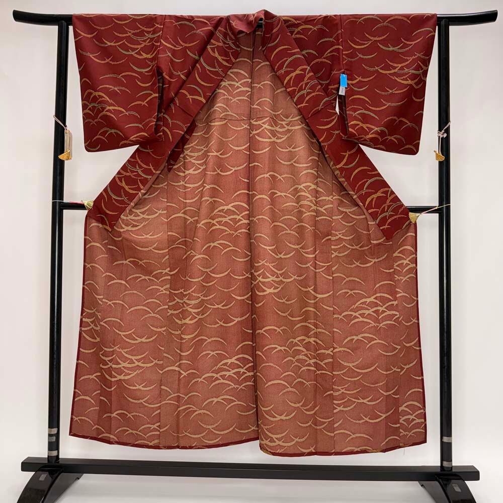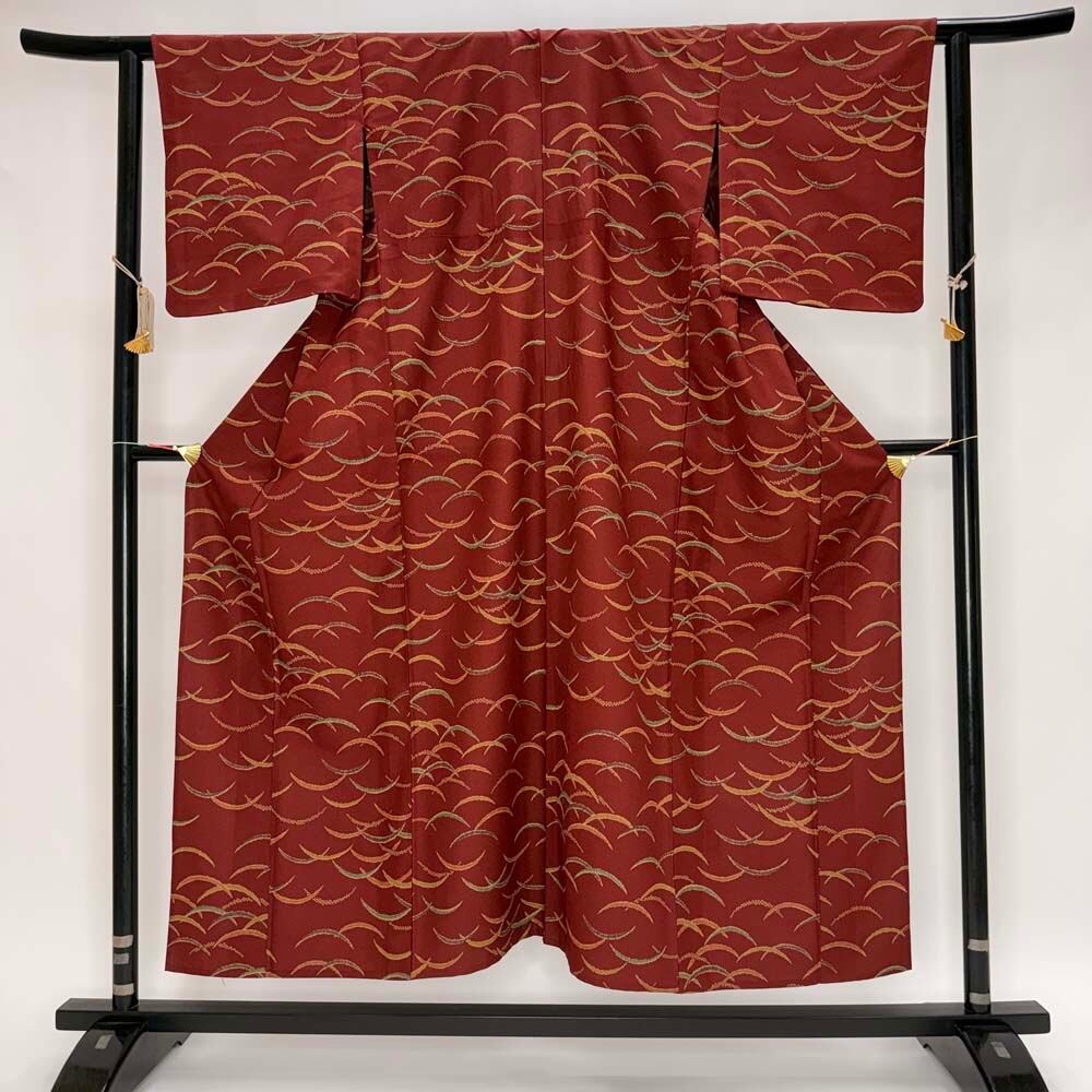 小紋 単衣 洗える着物 裄61.2cm 身丈150cm えんじ 花柄 お洒落着 普段着 ポリエステル 美品 S サイズ 5254
