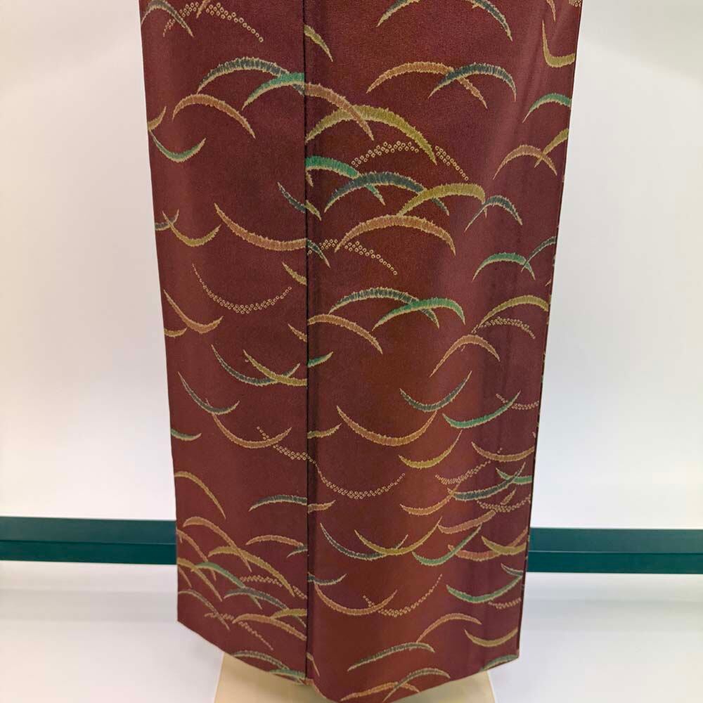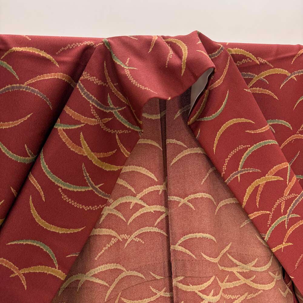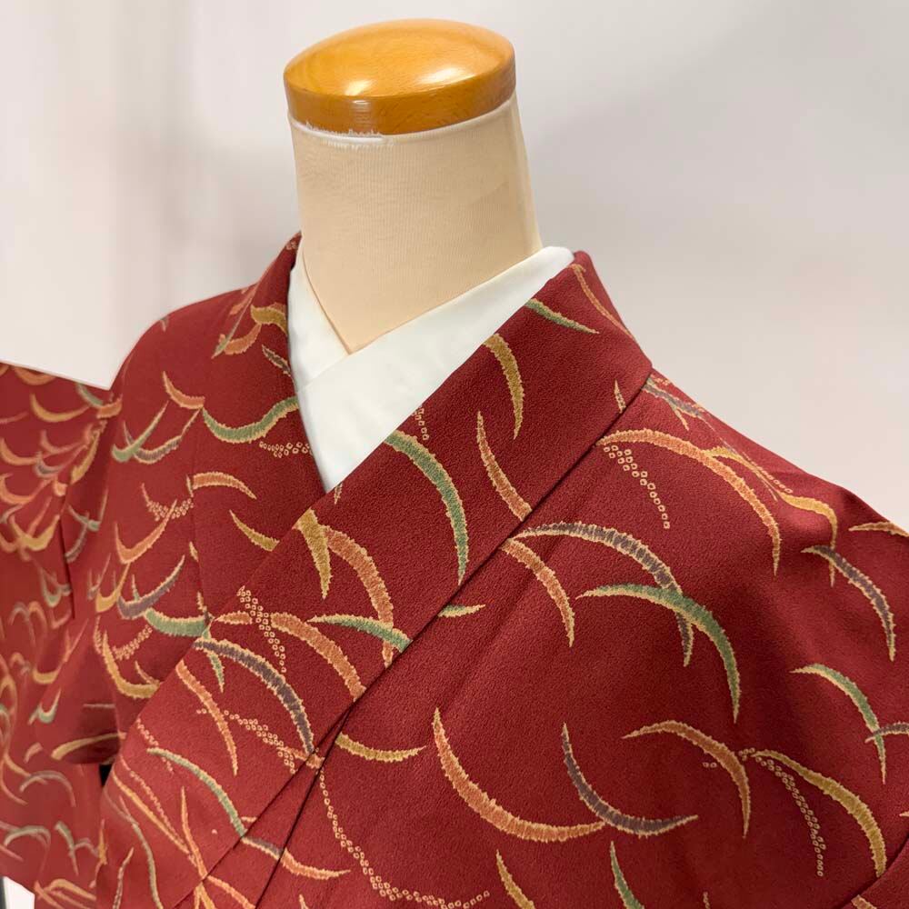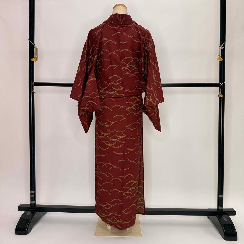小紋 単衣 洗える着物 裄61.2cm 身丈150cm えんじ 花柄 お洒落着 普段着 ポリエステル 美品 S サイズ 5254