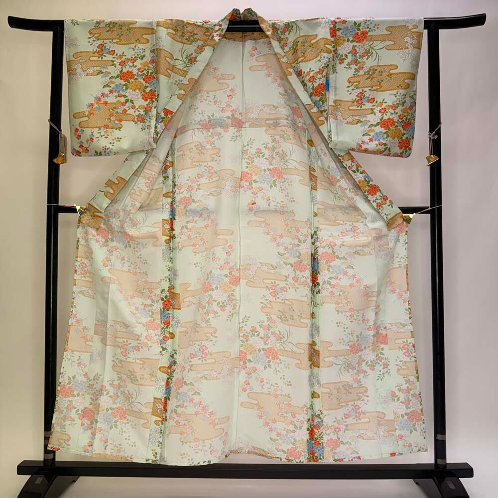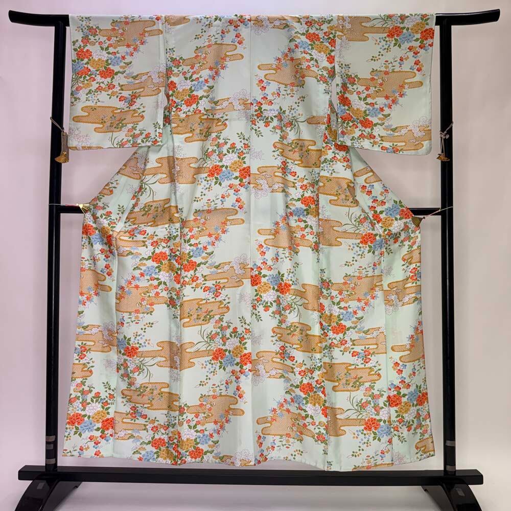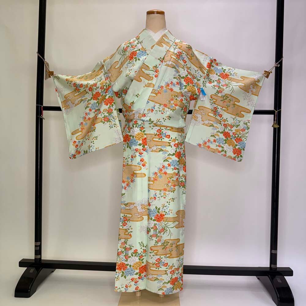 小紋 単衣 洗える着物 裄62cm 身丈155cm 緑 花柄 お洒落着 普段着 ポリエステル 美品 S サイズ 5256