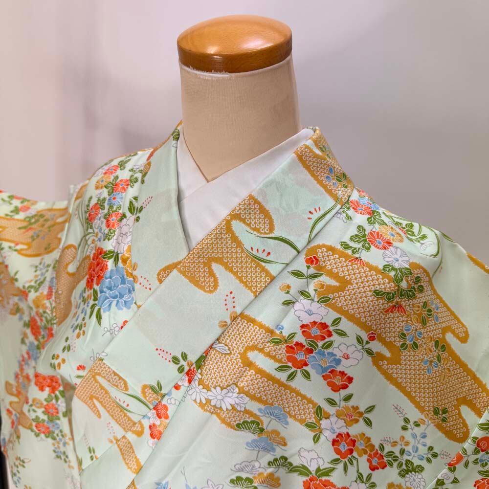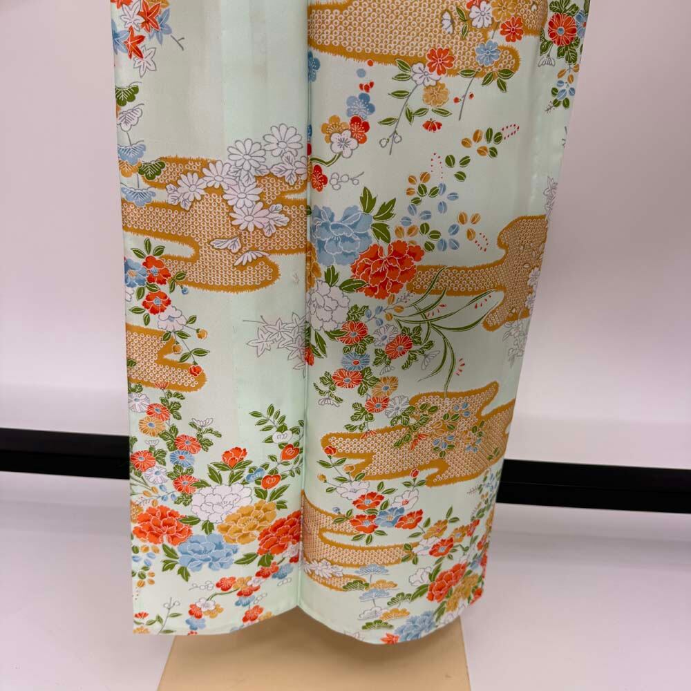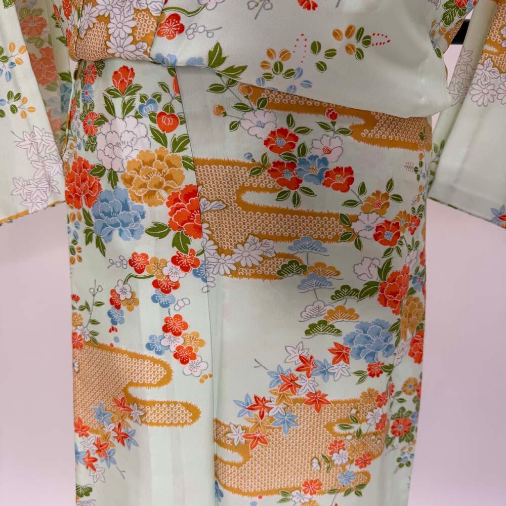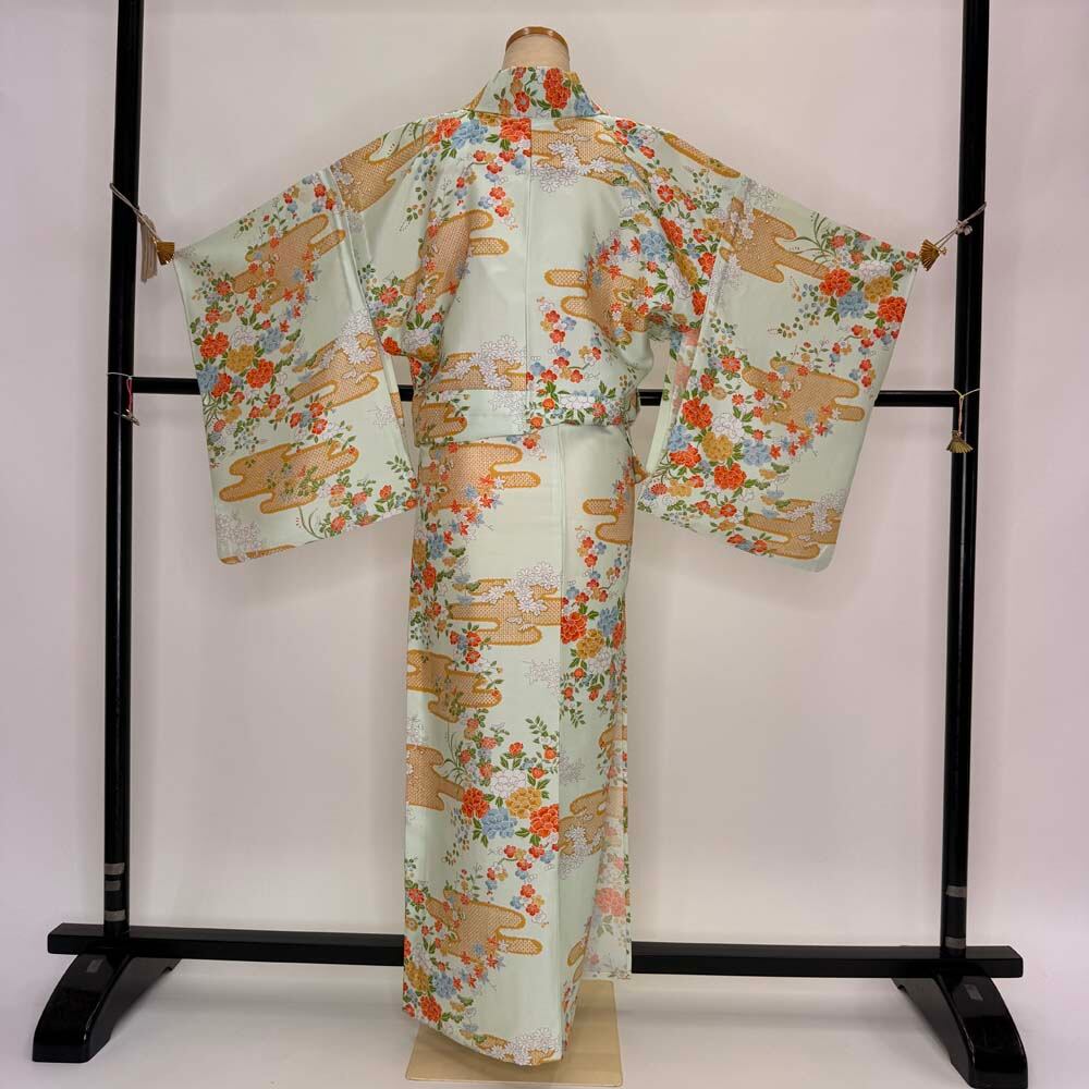 小紋 単衣 洗える着物 裄62cm 身丈155cm 緑 花柄 お洒落着 普段着 ポリエステル 美品 S サイズ 5256