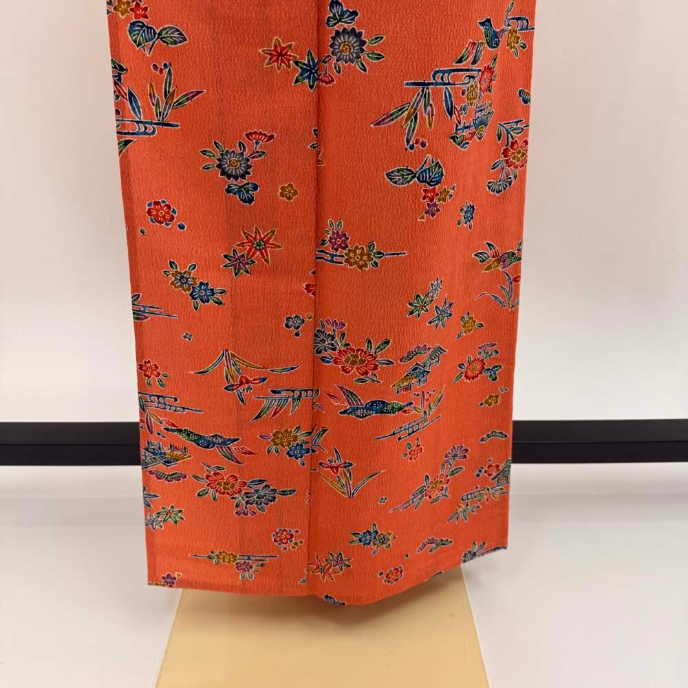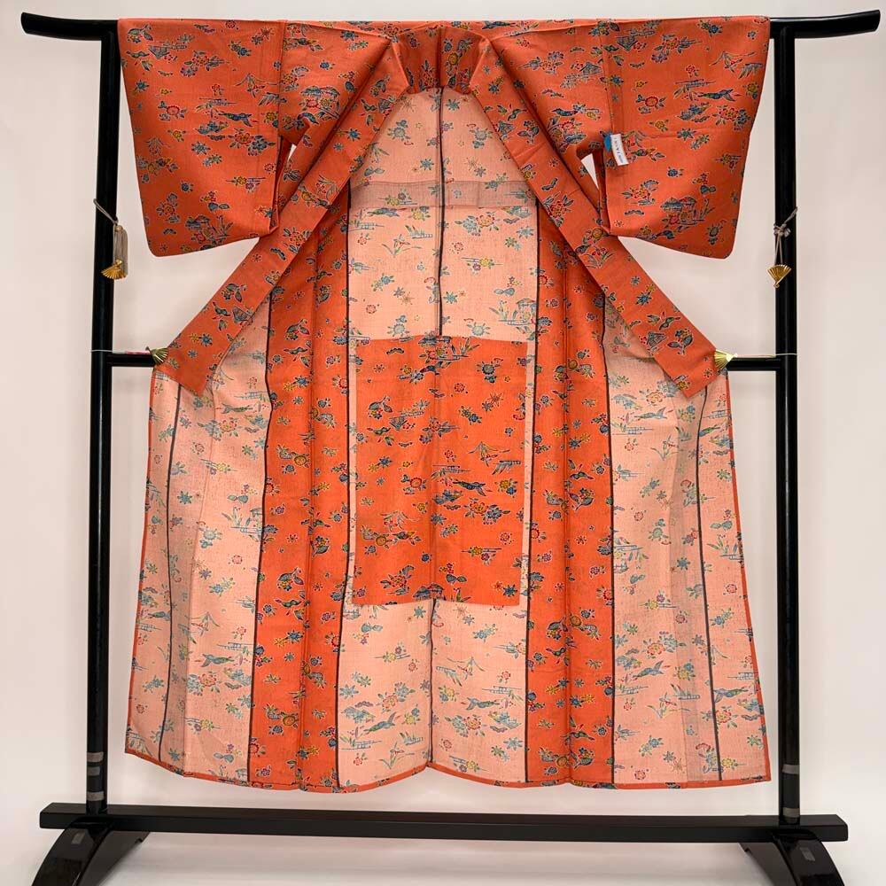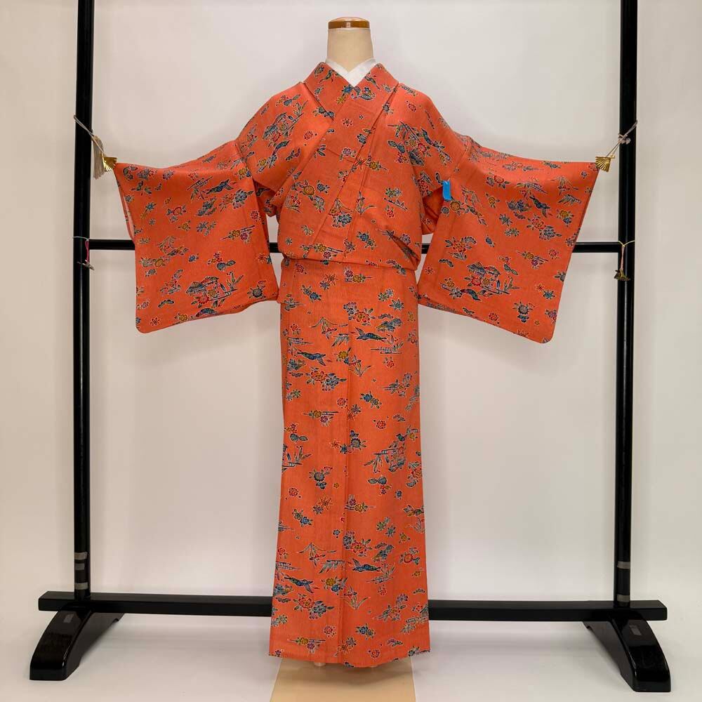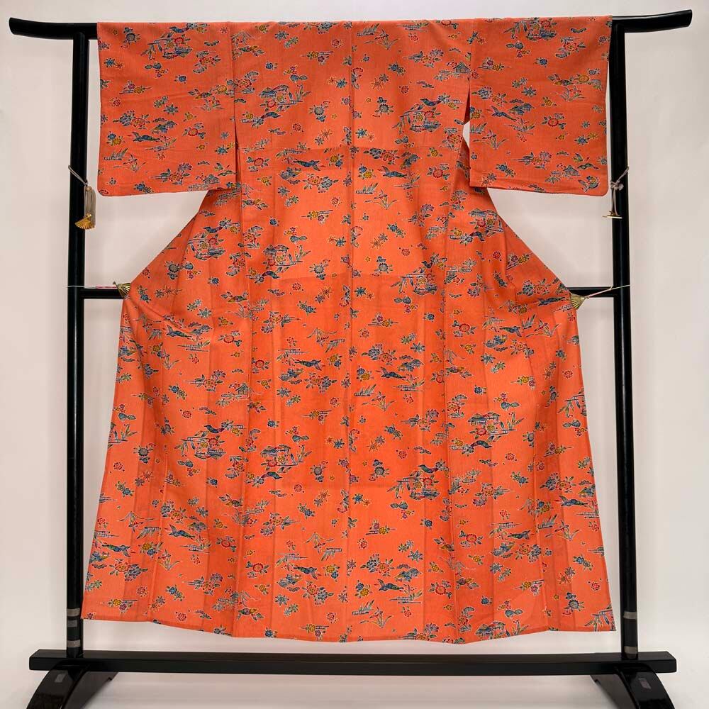 小紋 単衣 洗える着物 裄62.3cm 身丈153cm オレンジ 花柄 お洒落着 普段着 ポリエステル 美品 S サイズ 5257