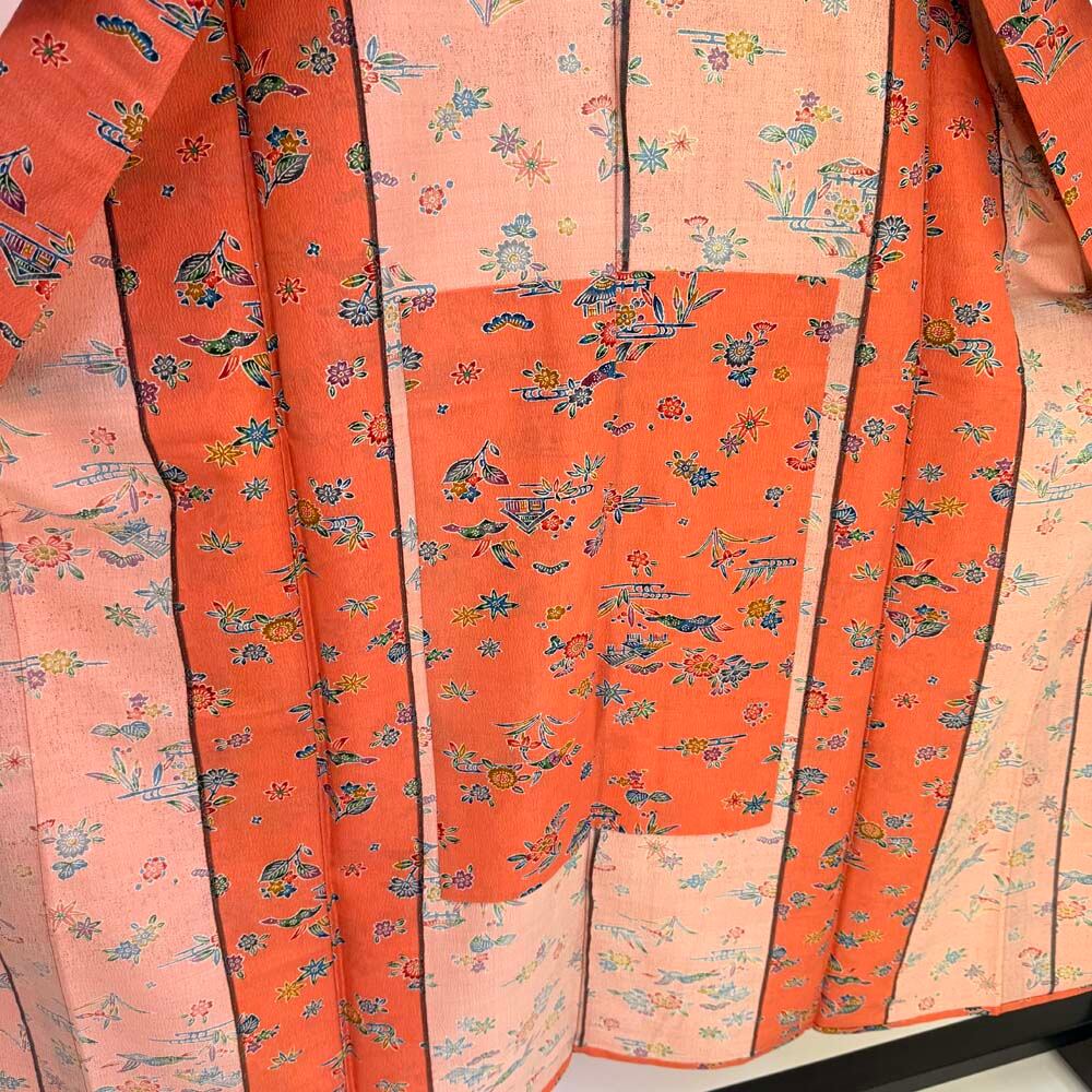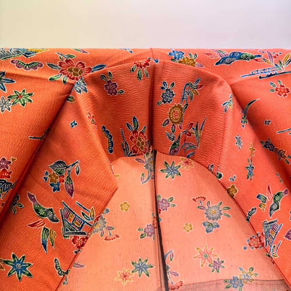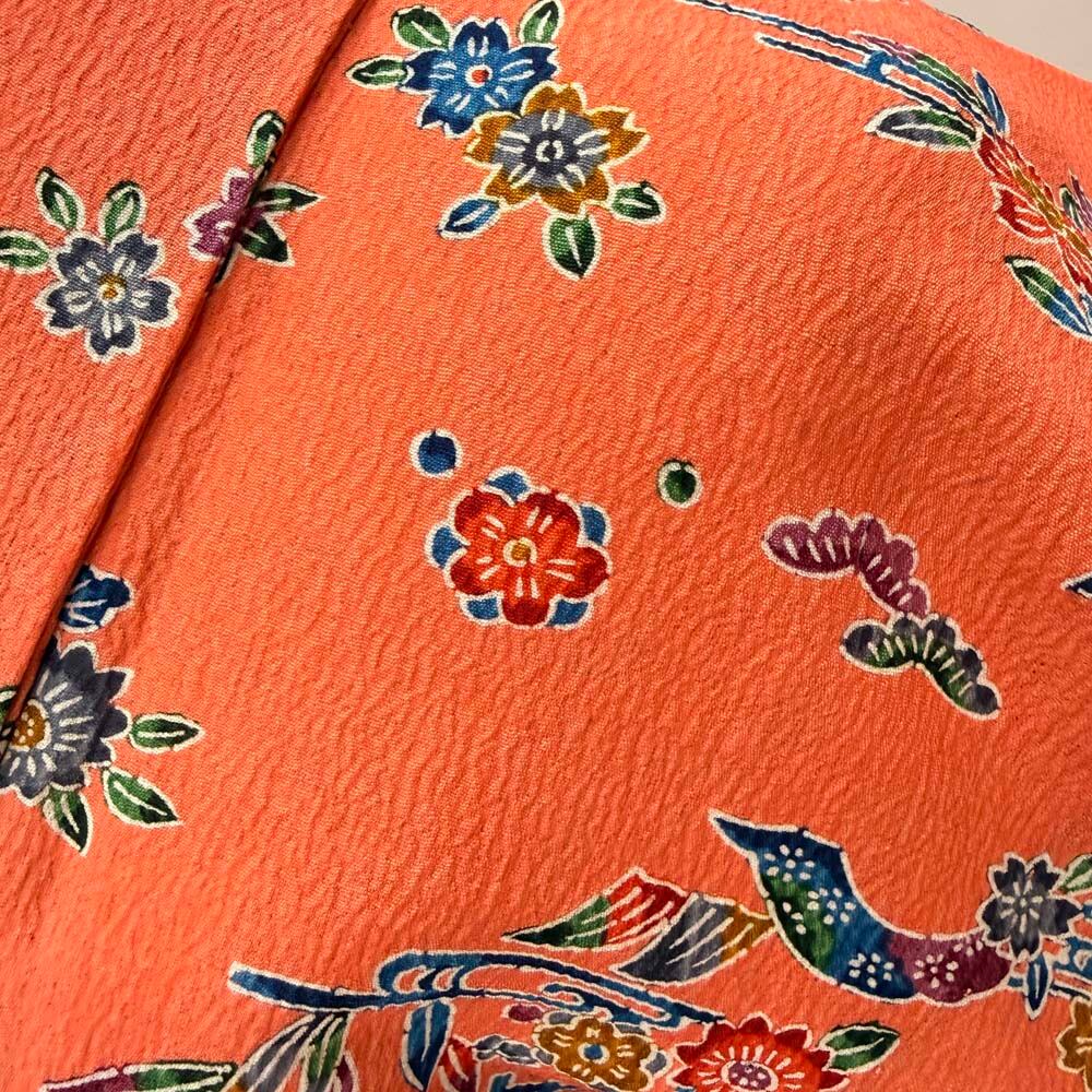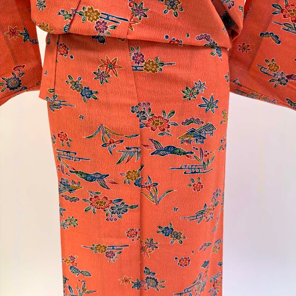 小紋 単衣 洗える着物 裄62.3cm 身丈153cm オレンジ 花柄 お洒落着 普段着 ポリエステル 美品 S サイズ 5257