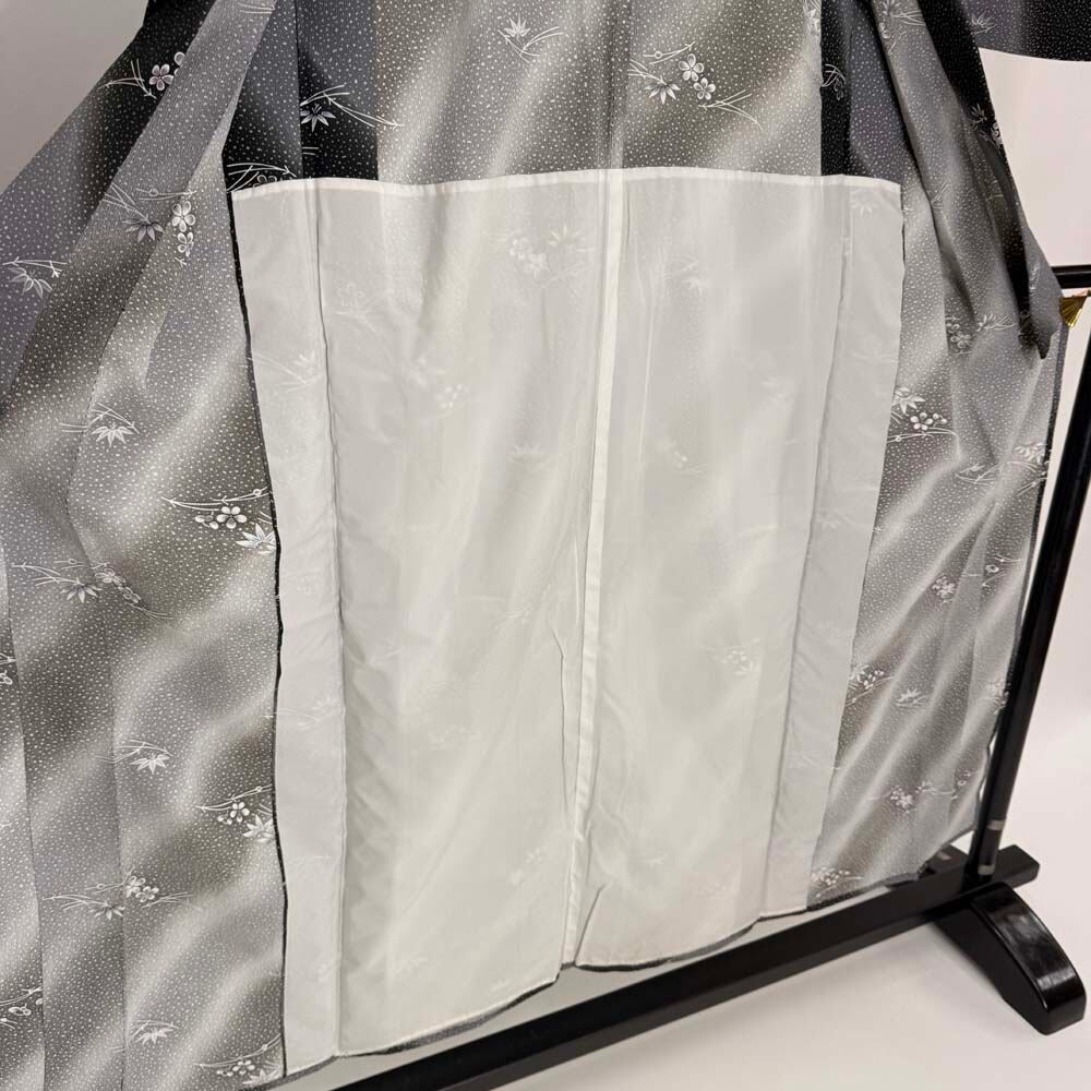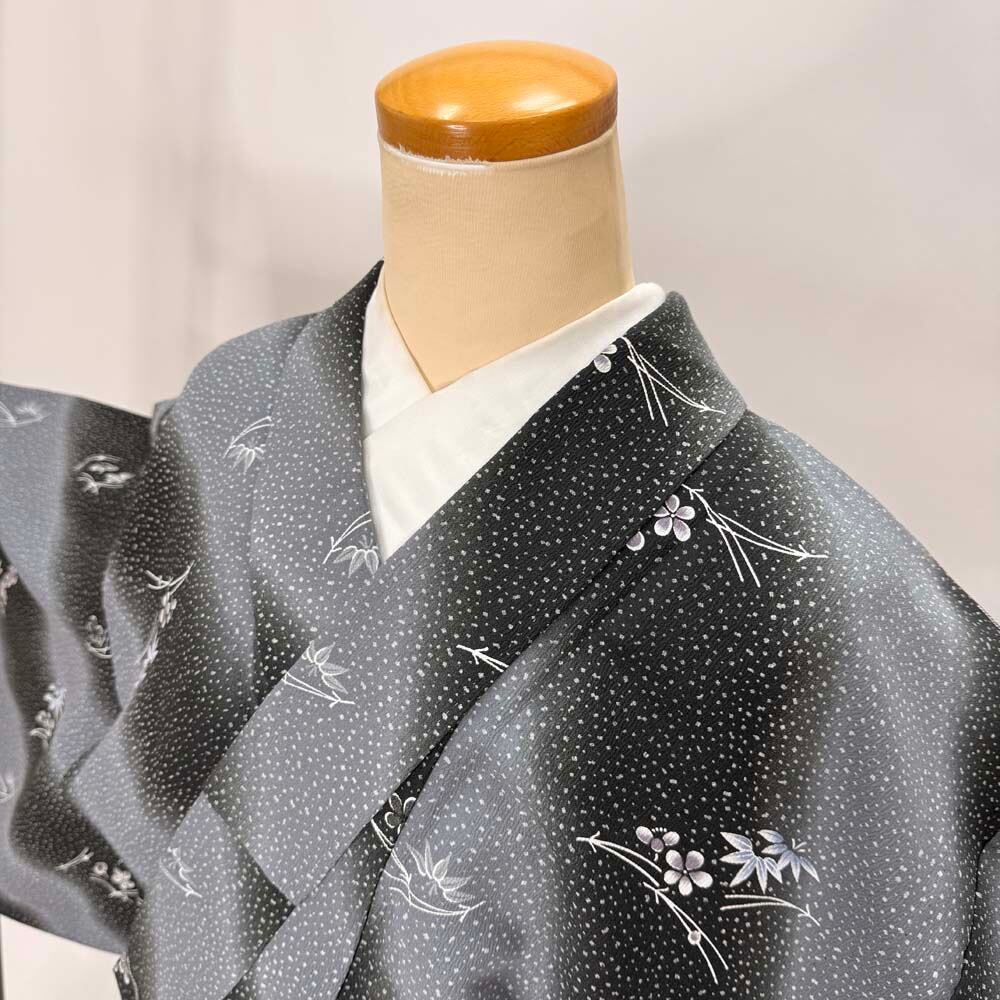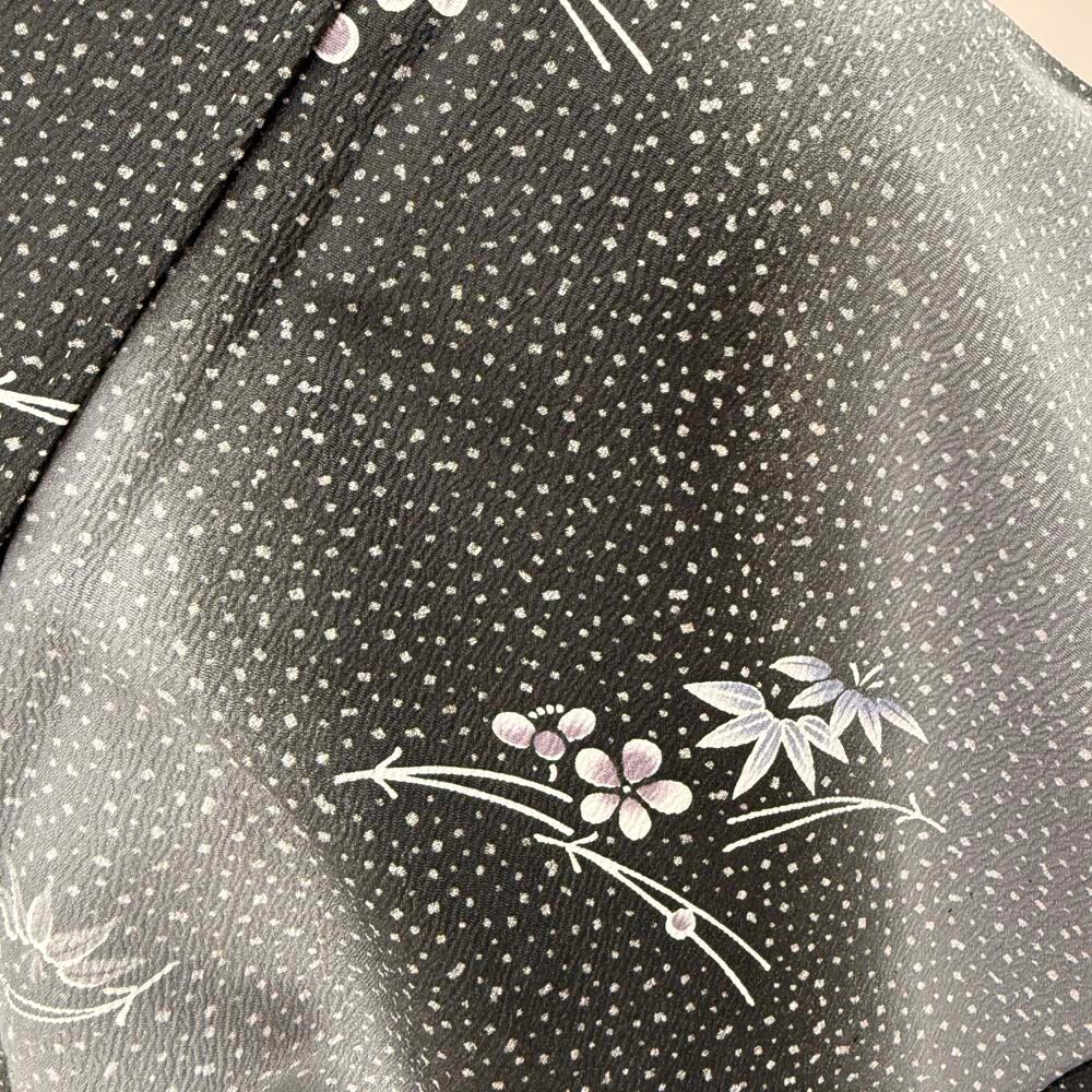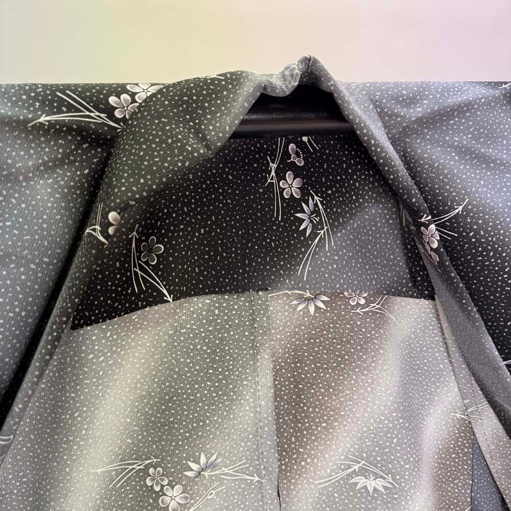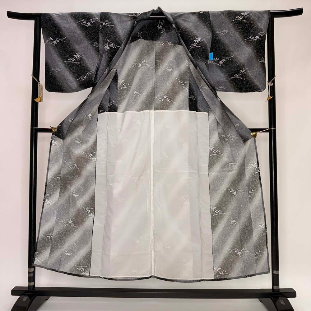 小紋 単衣 洗える着物 裄63.5cm 身丈150cm 黒 グレー 花柄 お洒落着 普段着 ポリエステル 美品 S サイズ 5261