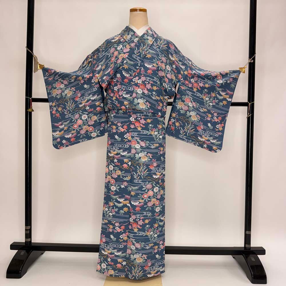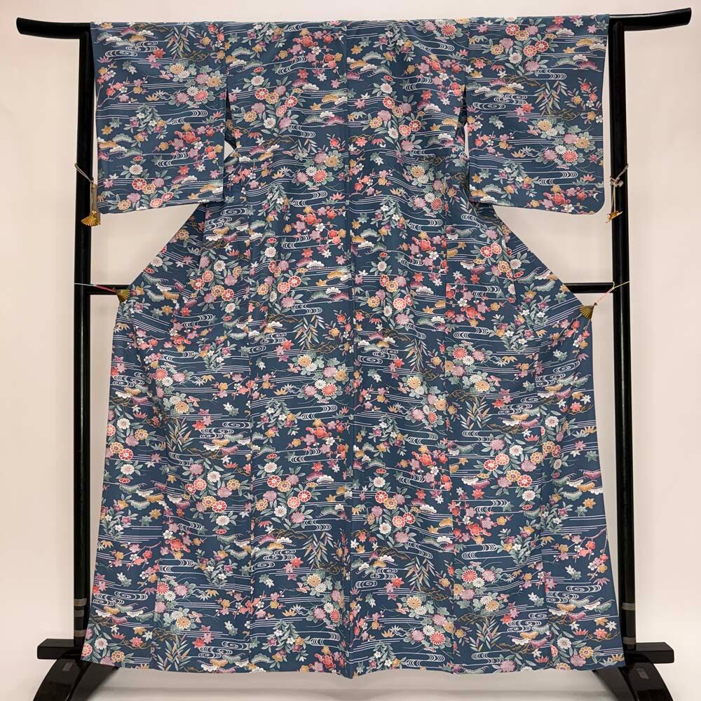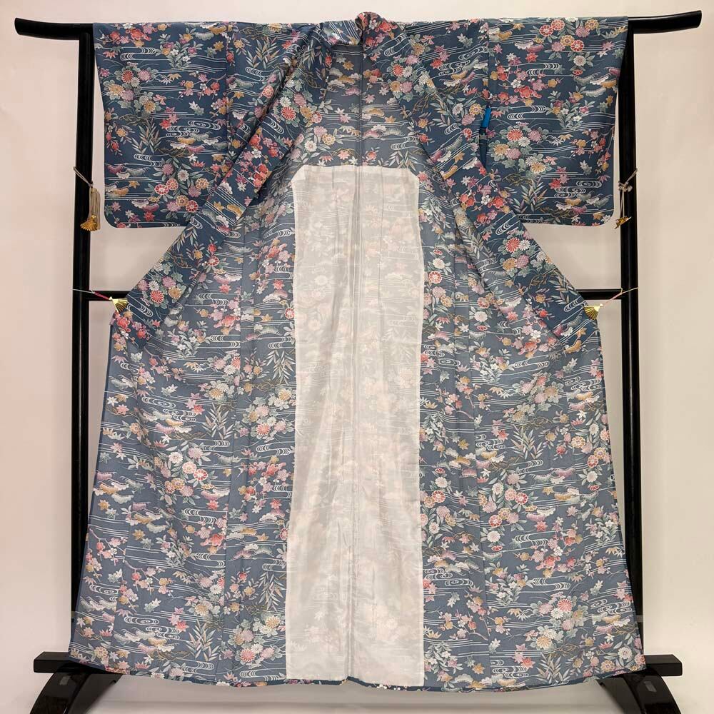 小紋 単衣 洗える着物 裄64.5cm 身丈162.5cm 青 グレー 花柄 お洒落着 普段着 ポリエステル 美品 M サイズ 5266